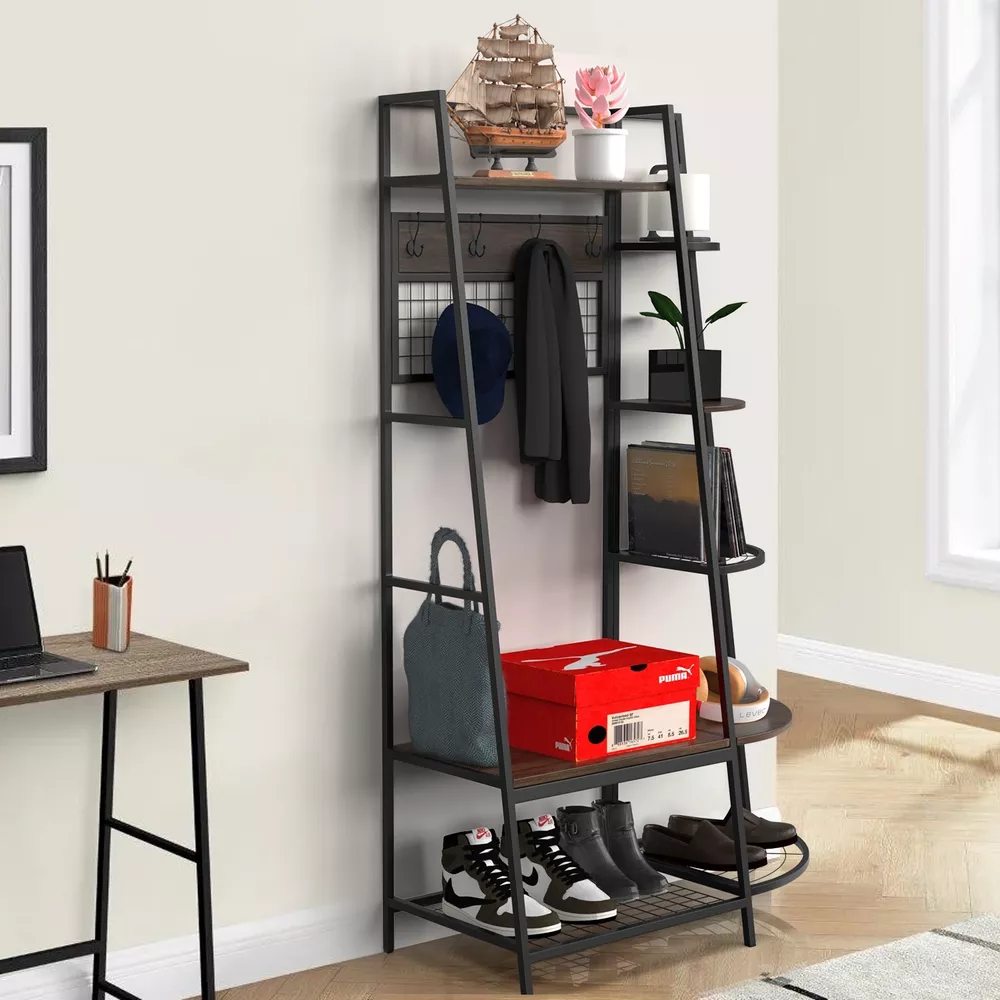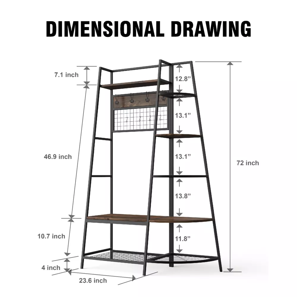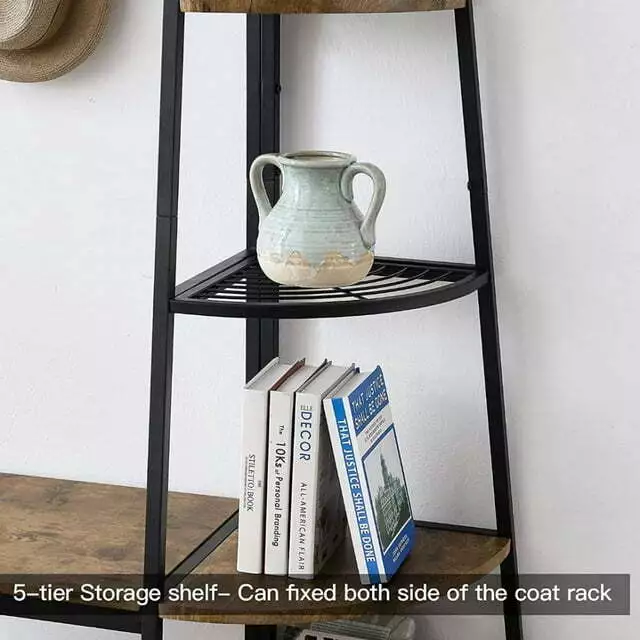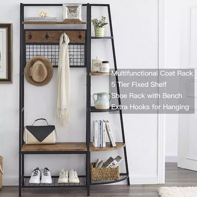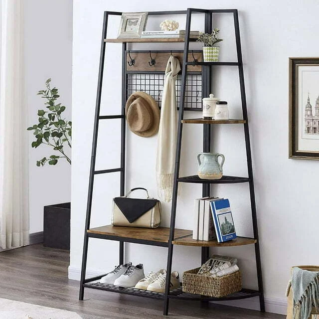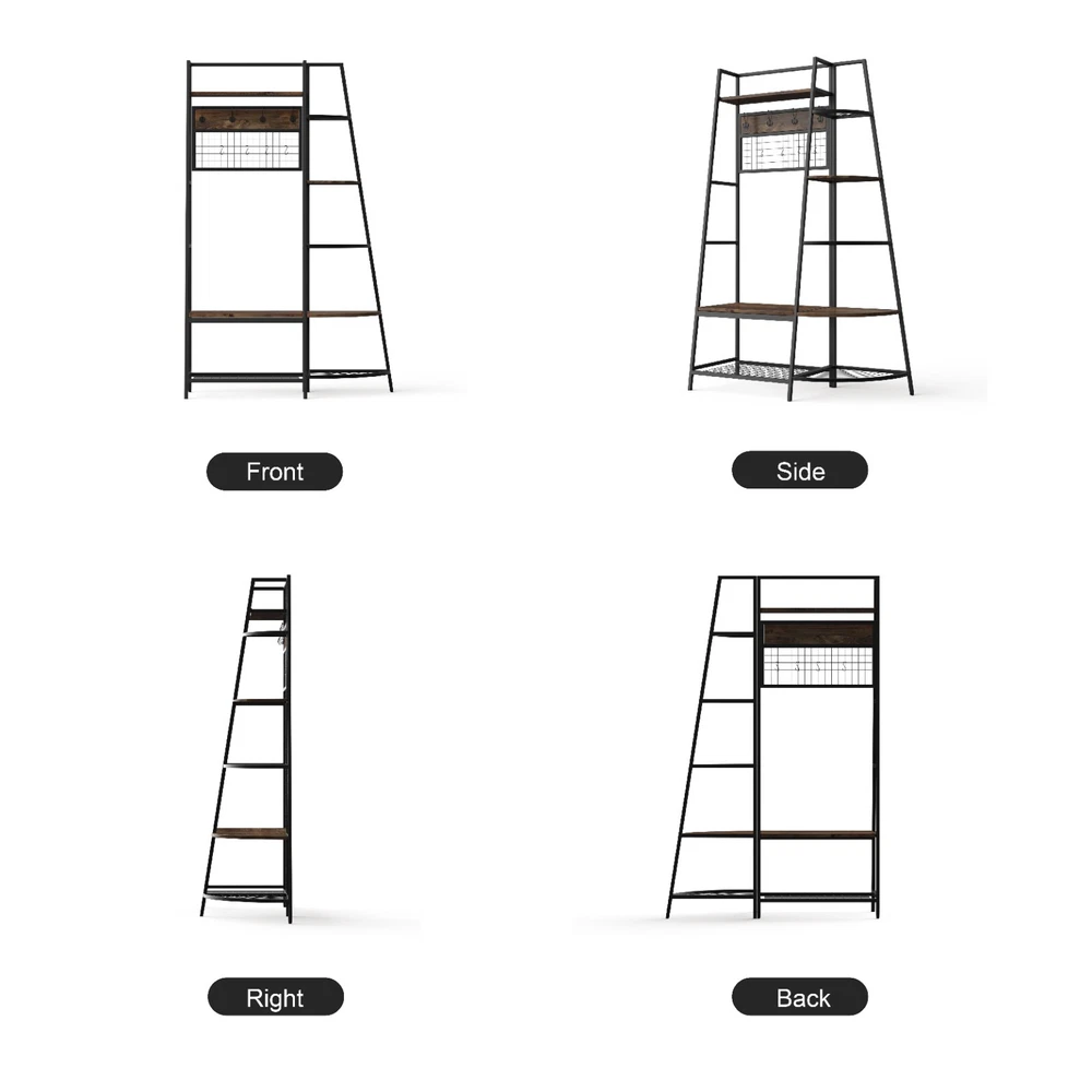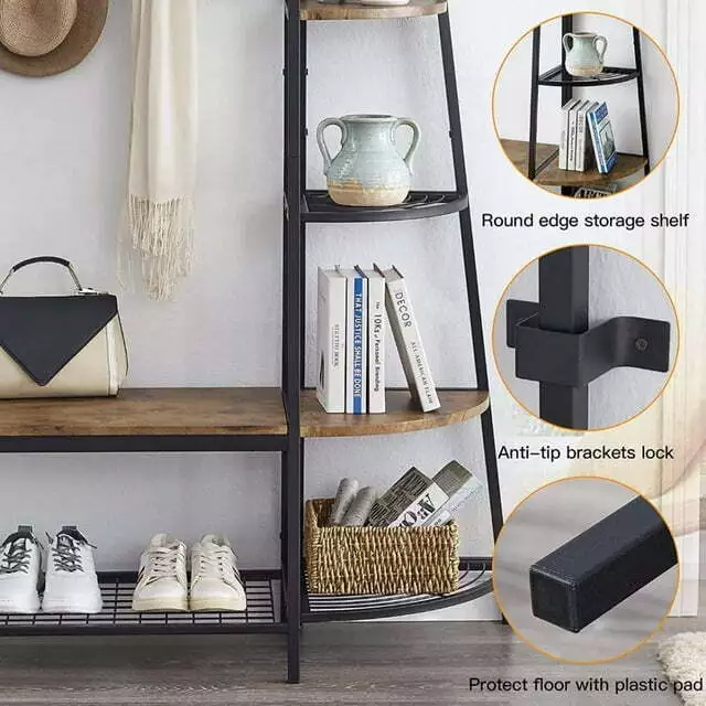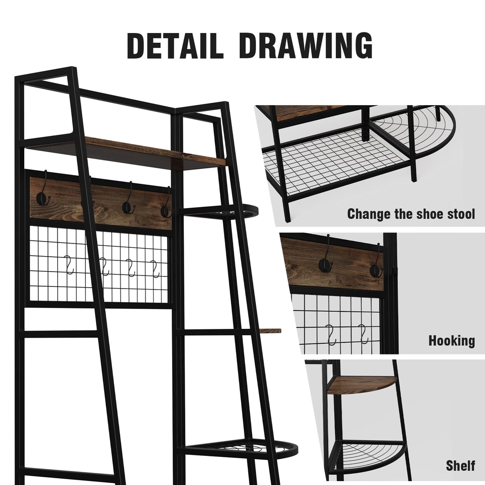 5-Tiers Ladder Storage Shelves, Freestanding Closet Organizer Clothes Rack Product details For a clothing rack that with the aesthetics of a decor piece, check out our Retro Entryway Clothes Rack. This was our favorite overall rack, boasting a natural, minimalist A-frame design made of metal that looks charming as an entry-way coat rack, bedroom clothing storage, or a decorative display for plants, books, etc. We provide various garment arrangement options and features 7 surprisingly stiff and sturdy wood shelving racks,grid area with 5 S-shaped hooks.Complete with a bench to sit on and remove shoes, this hall tree with bench has a bottom shelf which can hold multiple pairs of shoes or boots. Assembly is comparatively simple with this model. Product Specifications: Product Size: (LxWxH)40 x 16 x 72 inch/Weight:40lb Package Size: (LxWxH)41 x 18.5 x 9.5 inch Color:Brown Feature: Modern Aesthetics Design: Inspired by the popular industrial trend of modern furniture, this tree-like coat rack is not only a functional storage unit, but also rich in visual appeal. Five coat hooks, a grid area with lots of S hooks, and a bench to take off your shoes, all these useful features, plus a ladder-style bookshelf for displaying some ornaments and interiors plant. Versatility of Use: This entry coat rack with display area will be an attractive storage system in your home. The trapezoidal bookshelf can be used as extra storage for blankets, books and DVDs, or to display your favorite collectibles and photo frames. On top of this sturdy shoe cabinet, you'll find an extra shelf for home decor or indoor plants. Shelves can hold up to 40 lbs. and hooks can hold up to 10 lbs. Premium Frame Materials: Designed with a bit of modern industrial style, the black powder coated frame provides stability for this entryway hall tree. The long lasting manufactured wood is easy to assemble, and keeping this coat rack with shoe storage clean is as simple as wiping the frame and wood with a soft cloth. Multifunctional Areas: Comes with an 18" high bench for sitting and taking off your shoes for great convenience, and a shelf at the bottom of the bench to hold multiple pairs of shoes or boots. The grid area above the bench has S-shaped hooks for hanging smaller items like scarves and hats. Five black metal double coat hooks are sturdy enough to hold winter coats, backpacks and purses. The maximum bench seat weight is 220 lbs. Easy to Assemble: This Entryway Clothing Rack features compact and portable design. Assembly is easy with the help of the clear assembly manual. Easy enough to put it together in just under 35 minutes with just a screwdriver. So it is an ideal gift for who is not good at hands-on things. Friendly Service:We implement strict quality control and excellent after-sale service. Any defects caused by delivery or quality, we do provide reasonable compensation, and commit to reply all customer question within 48 hrs. Payment Delivery details Terms of sales About us Contact us Payment We only accept several paymeny ways as follow: Delivery details Your goods will be shipped within our handling time after your full payment. This excludes these locations: Alaska, Hawaii and Puerto Rico.APO/FPO’s are definitely excluded. Terms of sales Return: We accept return within 30 days,but we are not responsible for human damage.The return shipping cost is the buyer's responsibilities and try to keep it in your original package. About us We are selling all kind of ceiling fan,crystal chandelier,pendant lights in high quality with best discounted price. Our goal is providing all our customers 100% satisfaction and best customer service. Contact us If you have any questions please contact us through "Ask seller a question" link. We will respond within 2 business day or less.