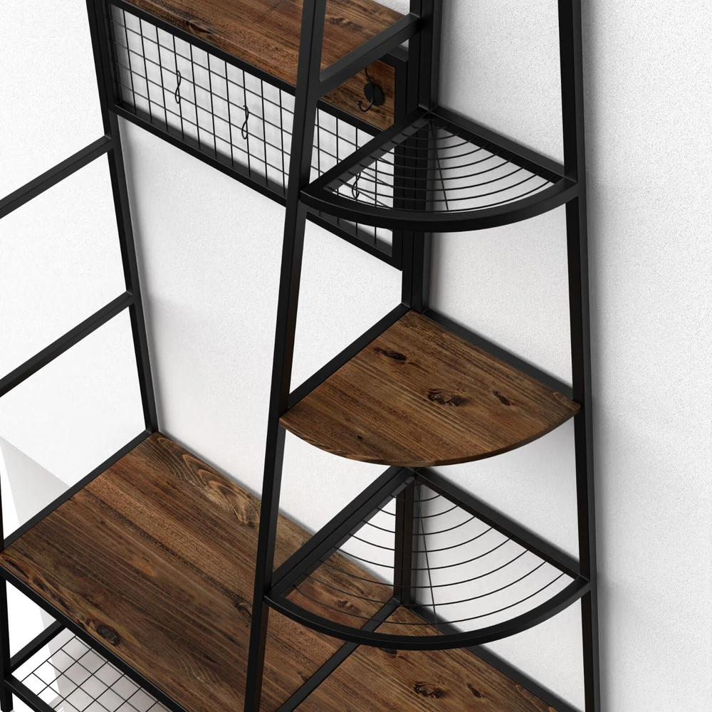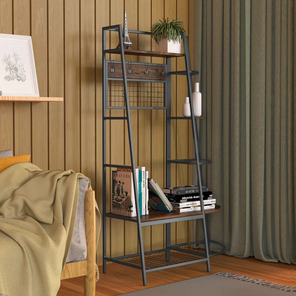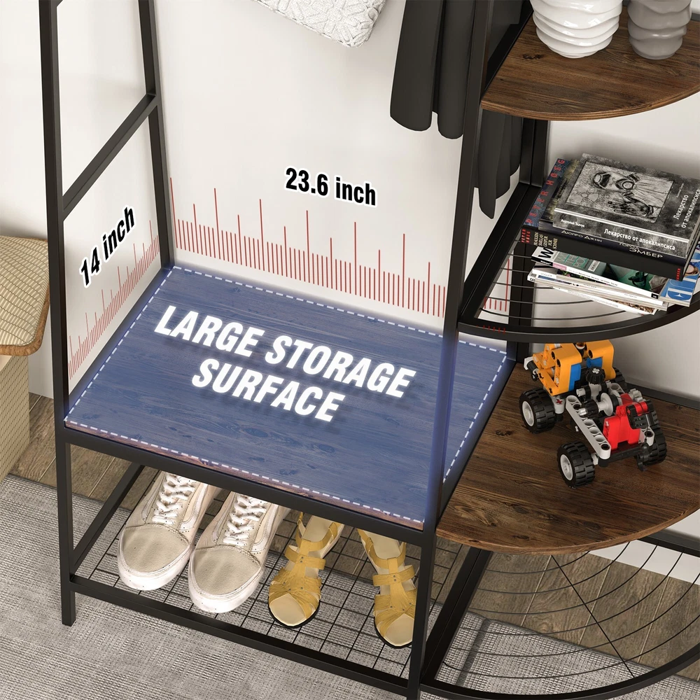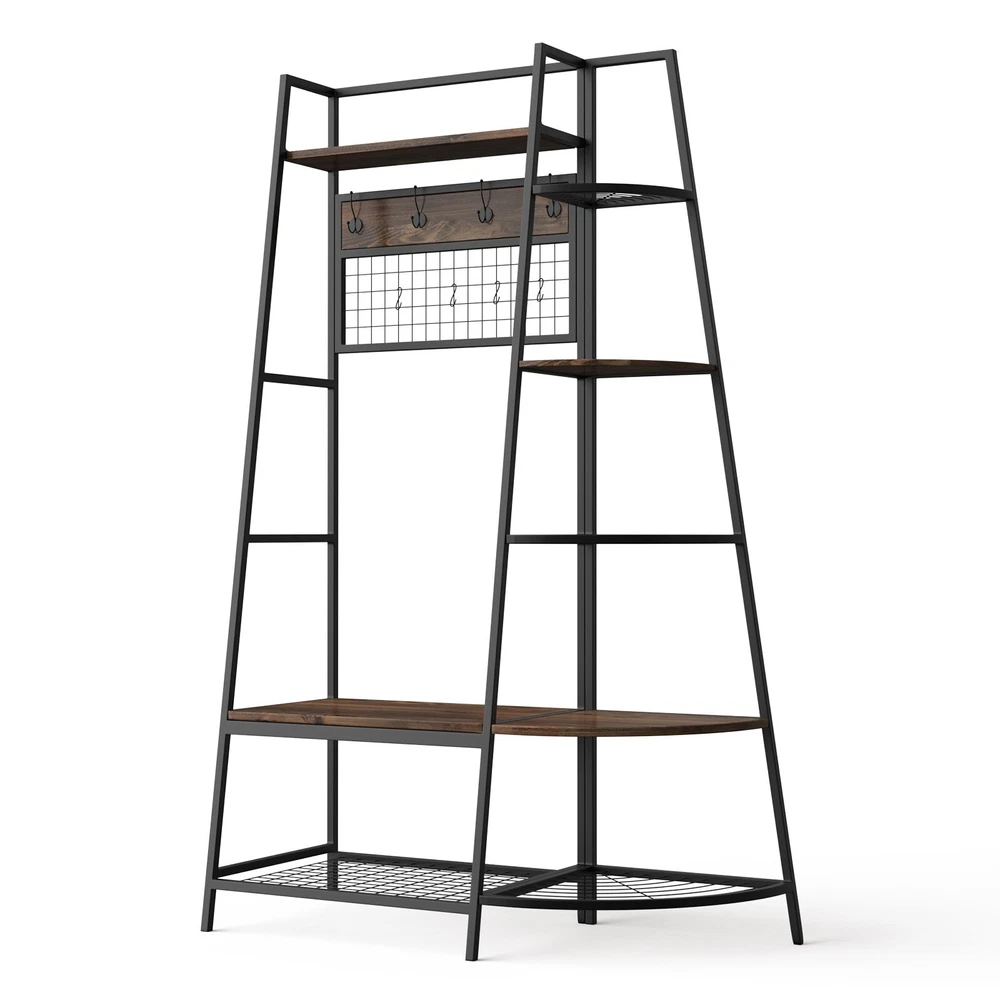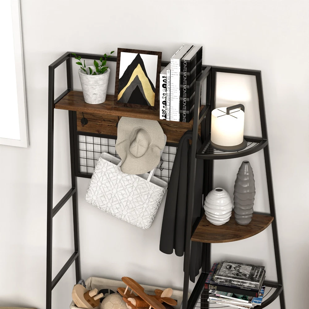 5-Tiers Ladder Storage Shelves, Freestanding Closet Organizer Clothes Rack Product details For a clothing rack that with the aesthetics of a decor piece, check out our Retro Entryway Clothes Rack. This was our favorite overall rack, boasting a natural, minimalist A-frame design made of metal that looks charming as an entry-way coat rack, bedroom clothing storage, or a decorative display for plants, books, etc. We provide various garment arrangement options and features 7 surprisingly stiff and sturdy wood shelving racks,grid area with 5 S-shaped hooks.Complete with a bench to sit on and remove shoes, this hall tree with bench has a bottom shelf which can hold multiple pairs of shoes or boots. Assembly is comparatively simple with this model. Product Specifications: Product Size: (LxWxH)40 x 16 x 72 inch/Weight:40lb Package Size: (LxWxH)41 x 18.5 x 9.5 inch Color:Brown Feature: Modern Aesthetics Design: Inspired by the popular industrial trend of modern furniture, this tree-like coat rack is not only a functional storage unit, but also rich in visual appeal. Five coat hooks, a grid area with lots of S hooks, and a bench to take off your shoes, all these useful features, plus a ladder-style bookshelf for displaying some ornaments and interiors plant. Versatility of Use: This entry coat rack with display area will be an attractive storage system in your home. The trapezoidal bookshelf can be used as extra storage for blankets, books and DVDs, or to display your favorite collectibles and photo frames. On top of this sturdy shoe cabinet, you'll find an extra shelf for home decor or indoor plants. Shelves can hold up to 40 lbs. and hooks can hold up to 10 lbs. Premium Frame Materials: Designed with a bit of modern industrial style, the black powder coated frame provides stability for this entryway hall tree. The long lasting manufactured wood is easy to assemble, and keeping this coat rack with shoe storage clean is as simple as wiping the frame and wood with a soft cloth. Multifunctional Areas: Comes with an 18" high bench for sitting and taking off your shoes for great convenience, and a shelf at the bottom of the bench to hold multiple pairs of shoes or boots. The grid area above the bench has S-shaped hooks for hanging smaller items like scarves and hats. Five black metal double coat hooks are sturdy enough to hold winter coats, backpacks and purses. The maximum bench seat weight is 220 lbs. Easy to Assemble: This Entryway Clothing Rack features compact and portable design. Assembly is easy with the help of the clear assembly manual. Easy enough to put it together in just under 35 minutes with just a screwdriver. So it is an ideal gift for who is not good at hands-on things. Friendly Service:We implement strict quality control and excellent after-sale service. Any defects caused by delivery or quality, we do provide reasonable compensation, and commit to reply all customer question within 48 hrs. Payment Delivery details Terms of sales About us Contact us Payment We only accept several paymeny ways as follow: Delivery details Your goods will be shipped within our handling time after your full payment. This excludes these locations: Alaska, Hawaii and Puerto Rico.APO/FPO’s are definitely excluded. Terms of sales Return: We accept return within 30 days,but we are not responsible for human damage.The return shipping cost is the buyer's responsibilities and try to keep it in your original package. About us We are selling all kind of ceiling fan,crystal chandelier,pendant lights in high quality with best discounted price. Our goal is providing all our customers 100% satisfaction and best customer service. Contact us If you have any questions please contact us through "Ask seller a question" link. We will respond within 2 business day or less.