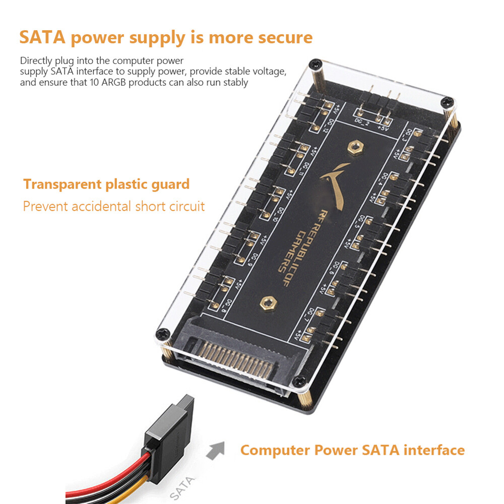 5V 3 pin ARGB RGBW Cable for ASUS AURA SYNC RGB 10 Hub Splitter SATA Power Extension Cable Adapter LED Strip Light PC RGB Fan Cooler Feature: 1. Support for ASUS, for MSI, for GIGABYTE, for ASRock motherboards (5V/3Pin D-RGB light control interface) to be controlled by the motherboard, and the lights can be synchronized with other D-RGB products. 2. Effectively manage wires. Five sets of fan jacks on the left and right for easy installation, creating a neat and tidy computer space. 3. With 52CM motherboard cable. The line length is 52cm, players no longer have to worry about short lines 4. The hub is a 5V 3PIN SATA/large 4D power port version. Specifically, it depends on the interface on the motherboard and the number of pins of the device interface you are using. You can purchase it accordingly. You cannot connect a three-pin four-pin device or a four-pin hub to a three-pin lighting device. 5. Multi-interface, easy installation. Support up to 11 ARGB interfaces, bid farewell to the trouble of insufficient interfaces. 6. Widely compatible. Standard 5V 3-pin interface, compatible with various brands of motherboards, universal standard 5V 3-pin ARGB interface, no need to worry about compatibility issues. 7. Comes with adhesive, easy to install. The paste is stable, double-sided adhesive is fixed, the installation is very convenient, and the foam pad on the back can also play the role of insulation protection. Specification: Category: RGB Fan Hub Number of fan ports: 10 Power interface: SATA interface Interface: 5V/3PIN Interface cable length: about 52cm/20.47 inch Process: gold plated Fixing type: adhesive backing Material type: 3mm acrylic sheet Product size: about 13*9*2cm/5.12*3.54*0.79 inch Product packaging: electrostatic bag Product gross weight: about 50g Note: This product is not an adapter, this is just a hub, it can only be used when the mainboard interface is not enough, the device interface without the adapter function must be the same as the mainboard with the same number of interface pins before it can be used. Due to the different monitor and light effect, the actual color of the item might be slightly different from the color showed on the pictures. Thank you! Please allow 1-2cm measuring deviation due to manual measurement.