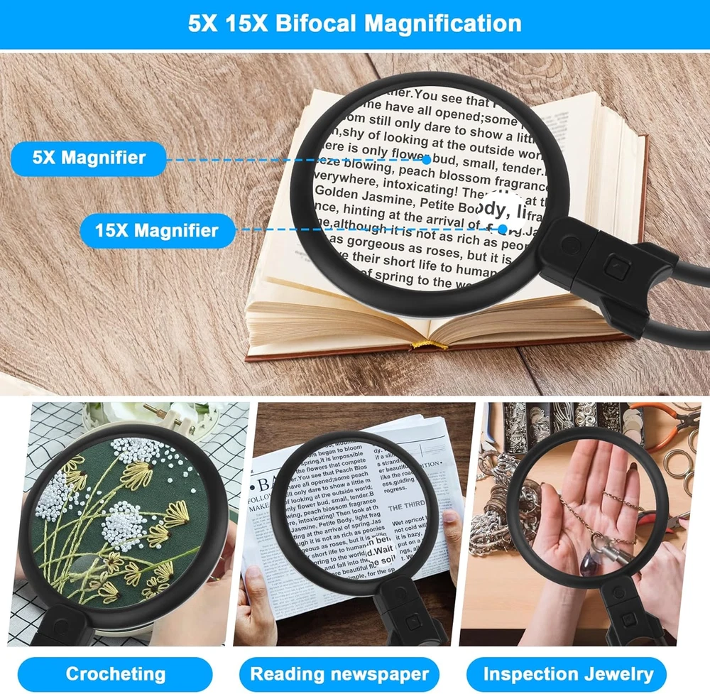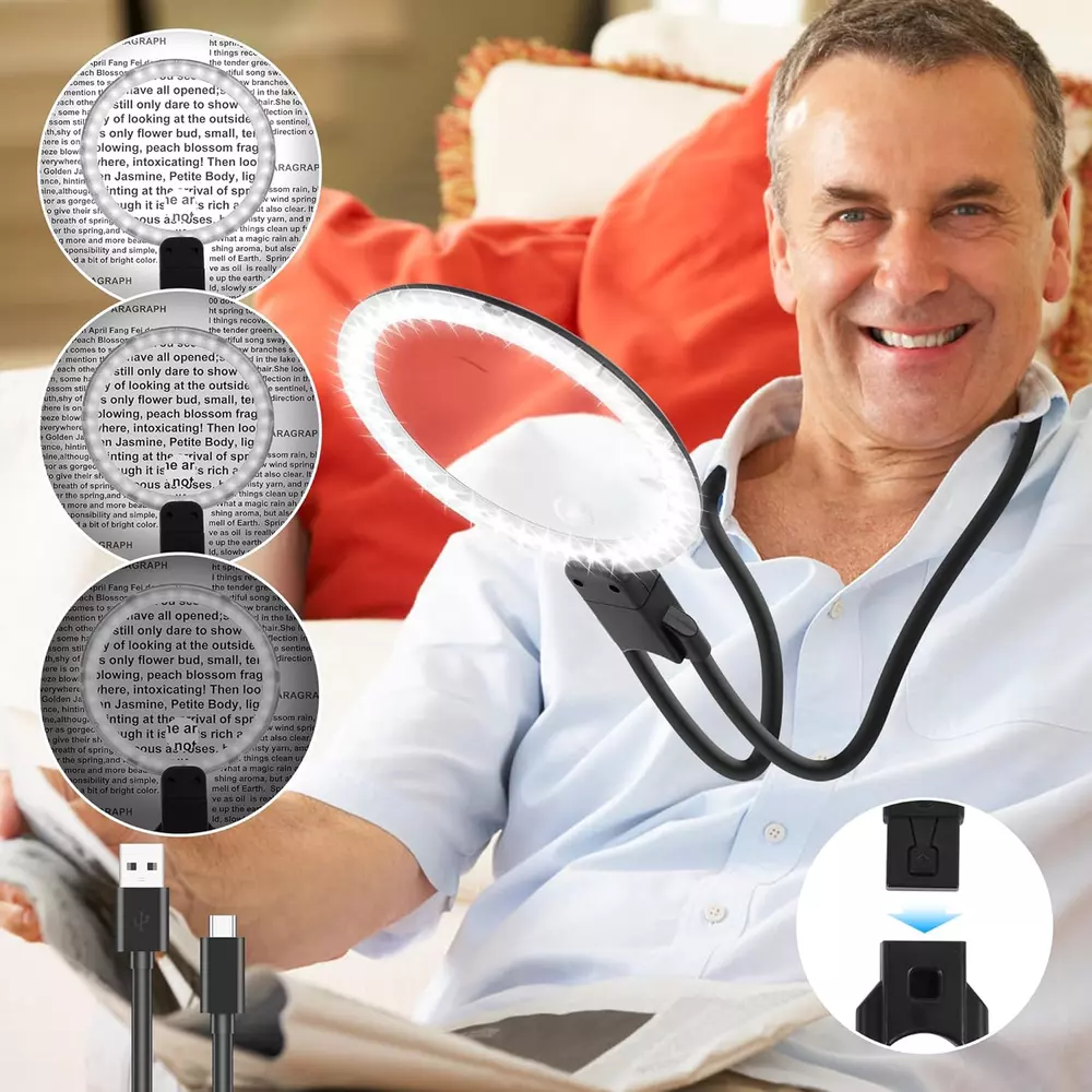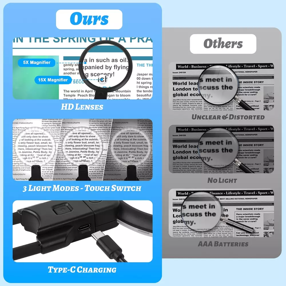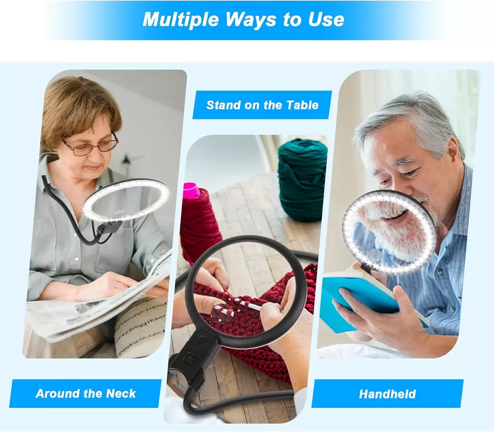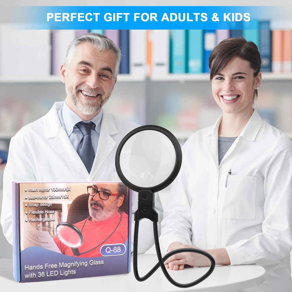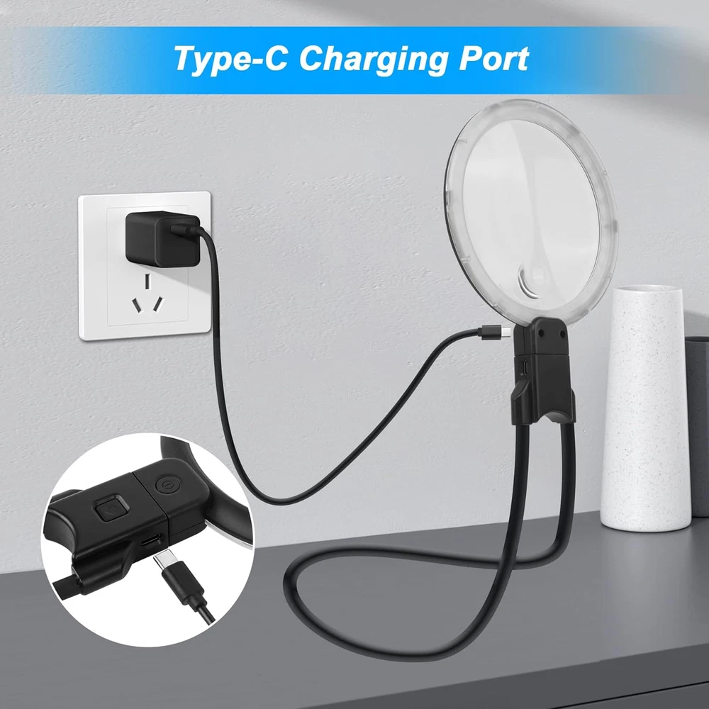 Super Bright 36 LED Lights: This hands-free magnifier is equipped with 36 LED lights, 3 levels of brightness can be adjusted at will, ensuring bright and uniform lighting in various light conditions, allowing you to easily read and view small text and patterns without causing eye fatigue Type-C Rechargeable: The lighted magnifying glass is equipped with a Type-C charging port, ensuring fast charging and strong compatibility; It can provide 3-10 hours of continuous lighting and can be fully charged in just 2 hours 5X 15X Magnifiers: This magnifying glass for close work with 2 magnifications, 5X/130mm for the main mirror and 15X/25mm for the sub-mirror, which can satisfy the needs of both wide view and detailed view; The gooseneck can be freely bent or rotated to adjust the angle to meet your requirements Snap Design: The snap-fit design at the junction of the frame and gooseneck enhances stability and makes adjustments easier, reducing looseness and wobbling; Compared to traditional clamp designs, it minimizes wear and tear; After use, it’s easier to fold and store, saving space High Quality Materials: This neck-hanging magnifying glass features a PMMA lens and an ABS/silicone gooseneck, weighing just 0.35 kg; PMMA provides higher light transmission than PVC, offering clearer magnification. It's shatter-resistant, durable, and less prone to scratches, ensuring long-lasting use 3-in-1 Magnifying Glass: The reading magnifier for books can be worn around the neck, or it can be firmly placed on a table or used as a handheld magnifying glass; this full page magnifier can meet your needs for close-up work such as reading, sewing, crafts, checking jewelry and coins in daily life and work Product Description 1 36 LED Lights 2 Rechargeable, Snap Design 3 2 Magnification Levels Ergonomic Gooseneck Design The gooseneck can be tilted and twisted to any direction and angle you are comfortable with. the around neck hanging magnifying glass can free your hands, say goodbye to arm pain and improve comfort. Rechargeable Lightweight Magnifier The total weight of this full page magnifier is 0.35 kg, with a frame and lens of 0.18 kg and a gooseneck of only 0.17 kg. This magnifying glass with light is perfect for seniors and will not be uncomfortable to wear for long periods of time! Product Details Snap Design Provides better stability, reducing shaking for clearer observation. It also allows for easy disassembly, making cleaning and maintenance convenient. Recharged via Type-C USB powered, no need to replace batteries, convenient to use, reduces long-term maintenance costs, suitable for outdoor or travel use. Sensitive Touch Switch 3 levels of adjustable brightness, the touch switch is easy to operate and can easily turn the light on or off. Flexible Hose This gooseneck magnifier weighs just 350g. The flexible gooseneck adjusts easily to any angle and can be worn around the neck or placed on a table. This hands free magnifying glass can be used in 3 ways: as a neck magnifying glass with light, a handheld magnifying glass for reading, or a magnifying glass with stand. This rechargeable magnifier for low vision seniors can be used for reading, newspapers, jewelry, crafts, jewelry coin inspection We are committed to providing better quality magnifying glass products for low vision reading enthusiasts or the elderly. Molebe's magnifying glass are completely reliable and meet your life needs, worthy of your trust and confidence.