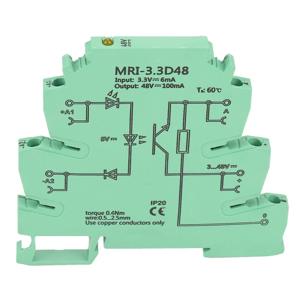 Feature: 1. Yellow LED indication, clear port 2. The width is only 6.2mm,which saves 60% of installation space 3. Plug-in bridging type.Convenient DIN rail installation 4. Internal input/output polarity protection circuit.The electrical isolation is 2.5kVrms 5. Operational frequency can to 300Hz.No-abrasion switch output :3-48V DC/100mA Specification: Features: Yellow LED indication, clear port The width is only 6.2mm, which saves 60% of installation space Plug-in bridging type.Convenient DIN rail installation Operational frequency can to 300Hz.No-abrasion switch output :3-48V DC/100mA Internal input/output polarity protection circuit.The electrical isolation is 2.5kVrms Specification: Model:MRI-230A48 Input Voltage Range:3.3VDC±10% Input Current: 6mA Output Voltage Range: 3-48VDC Transfer Frequency:300Hz Switch Electrical Level: "1" signal (H) ≥80,"0" signal (L) ≤40% .Sustained current: 100mA . Voltage Drop: ≤0.9V Input/Output Isolation Voltage: 2.5kV(50Hz,1min) Ambient Temperature: -20℃~60℃ Operative Standard: IEC60664,EN50178, IEC62103 Applicable Wire: (Rigidity)0.2-2.5mm2,(Flexibility)0.2-2.5mm2,(AWG)24-14 Weight: Approx.3 1 g/1.1oz Package list: 1 x Optocoupler Isolating PLC Relay 1. Our listing price includes the value of goods,packaging cost,and export taxes,not including international duties. 2. duties,taxes,and charges are not included in the item price or shipping fee. 3. T he duties are buyers' responsibility .Please check with your country's customs office determine what these additional costs will be prior to your purchase. 4. All disputes arising from the duties will be submitted to ebay for solution. 1. Any questions, pls. contact us via ebay message or email us. We will reply your message within 48 hours. If you do not receive our reply within 48 hours, pls. post a message again beuse sometimes our message system may block some emails. 2. If you are satisfied with our service, pls. kindly leave us a positive feedback and give us the Detailed Seller Rating with all " 5 " in very area 3. Our aim is to provide Level Customer Service, your recognition will encourage us greatly and serve you better. We strive to keep all our customers satisfy. We will do our up most to exceed your expectations in customer service, communition and dispatching of your orders.