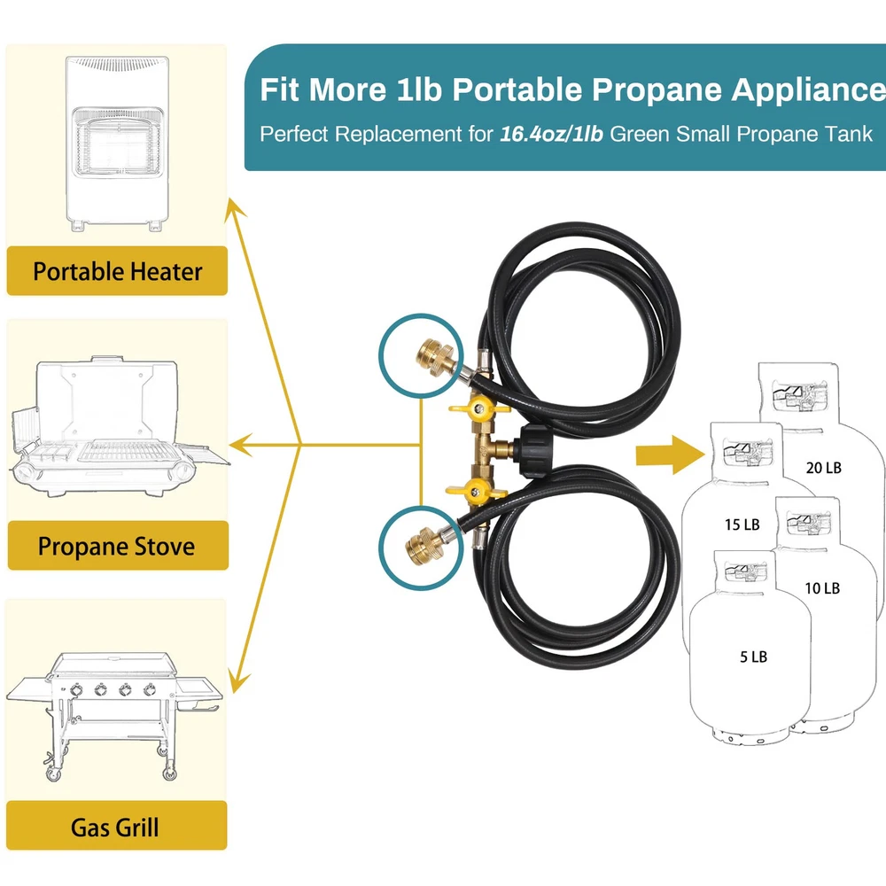 WIDELY APPLICATION: The propane 2 way Y splitter hose is compatible with all equipment with QCC1/Type 1 connection and 1 lb to 20 lb propane tank, suitable for camping stoves, tabletop grills, tailgates, outdoor heaters, coleman camping stove, weber Q grill and more 1-lb portable propane equipment. EASY & CONVENIENT: This propane two way splitter hose is a perfect replacement for the 16.4oz/1 pound green small tank, and it can be directly connected to a 1-pound portable propane device without an additional regulator. UPGRADED DESIGN: The 2 way design allows you to connect two appliance easily at the same time to the propane tank by hand without any tools. Equipped with a control valve on each way of the hose, convenient to control the flow. SUPERIOR QUALITY: Both adapters are made of solid brass, and the hose is made of high quality rubber, which allows a long-lasting life of the product. 350PSI rated propane tank outlet pressure, and the over flow&heating protection design can ensure safety. EXCELLENT SERVICE: We are confident with our products, so we provide one year Service! If you have any questions, Please feel free to email us. We will give you a satisfactory answer within 12 hours.