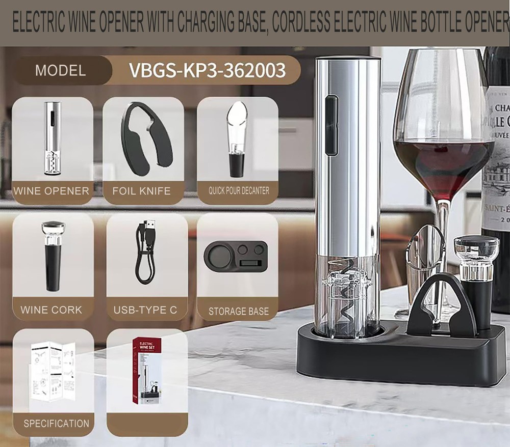 enchargable Large Capacity Battery - Perfect for various occasions, including family gatherings, travel, and large parties, it eliminates the need for frequent recharging and offers long-lasting convenience.This electric wine opener features a large-capacity battery, allowing you to open up to 90 bottles of wine on a single charge Efficient and Convenient - Easily remove corks in just 5 seconds, ensuring each operation is smooth and undamaged. With just a press of a button, you can quickly and effortlessly open bottles, making it ideal even for those with arthritis to enjoy the ease of opening wine Exceptional Performance - Crafted with a high-quality metal exterior, this electric wine bottle opener is both durable and stylish. Ergonomically designed for comfort, it enhances the overall user experience. The built-in LED light illuminates the bottle’s neck during operation, ensuring precise use in any lighting condition. The quiet operation minimizes noise, allowing you to open wine in a serene environment without disturbing the party atmosphere Elegant All-in-One Set - This wine accessories set includes a foil cutter, a 2-in-1 aerator and pourer, which effectively infuses oxygen into the wine, enhancing its flavor while preventing drips and controlling the pour rate. Cork screw wine bottle opener also comes with two vacuum stoppers that preserve wine freshness for up to 7 days, reducing waste and ensuring every glass of wine is enjoyed to the fullest Very Perfect Gift for Wine Lovers - This electric rechargeable corkscrew wine opener electric is the ideal choice for any wine enthusiast, making it a perfect gift for holidays, birthdays, party or special occasions. Whether as a white elephant gift for adults, Christmas gifts for men or women, presents for mom or dad, or even a new home gift , this automatic wine opener set will elevate their wine experience and serve as a practical and unique present