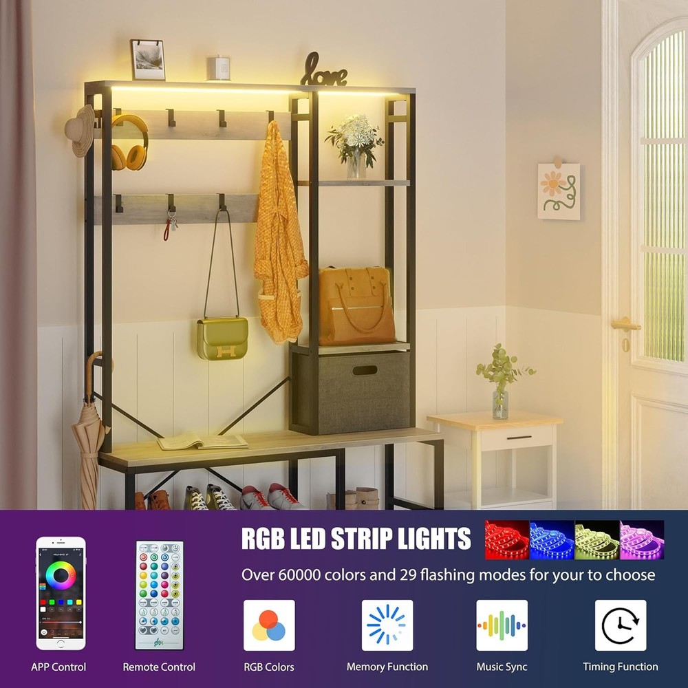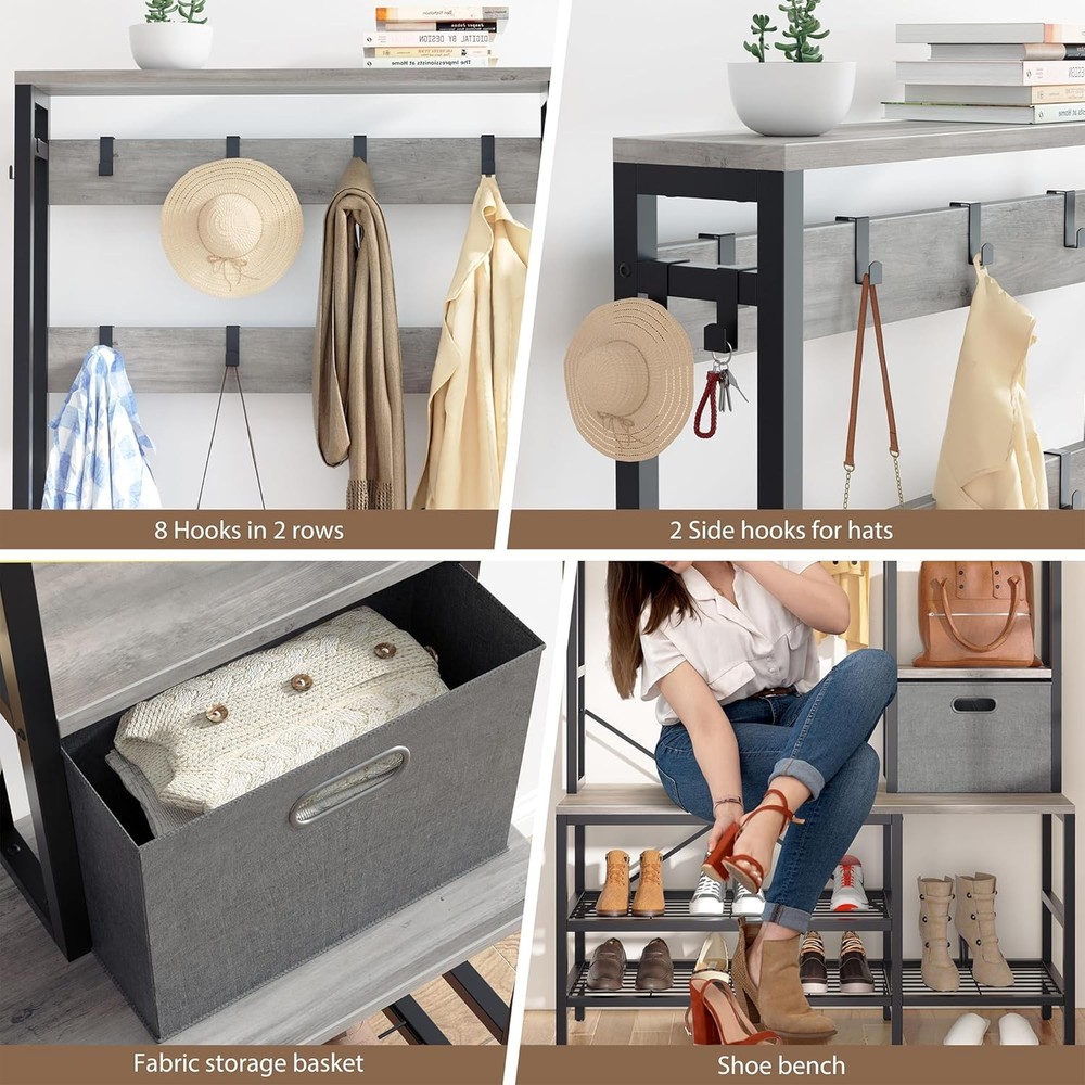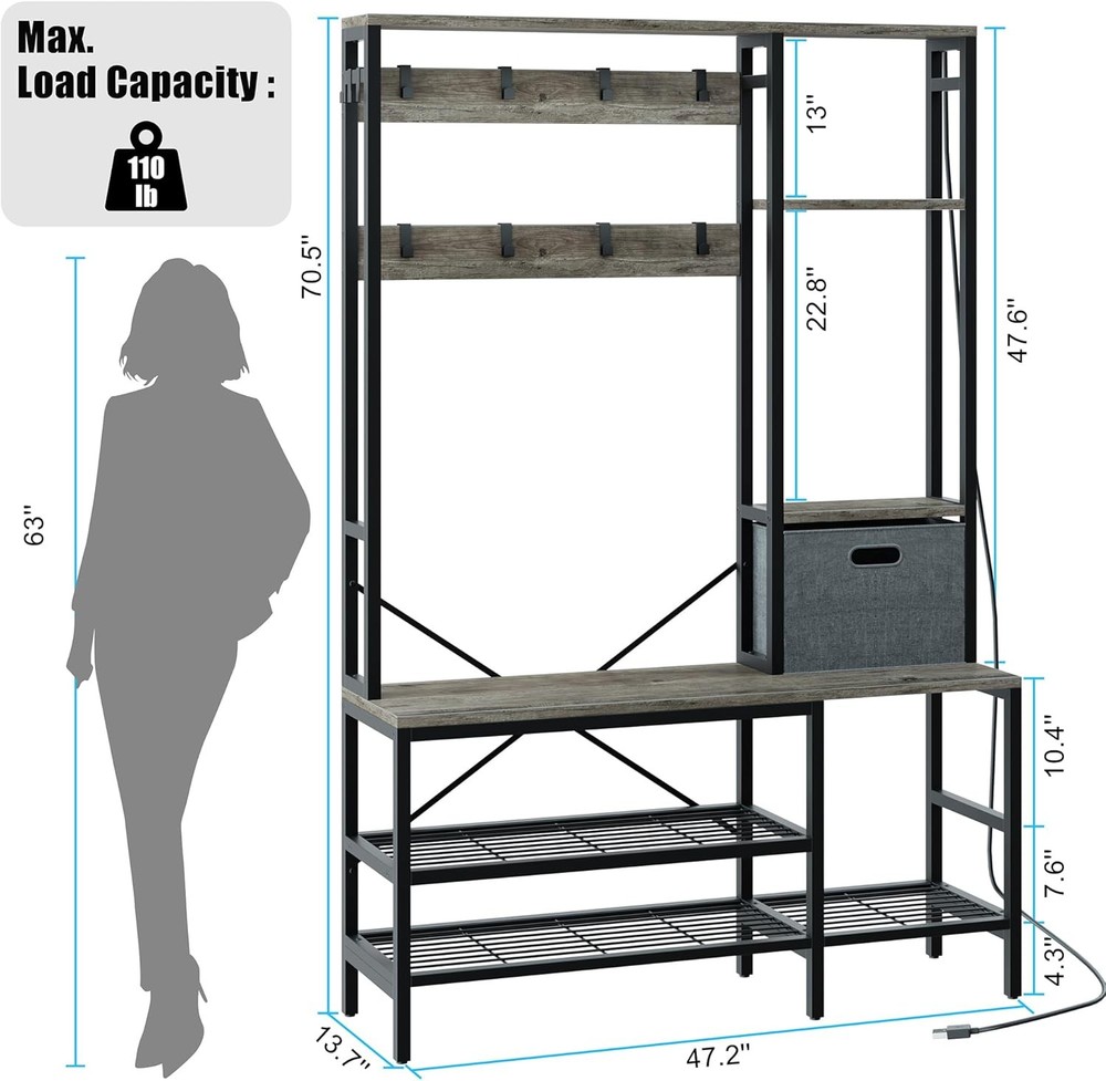 Product Description About this item Large Storage Space: Large shoe storage space. Different heights of Shoe bench are designed for storing high heels, boots and sports shoes. There is also a side rack and top storage rack, providing spacious space to display your home decor, books, potted plants or other decorations. Dimensions: 47.2’’L x 13.7’’W x 70.5’’ H. High-Quality: Made of high quality MDF and heavy-duty powder-coated steel to guarantee durability and stability. Multi-functional hall tree can be mounted on the wall to ensure safety. The "X" crossbar enhances the stability of the whole coat rack. Multifunctional Hall Tree: The hall tree coat rack has 3 shoe storage shelves, 1 fabric storage basket, 1 bench and 10 hooks to give you a space-saving entryway storage solution. You can sit comfortably on the bench while putting on your shoes, and the 3 shelves below can neatly hold shoes out of the way. Modern Design: With industrial design elements and stylish. 8 hooks in 2 rows and the side hooks are perfect for hanging coats, bags, hats, scarves, dog straps, keys, etc. It is perfect for entryways, hallways, foyers, bedrooms, living rooms. Easy to Assemble & After-Sale: This hall tree can be easily assembled with detailed illustrations.If there are any questions about the tracking number or the hall tree, please feel free to contact us, we will respond to you in 24 hours.CONTACT US: Login to your amazon account > choose "Your orders"> find the order ID > click "Contact seller". On Aug 6, 2025 at 19:36:29 PDT, seller added the following information:
