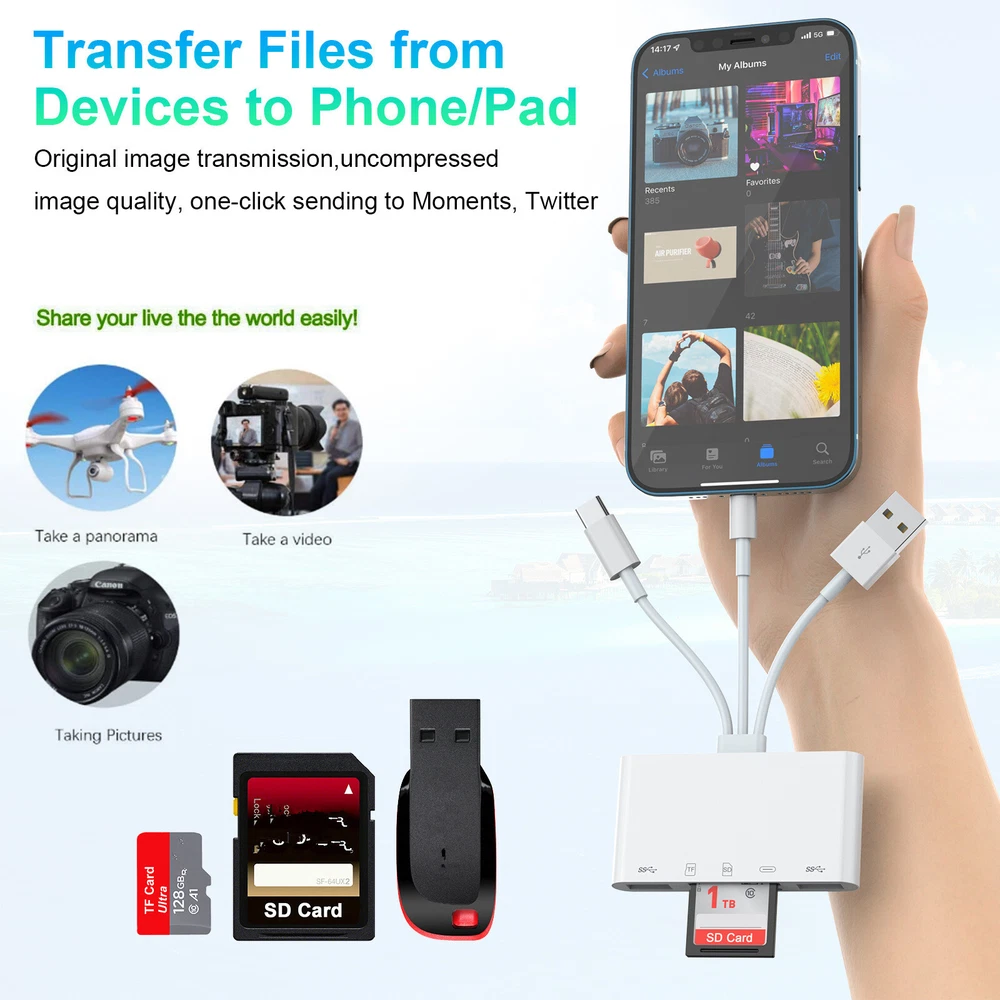 SAFE & SECURE SHOPPING 100% SATISFACTION GUARANTEED FAST SHIPPING Store Categories Store Categories You may also like 5-in-1 Memory Card Reader USB OTG Adapter and SD Card Reader for iPhone/iPad Product Description Features: Plug and Play: memory card reader has various interfaces, no WIFI, network or drivers required, super easy to use. usb / usb c(type c) / for IOS Connector/ sd card slot / micro sd card slot and for iPhone charging port for iPhone/for iPad, easily transfer photo video and file information. Charging for iPhone/for iPad: Unlike other sd card adapters, our upgraded sd card reader has a charging port for iPhone/for iPad. Charging and reading can be carried out at the same time, so you no longer have to worry about the phone running out of power during the transfer process. Fast Transfer Speed: The high-speed two-way transfer from SD card reader can save you a lot of waiting time. allowing you to easily manage data between for iPhone/for iPad/ for Android / computer and other devices. Multi-function: It can connect more USB peripherals, such as camera, TV, USB flash drives, card reader, etc. You can connect your PC keyboard or mouse to your for iPhone/for iPad/PC via the USB camera adapter to Enjoy faster and easier chatting and typing while working. Wide Compatibility: The SD/TF card reader USB adapter supports standard photo formats, including JPER and RAW, as well as SD, HD video formats, and supports all for ios devices with for iOS 9.1 and above and OTG for Android phone/computer and other devices with USB port, The micro sd card reader supports up to 1TB memory cards and 512GB USB2.0 flash drives, the USB3.0 flash drives cannot exceed 128GB. Package include: 1* 5-in-1 Memory Card Reader Shipping Returns Contact Us Payment Shipping 1. Items sent from US warehouse. 2.Receiving time = Processing time + Shipping time 3. Processing Time: Around 1-2 business Days 4. Shipping Time: 3-5 business day it may have a little delay during some holiday (such as Christmas),any problem ,please feel free to contact Returns 1. 30 days warranty from the purchased date. Please contact us via email before returning the defective item. 2.Our warranty does not extended to any product that are physically damaged or that are not under normal operating conditions as result of misuse or improper installation on the buyer/user's part. 3.Return items should include the original packaging and all accessories. buyers MUST contact us for the returning address. 4.In all cases, buyers pay shipping fees at their own cost to return products for exchange or refund. We will be responsible for the postage of replacements. Refund will be made upon receipt of the returned item. Contact Us Pls contact us if you have any problems,we will try our best to solve for you Payment We accept all verified payment from eBay. Copyright © 2022 Tongtool