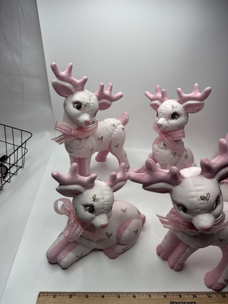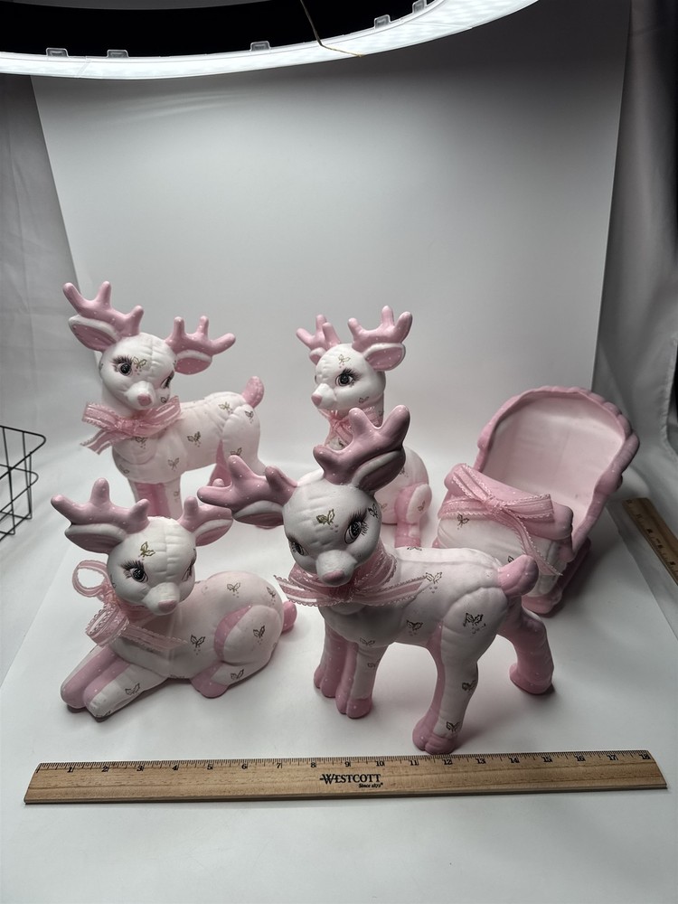 5pc Set of Ceramic Plush Design Pink Reindeer with Sleigh Christmas Decor MCM Item is in vintage pre-owned condition and may show some signs of use and wear/tear. Please check out the pictures and let me know if you have any questions. Thank you for checking out my shop! :) Our hand-selected products are carefully examined, photographed, and stored in a smoke-free environment. Orders received by 2pm ET generally ship the next business day from Pennsylvania via USPS. I'm happy to combine shipping on orders; eBay should provide a combined shipping quote in many cases. I can always combine shipping manually as well if that is helpful.