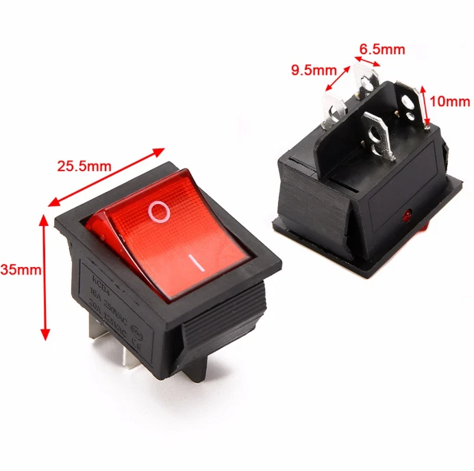 Specification: Brand new Model: KCD4-201 Pin Number: 4 Rating: 16A/250V 20A/125V Quantity: 5pcs Color: red +black Size: approx. 35 x 25.5 x 10mm Material: plastic Contact Terminals Material: copper Package included: 5pcs x rocker switch Note: Please allow 1-5mm errors due to manual measurement Item color displayed in photos may be showing slightly different on your computer monitor since monitors are not calibrated same