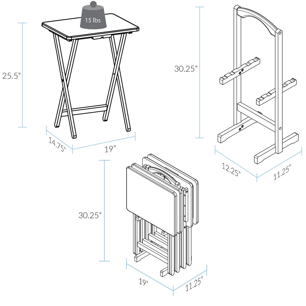 With this 5-piece folding table set you can have a table anywhere in your home. Made of 100-percent solid wood, this set includes 4 folding tables and a convenient storage stand, which is great for transportation. Perfect for TV meals or family meals that make their way out of the kitchen or dining room. 1" Thick solid American walnut Top for quality you can see and feel..Assembly Required.Material:Pine.Item Dimensions:19" L x 14.7" W x 25.5" H Matching solid wood storage stand for organization. Tray stand Dimensions: 12. 25"W x 11. 25"D x 30. 25"H Great for living room Get together when you Need that extra table space. Solid wood Construction for increased durability and longevity. Light and easy assembly. included components: Hardware Included Not Made In China