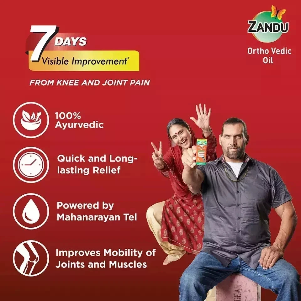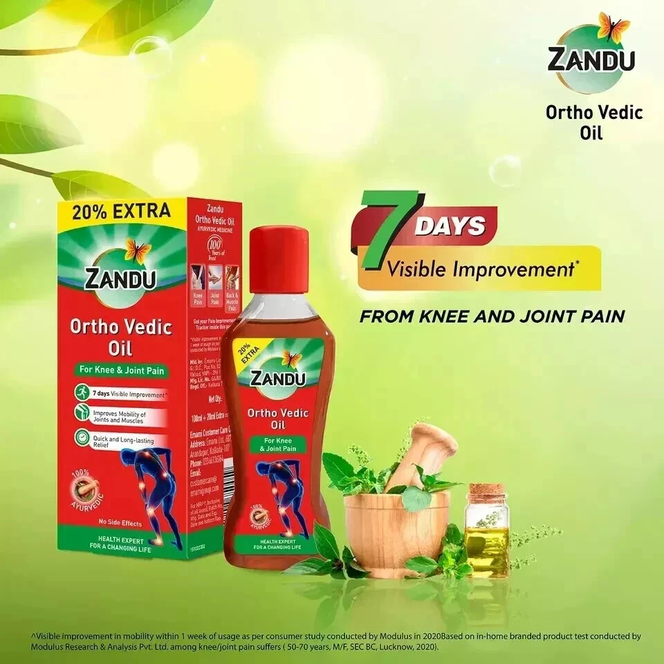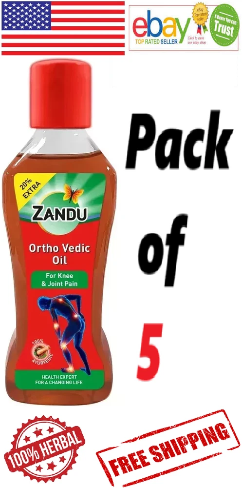 5x Zandu Ortho Vedic Knee & Joint Pain Oil (120ml Each) 100% Ayurvedic Oil (Free Ship) Zandu Ortho Vedic Knee & Joint Pain Oil helps improve joints and muscles' mobility by quick and long-lasting relief. The oil can help provide visible improvement in 7 days. The ortho oil helps alleviate 20 musculoskeletal pains like osteoarthritis, myalgia, and gout. It is prepared with more than 100 ayurvedic ingredients and enriched with the goodness of essential oils like mahanarayan taila, mahamasha taila, and vishgrabha taila. It not only relieves joint pain but also helps strengthen muscles. Indications: This is indicated in cases of joint pain, arthritic pain, muscular pain, sprain, back pain, frozen shoulder, neck pain, leg/calves pain, myalgia, lumbago, and spondylitis. Product Form: Liquid Key Benefits: Knee pain: Helps in the management of discomfort and aches at muscle and bone joints Joint pain: Useful in reducing pain, stiffness, loss of flexibility and swelling of joint Back and muscle pain: Beneficial in reducing lack of strength in the muscles due to which they may not contract or move as easily as before Directions For Use: Spread out 5-10 ml of the oil on the inflamed area and gently massage for a few minutes Use twice daily in case of severe pain Repeat as often as required Note: Do not apply hot fomentation
