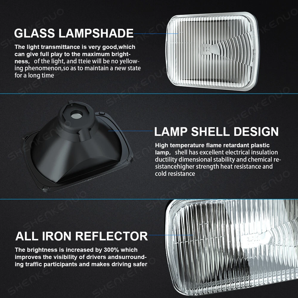 Ditch your dim yellow halogen bulbs Replace your old headlight housing to a premium pure glass LED SMD housings. his kit comes with everything you need to replace your old housing. Buy from a trusted distributor and get the premium pure glass housings today! Specs: Brand New in box! Universal Fitment for vehicles using 2PCS 7 inch lampshade Made with High Quality Glass Lenses - NOT cheap plastic! Improved appearance with Classic Cut design! Brighter than standard housings to Improve road visibility and safety! Direct Plug & Play design (certain vehicles will require slight modification) Professional Installation is highly recommended Warranty: 1 Years H4/9003 LED Headlight Bulbs Key Features: 1. Designed to enhance your visibility and driving safety at night and bad weather. 2. Latest 2-side CSP LED light source, super bright without blind zone. 3. Efficient cooling system ensures maximum headlight performance and appropriate working temperature. 4. Built-in smart IC chip provides intelligent temperature control and allows for instant start. 5. IP67 waterproof and high temperature resistant, withstand extreme weather conditions. 6. Easy installation without any modification or additional wiring, plug and play. Compatible Models and Years: - Universal for most vehicles on the market like SUV, bus, truck, sedan, pickup, sport utility etc. Specifications: Brand: SHENKENUO Condition: 100% Brand New Light Source:SHENKENUO LEDs Material: Aviation Aluminum + ABS Color Temperature: 6000K White Working Voltage: 12V Number of Bulbs: 2 Waterproof Rate: IP67 Working Temperature: -40℃ - +80℃ Bulb Type: H4/9003 Beam Type: High Beam/ Low Beam Beam Angle: 360 Degrees Lifespan: Over 50,000 hours Heat Dissipation Principle: Heat Pipe Technology + Aluminum Radiator Fitment Type: Direct Replacement Placement on Vehicle: Front, Left, Right Parcel Content: 2PCS H4 LED Headlight Bulbs 2PCS 7 inch square Headlight Housing (New and old packaging will be shipped randomly) On Dec 4, 2024 at 01:37:35 PST, seller added the following information: