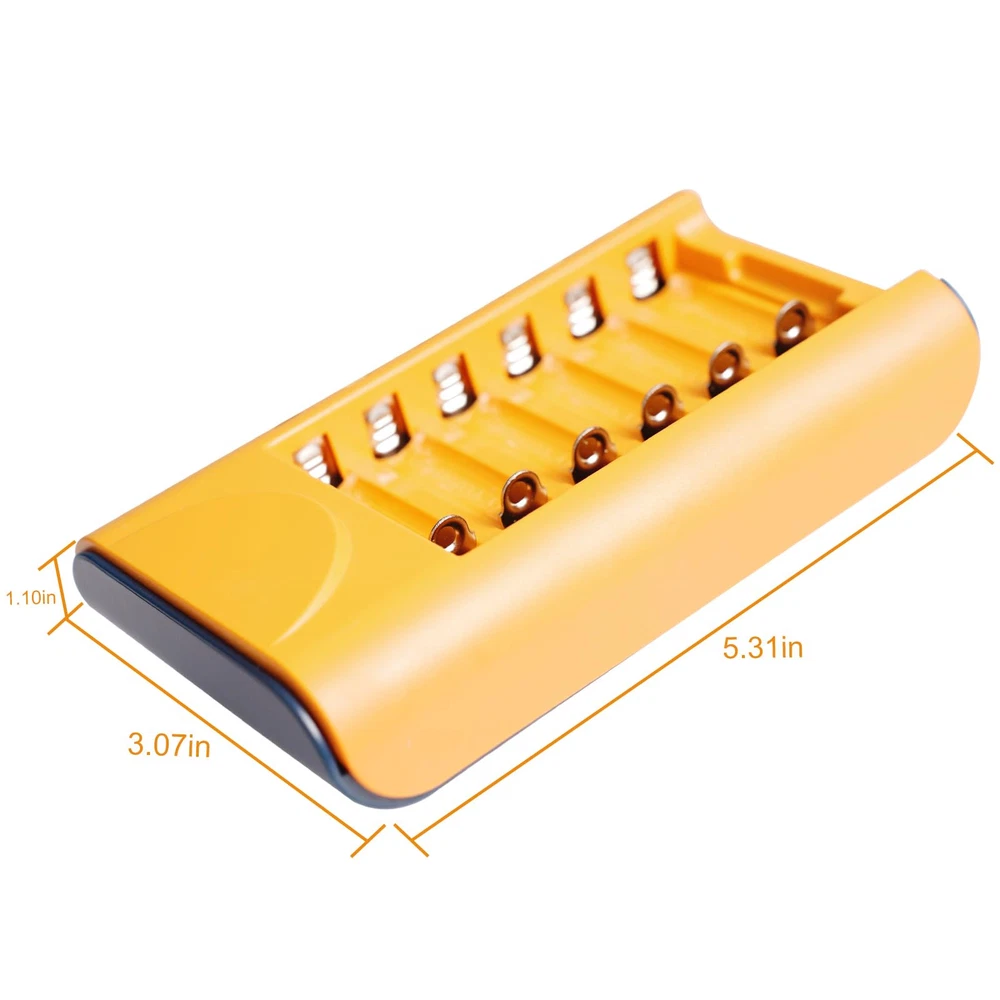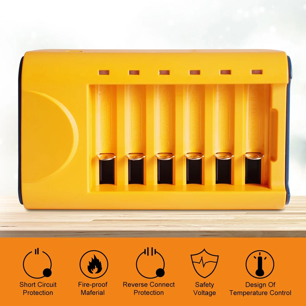 Smart Rechargeable AA Battery Charger】 AA AAA battery charger 6 bay for Ni-MH Ni-CD rechargeable batteries can charge any quantity in any slot. Single, double or triple ones can be charged, and not necessary to put them in neighboring slots. Besides, you can also mix charge AA and AAA batteries, as long as they are Ni-MH or Ni-CD batteries. 【Safety Protection】Comes with special charge and discharge management circuit. With multiple security protection settings, battery charger aa can effectively prevent reverse, short circuit, overcharge, over discharge, over-current damage to the battery, which makes users using the product without any safety concern. 【LED Indicators Charging Display】 This aa aaa battery charger with Red/Green led light display, And the aa rechargeable battery charger will display the status of each rechargeable battery when you insert a battery to charge, the light will turn solid red, only on the port(s) containing the battery, to indicate the battery is charging. The light turns solid green when charging is complete. 【USB AA Battery Charger】USB Powered Universal Intelligent Battery Charger, allows for on the go worldwide portability.the USB charging line can be connected to USB socket, car charger, computer, phone adapter, other USB output equipment to charge.