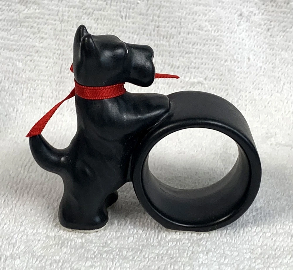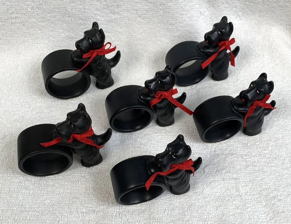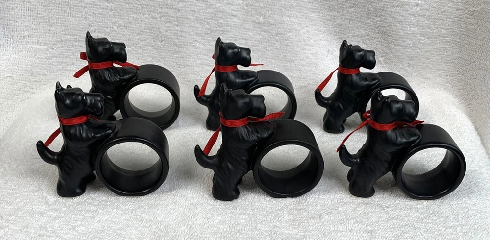 6 preowned Dept 56 napkin rings Ceramic Black Scottie dogs with a red ribbon around the neck The dog stands 3" tall No damage