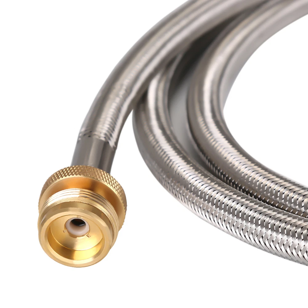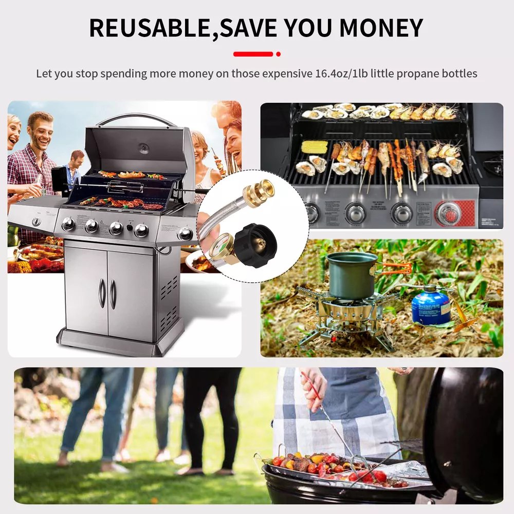 6 FT Stainless Steel Braided Propane Adapter Hose with Propane Tank Gauge, 1 lb to 20 lb Conver ter for QCC1 / Type1 LP Tank to 1 LB Propane Stove, Tabletop Grill and More 1lb Portable Appliance Good Quality Material : 6 FT Propane adapter hose made of durable stainless steel braided with good anti corrosion & heat-resistance. Durable solid brass provide secured connections between appliance and tank. Wide Range of Application : Used for weber Q gas grill, Coleman camp stove, Buddy heater, portable heater,portable grill, tabletop grill and more 1lb portable appliance. Suitable for camping, tailgating, heating needs or having an outdoor cookout. Easy to Install: No tools required, equipped with hand-tighten hand wheel. Fits for Type1(QCC 1) propane bulk tanks and cylinders connections. Compitable: This 6ft stainless braided propane hose adapter with gauge is used to hook 1lb portable appliance to 5-40lb LP tank. Not only 1lb tank any more. One side connect to Acme nut(QCC1/Type1),the other side connect to male cylinder thread (1lb connection). Safety: Propane hose with gauge is CSA certificate to ensure air tightness and stability. Propane Tank Gauge helps you read and monitor the gas levels clearly and easily, and detect the dangerous leaks. Product Specification: Material: Stainless steel braided Length: 6 feet /72 inch Gas type: LP/LPG Inlet Pressure: 25-250PSI Apply to: outdoor heater, portable grill, propane stove , lantern and more. Warning!!! For your safety all Propane Appliances like gas grills, lanterns, heaters and stoves are Outdoor Use. Fully tightened at both propane tank side and grill side before using on your propane appliances to prevent leakage. Contact us We can be contacted at any time through eBay messages if you have any questions, comments or product requests. We will respond to you within 24 hours and do our best to help you out! We encourage our customers to contact us with any questions or concerns! We'd like to be sure you are completely satisfied with your purchase. Free & Fast Shipping All products in our store are shipped from the US warehouse and you don't need to pay any shipping fees! Free Return If you need to return the item you purchased, we will provide you with a shipping label.