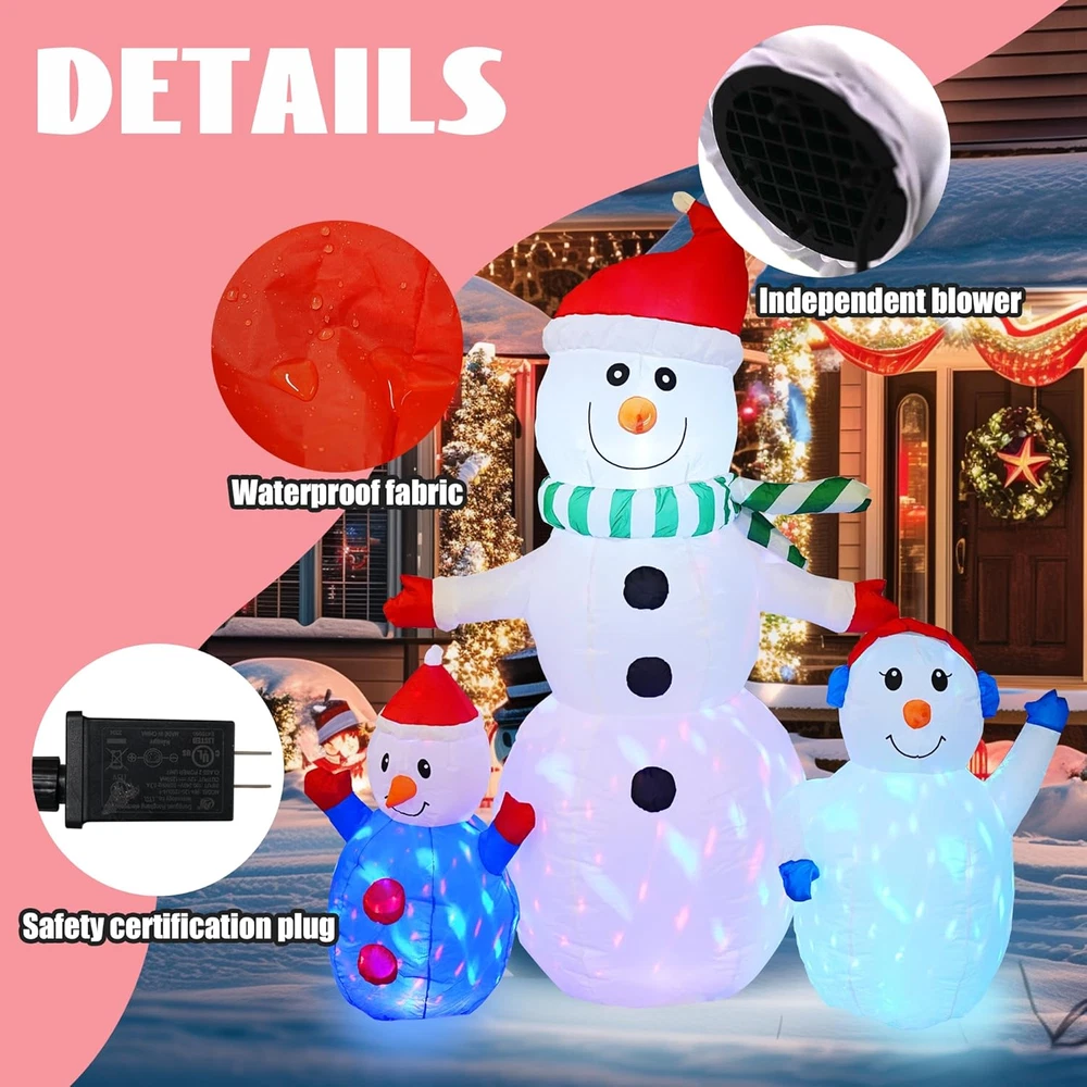Store New Arrivals Add to Favorite View Feedback Contact Fast deliveries to the customer's home Quality customer service John Make the customers happy! 6 FT Christmas Inflatable Snowman Outdoor Decorations, Blow up Snowman Built-In Colorful Rotating LED, Waterproof Christmas Decoration for Yard Garden Lawn Xmas Holiday Decor Description Warm Embrace Design: Our trio of inflatable snowmen exudes a welcoming charm with outstretched arms, as if offering a warm hug. The base is adorned with rotating LED lights that cast a beautiful glow, enhancing the snowman's presence and making the night view enchanting. Colorful Rotating LED Lights: The interior of the inflatable snowman houses bright, colorful LED lights that create a mesmerizing atmosphere, especially during the evening hours. The lights dance around the snowman, evoking a sense of wonder and magic. Robust and Secure: Equipped with built-in 4 stakes and 2 tethers, our inflatable snowman is designed for stability and ground security. Crafted from high-strength, waterproof polyester that resists fading, it stands up to light rain and is suitable for both indoor and outdoor festivities. Effortless and Safe Inflation: Our snowman comes with a powerful built-in blower for quick inflation. Simply zip up the closure at the bottom, connect it to a power source, and watch as the inflatable expands to full size in under a minute, ensuring a safe and user-friendly experience. Ultimate Christmas Charm: This inflatable snowman is the epitome of winter joy and the quintessential outdoor Christmas decoration. It's perfect for adorning gardens, yards, and indoor spaces, creating a festive atmosphere that brings happiness and warmth to the holiday season. Product Description The video showcases the product in use. The video guides you through product setup. The video compares multiple products. The video shows the product being unpacked. Whimsical Design Trio of snowmen with welcoming outstretched arms. LED Light Base Adorned with rotating LED lights for a beautiful nighttime glow. Durable Material Crafted from high-strength, waterproof polyester that resists fading and is suitable for light rain. 1 Whimsical Design 2 LED Light Base 3 Durable Material Warm Embrace Inflatable Snowmen Our Inflatable Snowmen Trio brings a warm embrace to your Christmas decor, standing ready with outstretched arms to welcome friends and family. This charming group creates an enchanting night view with their rotating LED lights, perfect for spreading holiday cheer. Perfect for gardens, yards, and indoor spaces. Brings happiness and warmth to the holiday season with its iconic winter joy. MERRY CHRISTMAS Add to Cart Add to Cart Add to Cart Add to Cart Customer Reviews 4.3 out of 5 stars 1,038 3.9 out of 5 stars 296 3.4 out of 5 stars 285 3.9 out of 5 stars 296 4.1 out of 5 stars 284 4.2 out of 5 stars 15 4.5 out of 5 stars 225 Price $24.99 $ 24 . 99 $39.99 $ 39 . 99 $39.99 $ 39 . 99 $105.99 $ 105 . 99 $23.99 $ 23 . 99 $49.99 $ 49 . 99 $20.79 $ 20 . 79 Size 7.5" x7.5" x7.1"(Large) 20.5"L x 9"W x 29.5"H 24"L x 6"W x 16"H 24 "L x 9.7"W x 52"H 7.5" x7.5" x7.1"(Large) 6 FT 16.9"H x 10.8"W Power Supply Plug In Plug In Plug In Plug In Plug In Adapter / Lights ✔ ✔ ✔ ✔ ✔ ✔ ✘ Waterproof ✔ ✔ ✔ ✔ ✔ ✔ ✔ Outdoor ✔ ✔ ✔ ✔ ✔ ✔ ✔ Item Dimensions 3 x 4 x 5 inches Color White Light Color Multicolored Material Polyester Material Type Polyester Theme Christmas Occasion Christmas Additional Features Lighted ABOUT US We offer the best prices around on high quality products. Our E-store includes media such as books, movies, music and games while offering electronics, toys, sporting apparel, clothing, tools, general home, garden items and more. SHIPPING We are always working hard to ensure your package arrives as soon as possible. Please understand that some factors like weather, high postal traffic, and the performance of shipping companies are outside of our control. We offer free shipping to the lower 48 states and ship within 2 business days of payment, usually sooner. We do not accept P.O. Boxes. Please provide a physical address. For shipping outside of the continental USA, we only use eBay's Global Shipping Program. The item is shipped to KY and then sent to the rest of the world. International customers are responsible for all duties and taxes. Continue to 'check out' to calculate costs for shipping the item to your country. Messages regarding eBay's Global Shipping Program MUST be directed at eBay EXCLUSIVELY. RETURNS We offer a 30-Day Return Policy on items in which you are not completely satisfied with. You have the option of a full-refund or an exchange of the item. No returns are available on items shipped outside of the USA PAYMENT We accept PayPal. CONTACT US This page content is yet to come Please ad us to your favorite seller and visit again later Thank You CUSTOMER SATISFACTION We try our very best to make sure every customer is completely satisfied. If there's a problem, message us! We're happy to help. WE ACCEPT
