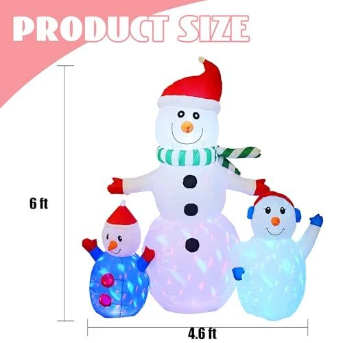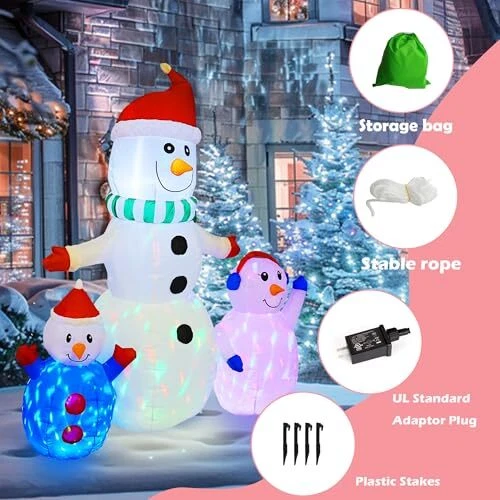 30 Days Return Policy Fast Delivery Trusted seller 6 FT Christmas Inflatable Snowman Outdoor Decorations, Blow up Snowman Built-in Colorful Rotating LED, Waterproof Christmas Decoration for Yard Garden Lawn Xmas Holiday Decor Product Description Warm Embrace Design: Our trio of inflatable snowmen exudes a welcoming charm with outstretched arms, as if offering a warm hug. The base is adorned with rotating LED lights that cast a beautiful glow, enhancing the snowman's presence and making the night view enchanting. Colorful Rotating LED Lights: The interior of the inflatable snowman houses bright, colorful LED lights that create a mesmerizing atmosp, especially during the evening hours. The lights dance around the snowman, evoking a sense of wonder and magic. Robust and Secure: Equipped with built-in 4 stakes and 2 tethers, our inflatable snowman is designed for stability and ground security. Crafted from high-strength, waterproof polyester that resists fading, it stands up to light rain and is suitable for both indoor and outdoor festivities. Effortless and Safe Inflation: Our snowman comes with a powerful built-in blower for quick inflation. Simply zip up the closure at the bottom, connect it to a power source, and watch as the inflatable expands to full size in under a minute, ensuring a safe and user-friendly experience. Ultimate Christmas Charm: This inflatable snowman is the epitome of winter joy and the quintessential outdoor Christmas decoration. It's perfect for adorning gardens, yards, and indoor spaces, creating a festive atmosp that brings happiness and warmth to the holiday season. Shipping Returns Payment Shipping Shipping is FREE to all addresses other than APO/PO boxes in the lower 48 states. All our stock ships from US-based warehouses. Shipped via USPS or UPS (depending on location and package weight) Unless stated otherwise, all orders will ship within 24-72 hours of your payment being processed. Check our feedback to see the great reviews of FAST shipping we offer. Returns As our valued customer, we will do our best to make sure the product you receive arrives to you on time and as expected. If you are not satisfied with your purchase, please contact us within 30 days of receiving your order to process a return. Payment We currently accept payment via eBay managed payments only. Once payment is cleared, we will dispatch your shipment within 1-3 business days. Please refer to the "Shipping" tab for more information regarding shipping speed to your destination.