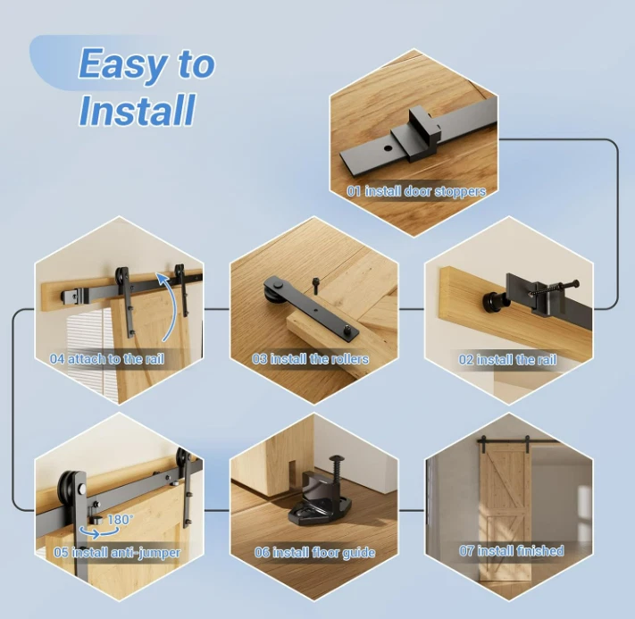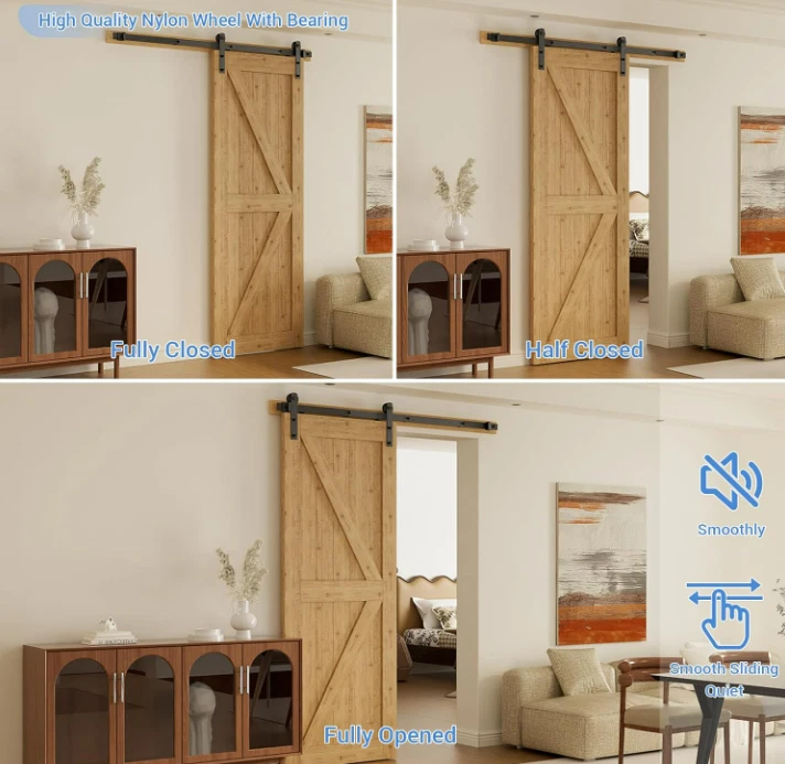 Free eBay listing template designed by dewiso.com 6 Feet Heavy Duty Sturdy Sliding Barn Door Hardware Kit -Smoothly and Quietly Durability and Weight Capacity: Solid steel roller hanger and High strength industrial grade flat tracks hold MAX. 330LB/150KG door, anti-corrosion and little wear and tear for years of repeated use. Quiet and Smooth Operation: Super silently nylon wheels and Spring damping door stoppers provide soft close sliding when opening and closing, move quietly and smoothly. Save Space: For space-saving benefit, ccjh sliding barn door hardware kit is a great option for both homes, offices, narrow hallways and as well as smaller apartments, blending modern design with rustic appearance. Easy to Install: ccjh barn door hardware offers professional instruction and customer service to solve all installation problems in time, needs MIN. 6" space above the door, fits 1-3/16"-2" thick door. Well Complete Package: barn door kit-NO DOOR(6ft spliced rails, rail spacers, 2x rollers, 2x door Stops, 2x anti-jump disks, 1x floor guide), 6ft barn door track fits a max. 36" wide door, and gap from wall to door is 2-3/16" minus door thickness. Contact us We can be contacted at any time through eBay messages if you have any questions, comments or product requests. We will respond to you within 24 hours and do our best to help you out! We encourage our customers to contact us with any questions or concerns! We'd like to be sure you are completely satisfied with your purchase.