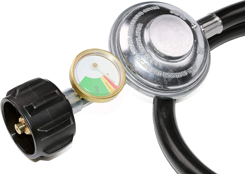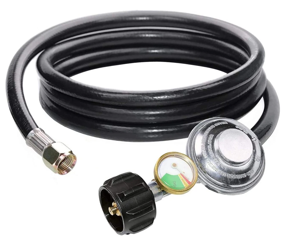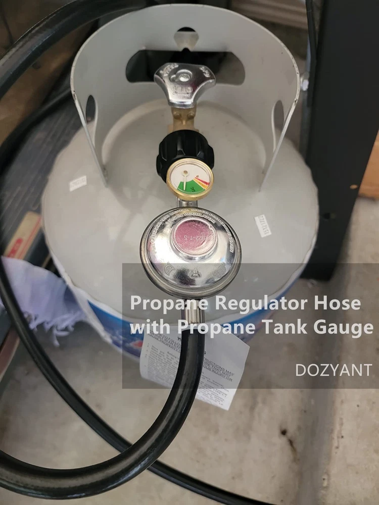 High Quality Material:100% solid brass can be effective corrosion protection. Ensure Your Safety:Our propane regulator with hose has excess flow protection for your safety and will automatically shut off. Convenient Installation: Installs quickly and easily tool-less attachment to propane tanks and cylinders. Apply to: Gas grills ,heaters, lanterns, camp stoves, tabletop grills, fire pit table and more. Great for: BBQ, camping, tailgating, heating needs or having an outdoor cookout. Product Specification: Type:Low pressure(Parallel) Inlet Pressure:25-250 PSI Outlet Pressure:11" W.C. Flow Capacity: 95000 BTU/Hour Certificate:CSA Length:6 feet (length of rubber hose only) For your safety, please read before using the hose. Attention: 1.FULLY TIGHTENED at both propane tank side and grill side before using on your propane appliances. 2.Check and make sure the hose is away from the OPEN FIRE before installing it to your appliances. 3.Keep the hose away from HIGH TEMPERATURE. Equipped with propane tank gauge. Type-1 (QCC-1) tank (cylinder ) connect - fits all appliances with a type 1 connection. 3/8" Female Flare.Nut Thread 5/8"-18UNF. Swivel Nut.5/16" diameter LP hose. Replacement for Weber Genesis 300 series gas grills, Genesis Silver C, Genesis Gold, Genesis Platinum, Spirit E-210/E-310, etc. , Camp Chef Flat Top Griddle, Camp Chef 2-Burner Stove and Blackstone 28in & 36in Griddle, Dyna Glo dgp350snp-d, mfa350bnp/mfa350cnp ge530bsp-d, dge486ssp-d, dge486gsp-d, etc. , Pitboss portable grills and Royal Gourment portable and flat top grills. Easy installation - No tools required, tool-less attachment to tank. It is normal if you hear noise in the regulator, it is the resonance of the gas in the regulator. Safety & corrosion resistant - CSA certificated - Pass CSA certificate for your safety. Provides secure, air-tight connection between grill or fire pit and tank, no gas leaks, ensures safety while using grill, no issues with regulator or gas, air flow is kept stable and at appropriate levels Fits most gas grill, heater, fire pit, lp generator, lantern, two burner camping stove, side burner, and used for most low pressure gas propane application. Fits for Weber, Char-broil, Nexgrill, Monument, Dyna-Glo, Brinkmann grill and other outdoor propane grills with 3/8" male flare fittings.