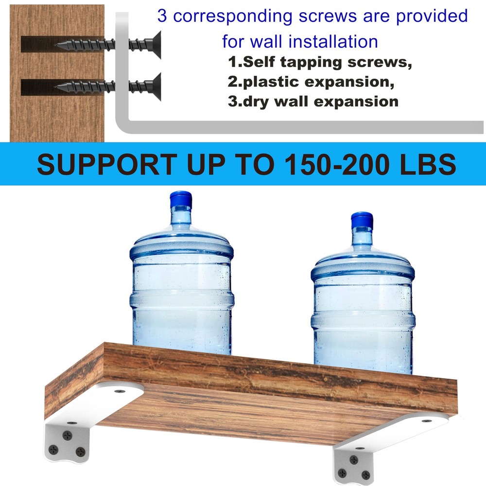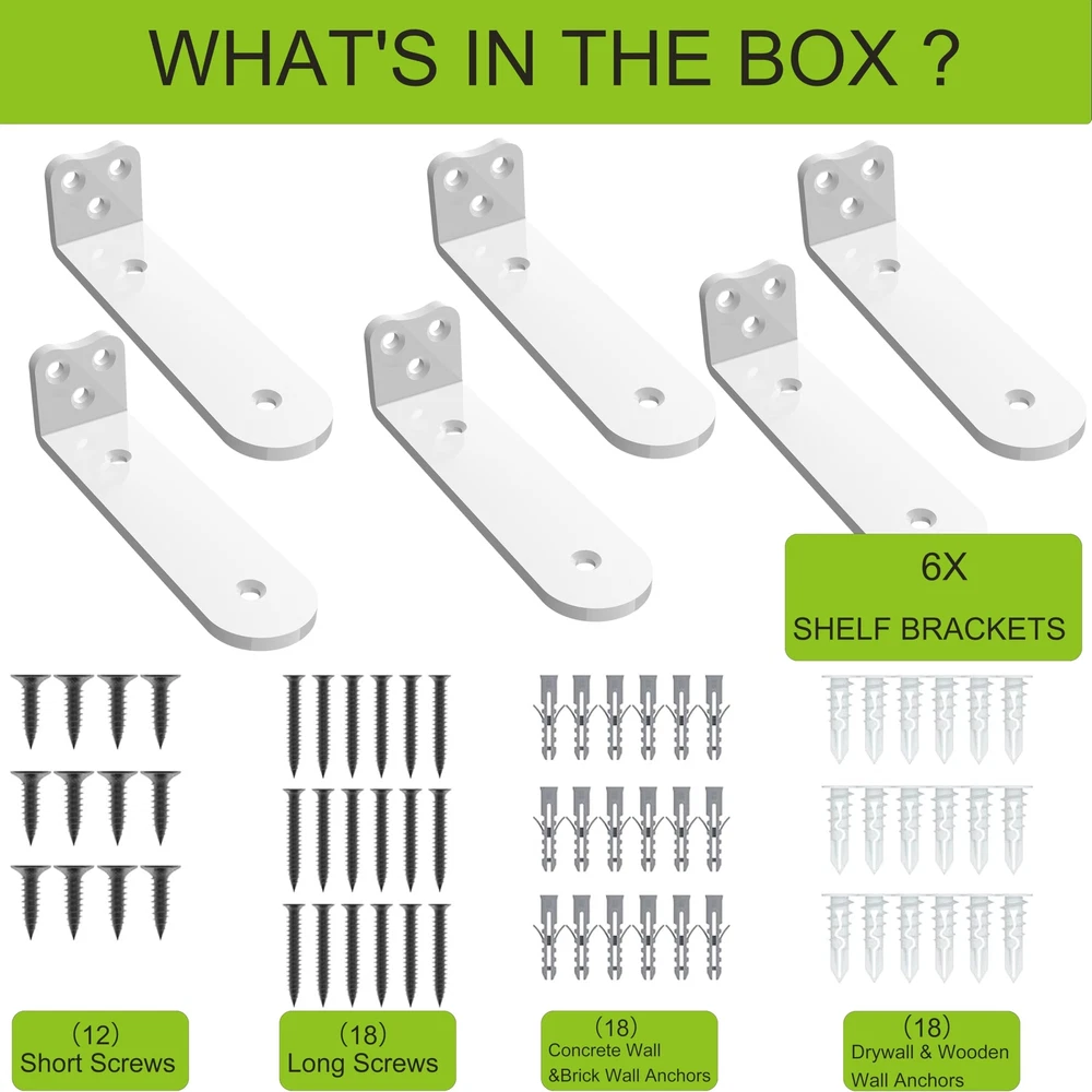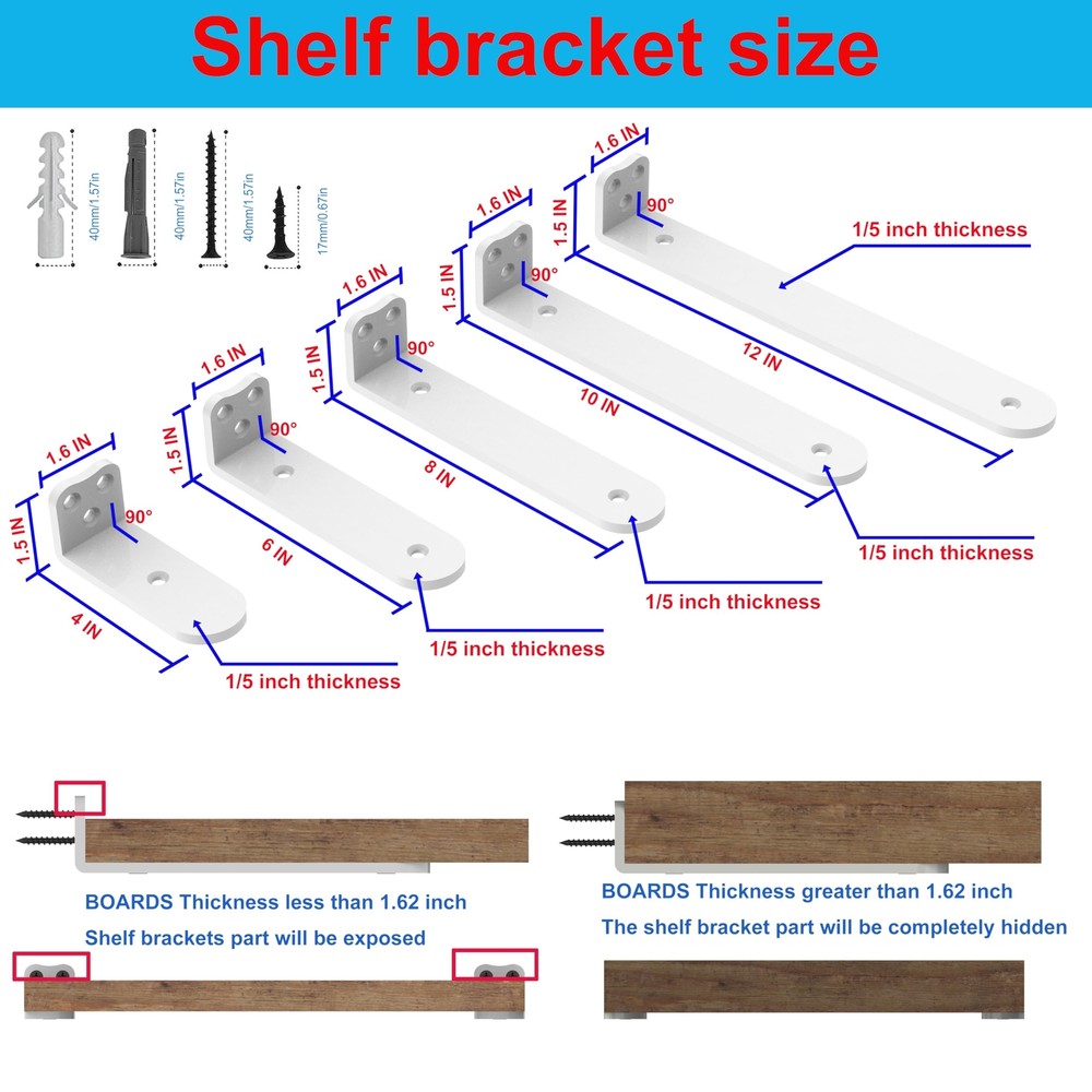 BRACKET PERFORMANCE - Our Heavy Duty Shelf Brackets boast a 1/5 inch thickness, (NOT INCLUD BOARDS)Perfect for heavy-duty use, ensuring your shelves stay solidly in place, no matter the load.(Holds 160+lb) ELEGANT AESTHETICS - Available in sleek white, luxurious gold, and classic black, L Brackets Heavy Duty enhance any décor.The rounded design makes you feel more comfortable and safe during use and installation, avoiding potential injuries caused by sharp angles. FULL INSTALLATION KIT - No need for extra trips to the hardware store. Floating Shelf Hardware include comprehensive screw accessories(Including concrete expansion screws, dry wall expansion screws, and metal self tapping screws), ensuring you have everything required for a quick and easy setup.(NOT INCLUD BOARDS) MODERN ELEGANCE - Upgrade from ordinary to extraordinary with our circular arc design. Thanks to the sleek lines and rounded design,Wall Shelf Brackets provide a sleek, refined appearance that complements any room’s décor. MULTI-ROOM APPLICATION - Whether you need shelf brackets for your home office, kitchen, or living area, our floating shelf brackets meet all your needs. Enhance any space with these adaptable, high-quality brackets.