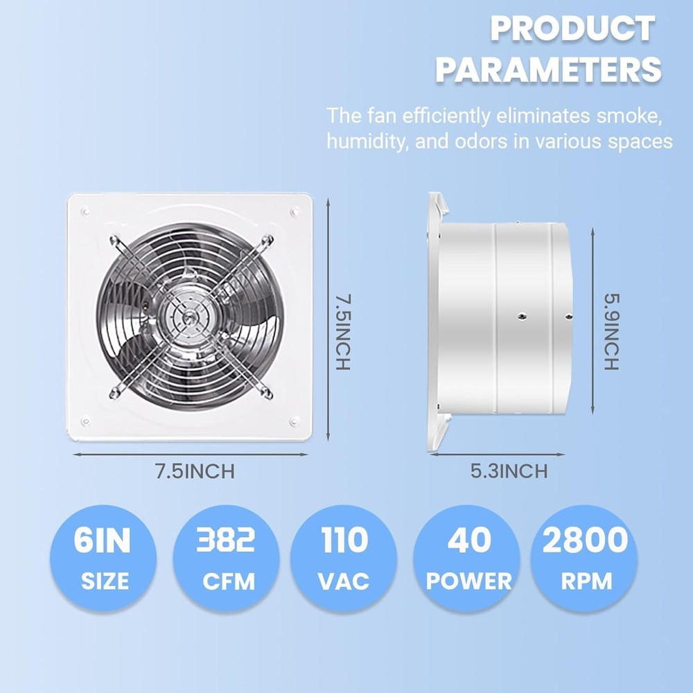 6 Inch Exhaust Fan Metal Bladeless 382CFM Ventilation for Bathroom Office ‹ › ‹ › ‹ › ‹ › ‹ › ‹ › ‹ › ‹ › ‹ › ‹ › 6 Inch Exhaust Fan - Metal Bladeless Experience unparalleled ventilation and a breath of fresh air with our 6 Inch Exhaust Fan, designed to optimize air circulation in any space, from your cozy bathroom to expansive warehouses. With a remarkable airflow rate of 382 CFM, this fan is your ideal solution for efficient indoor HVAC systems. Key Features: Efficient Ventilation: Suitable for kitchens, bathrooms, offices, basements, and garages, ensuring continuous airflow in areas that demand regular ventilation. Stable & Durable Construction: Crafted from high-quality metal materials, anti-corrosion, and anti-scratch properties ensure longevity and performance. High-Quality Motor: Equipped with a double ball bearing outer rotor brushless motor designed for whisper-quiet operation while minimizing energy consumption. Overheat Protection: The built-in overheating protection cuts off power when the motor is overworked, enhancing safety and extending the life of your fan. Specifications: Dimensions: 19 x 13.5 x 15 cm (7.5 x 5.3 x 5.9 inches); Air Flow: 382 CFM; Power: 40W; Voltage: 110V; Frequency: 50Hz; Speed: 2800r/min. Easy Wiring Options: Flexible wiring methods available for simple installation, making it easier than ever to experience the benefits of advanced ventilation. Why Choose Our 6 Inch Exhaust Fan? Upgrade your environment with our sophisticated and efficient exhaust fan. Its durable construction and high-quality motor ensure you not only enjoy superb air circulation but also peace of mind knowing you own a product built to last. The combination of an automatic closing valve and a strong wind design means that it’s not just efficient, it’s safe, too. Don’t compromise on freshness and safety in your indoor environments. Invest in the 6 Inch Exhaust Fan today, and breathe easy! Shipping Free & Fast Shipping - We offer free shipping to most of the USA with a normal delivery time of 3-7 days. However, due to the current situation, additional delivery time (up to 3 weeks) may be required for some items. Alternative Carriers - We may use alternative carriers (e.g. USPS, FedEx, UPS, etc.) to ensure your package arrives safely and on time. Due to the use of multiple carriers, we are unable to provide a tracking number automatically. Handling Time - Orders are processed and shipped within 1-2 business days of receiving cleared payment. Shipping Restrictions - Shipping to Alaska, Hawaii, Puerto Rico, Guam, and other US territories may incur shipping charges or delivery restrictions. Please contact us before ordering, or your order can be refunded/cancelled. State Restrictions - There may be restrictions based on your state of purchase. For example, certain items may not be shipped to California due to state regulations. Contact for Tracking Updates - If you require tracking updates or have any concerns about the delivery of your order, please feel free to contact us, and we will be happy to assist you. Return 30-Day Hassle-Free Returns - We want you to be completely satisfied with your purchase. If you are not, you can return the item within 30 days of receiving it for a full refund or exchange. Easy Return Process - To start a return, simply contact us and we will provide you with a prepaid return shipping label and detailed instructions. Restocking Fee - There are no restocking fees for returns. However, the buyer is responsible for return shipping costs if the return is not due to a seller's error. Refund Processing Time - Refunds will be processed within 5 business days of receiving the returned item in its condition. Payment We accept all major credit cards, PayPal, and Apple Pay for your convenience. Your payment information is secure and encrypted to ensure a safe and seamless transaction. Please complete your payment within 3 days of purchase to avoid any delays in shipping. Feedback Your feedback is extremely important to us. We strive to provide the best products and customer service possible. If you are satisfied with your purchase, please take a moment to leave us a positive review. If you have any concerns or issues with your order, please contact us before leaving negative feedback. We are committed to resolving any problems and ensuring your satisfaction. Contact Us If you have any questions or concerns, please feel free to out to our customer support team. You can contact us through the eBay messaging system. We are available Monday to Friday, 9:00 am to 5:00 pm EST, and we will do our best to respond to your inquiry within 24 hours. Buy it now and enjoy a pleasant shopping experience! Unit Quantity: 6 inch Material: Metal,Plastic Features: Automatic Closing Valve,Anti-corrosion,Anti-scratch,Bladeless,High Efficiency Room: Bathroom,Bedroom,Office Mounting: Ceiling,Window Power Source: Electric,Corded Electric Control Style: App Control,Button Control Type: Exhaust Fan Ventilation System: Exhaust Fan Color: White Item Depth: 13.5 in Item Weight: 4 lb Shape: Rectangle Number of Blades: 7 Number of Speeds: 1 Voltage: 110 V Finish: Metallic Power: 40 W Operating Sound Rating: 62 dB Timer Control: Timerless