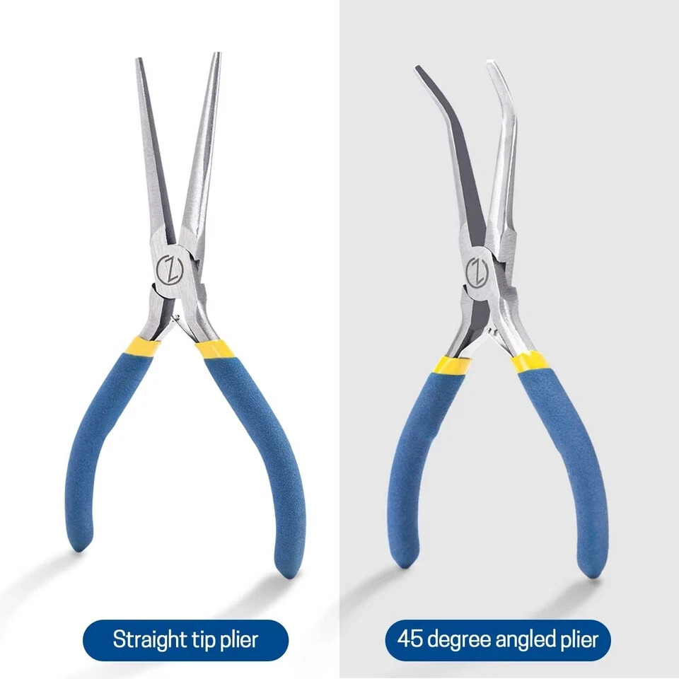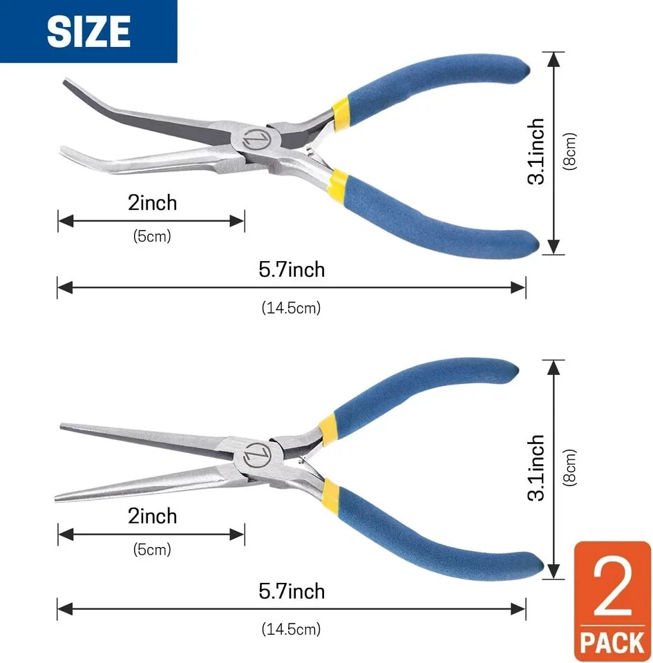 100% Money Back Guarantee if you are not satisfied with your purchase! ___________________ Description: What You'll Receive: 2PCS needle nose pliers set includes a 45-degree angle needle nose plier and a straight needle nose plier. Both measuring six inches in length. Long-Lasting Material: Crafted from drop-forged carbon steel with professional heat treatments, these mini needle nose pliers are coated with anti-rust nickel, ensuring durability, wear resistance, and long-lasting performance. Handy Helper: The elongated design of the long needle nose pliers, featuring fine tips, allows easy access to tight spaces for intricate projects like wire bending, jewelry making, industrial and mechanical maintenance, electrical work, instrument repairs, and household appliance fixes. Quality Handle: With anti-slip rubber handles, these small needle nose pliers offer a secure grip even in wet conditions, making them ideal for use in various environments. The handles are also insulated for comfortable use in cold weather. Care Tip: To maintain the pliers' condition, it is recommended to apply lubricating anti-rust oil to the surface when not in use, preventing rust and ensuring longevity. ________________________ 100% Money Back Guarantee: We offer 30 Day Money Back Guarantee from the day you purchased if you’re not satisfied with your product. If you have any questions about our products, please contact us as soon as possible. Customer satisfaction is our absolute priority. Shipping: We are always working hard to ensure your package arrives as soon as possible. Please understand that some factors like weather, high postal traffic, and the performance of shipping companies are outside of our control. We offer free shipping to the lower 48 states and ship within 3 business days of payment, usually sooner. We do not accept P.O. Boxes. Please provide a physical address. You will be notified via eBay messages as soon as your items ship. Delivery: We will ship out the item in 2-3 working day after receiving the payment. Usually the delivery takes 2-5 business days. If you don't receive the items after 10 days, please feel free to contact us. You will get a replacement or a full refund. Please DO NOT open a return request or leave negative feedback without asking for help . Returns (Get Free Return Label): We offer a 30-Day Return Policy on defective/wrong items or items which you are not completely satisfied with. You have the option for a full-refund or an exchange of the item. No need to buy eBay return label. Contact us via eBay messages and get free return label. Returned items must be in all of the original packaging and include all of the original accessories or items that came with it. The item and package should be in original condition. Contact Us: Any queries or issues incurred, please feel free to contact us via eBay message, we will get back to you within 24 hours. Please DO NOT open a return request or leave negative feedback without asking for help. Feedback: Your feedback is very important to us. After you get your package and you are satisfied with our service, please leave us positive feedback. We are highly appreciated for your POSITIVE feedback and 5 stars. Enjoy shopping.