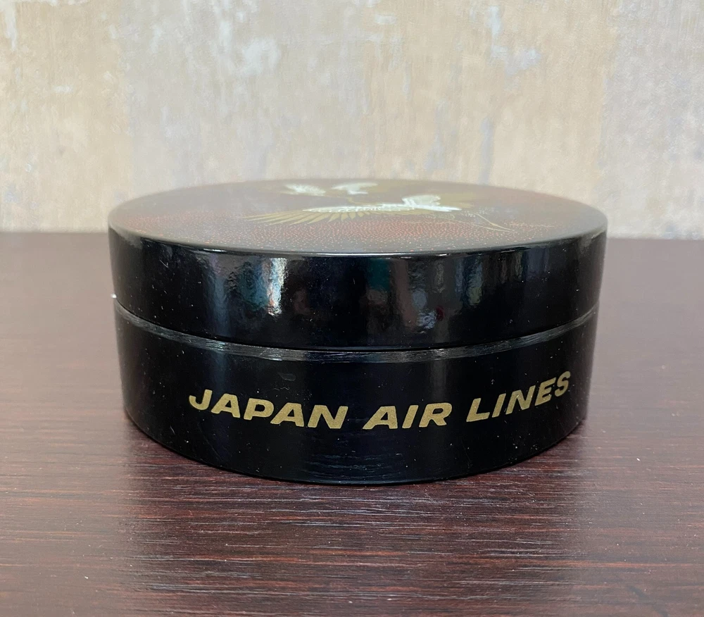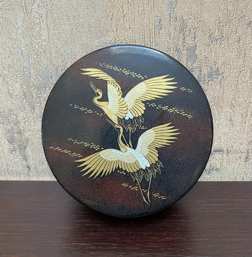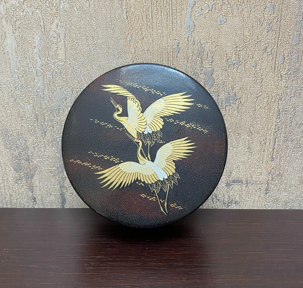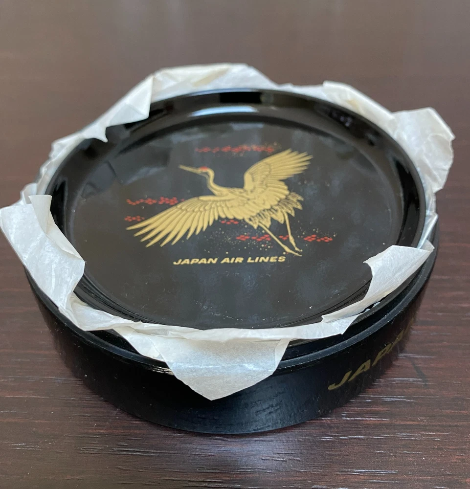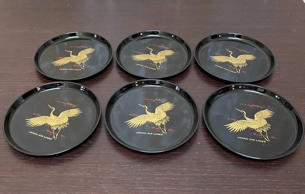 6 Laquer Coasters Sey by Mitsukoshi with Gold Cranes in Flight Designs Made of High-quality plastic that retains a nice sheen and looks like lacquer. Coasters about 4" D. Box is 4.75" x 2"