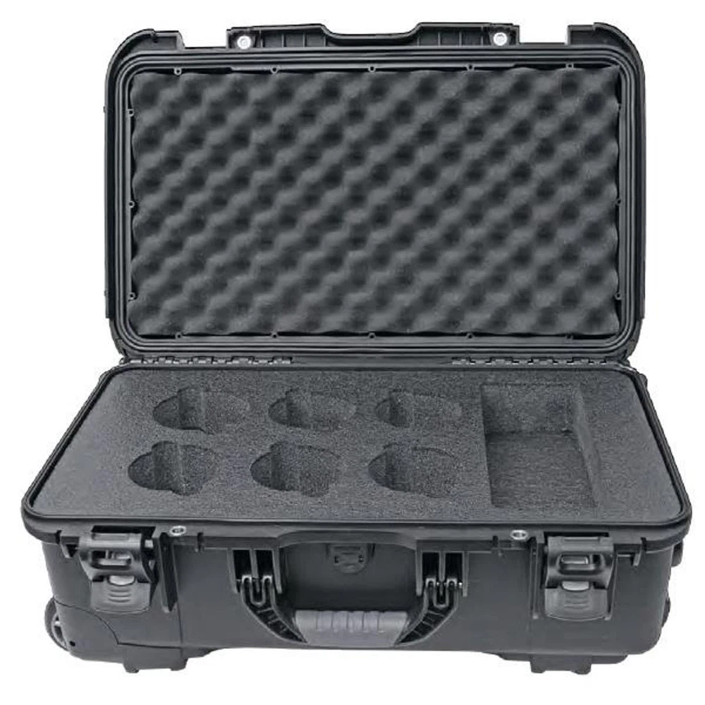 Keep your Cine, Cine DS and Cine DSX lenses safe and in your control during transit and protected from the environment during storage. Complying with FAA carry-on regulations, the 6 Lens Carry-On Case offers the ultimate combination of carry-on protection and convenience not found in any other custom case. It features a waterproof and airtight, submersible design that is resistant to corrosion and impact damage and other requirements to be rated for ATA 300, ASTM D4169, Mil-std-810f and IP67. Depending on your preference, lenses can be positioned mount up or mount down, and each lens space includes 3 removable high density foam discs for custom depth adjustment. Lens hoods can be stored in the right side rectangular compartment which is equipped with 4 removable high density foam inserts of varied thickness. The inserts can be used in any combination and cut and customized to fit other equipment. The case shell is constructed of ultra-high-strength polypropylene resin with proprietary enhancements to increase strength and impact resistance while remaining light in weight. Integrated within the shell is an automatic pressure release system to prevent changes in altitude from creating a vacuum which can effectively lock watertight cases shut. “Soft-Touch” double throw latches that powerfully lock down or release the lid without pinching your fingers, a cushioned grip telescoping pull handle with thumb release lock for quick and easy one handed operation that will not flex when wheeling over rough surfaces make the RKCASE-CO the most convenient transport and protection option for Cine DS and Cine DSX lenses available. Lifetime Limited Warranty Soft-Touch Latching System Metal Reinforced Padlock Holes Rubber Cushioned Front Handle Removable Discs for Longer Lenses Lid Stay Prevents Accidental Closure Automatic Pressure Equalization Valve Waterproof, Crushproof and Lightweight Complies with FAA Carry-On regulations Auto-Retracting Rubber Cushioned Top Handle