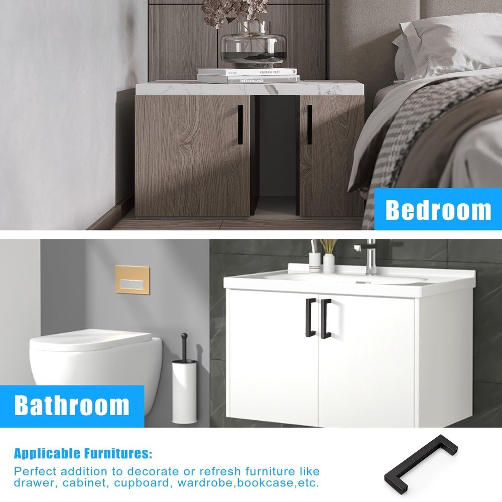 ★MEASUREMENTS - Center to Center Distance: 4"(102mm), Overall Length: 4-1/2"(114mm), Height: 1-3/10"(35mm), Width: 1/2"(12mm); fit for 12mm(0.5")-40mm(1-3/5") door thickness ★MATERIAL - Our Square Cabinet Pulls are made of high STAINLESS STEEL, with a fine MATTE BLACK finish; the smooth surface, beautiful finish and round edge is resistant to rust and corrosion, which is soft to touch and easy to clean, designed for years of use ★ALONG WITH SCREWS - Matched with 1 inch(25mm) and 1-3/4 inch(45mm) screws, the black pulls are suitable for almost all kinds of cabinets and drawers, no matter modern style or classic type(Screw of other sizes are also available in . Please tell us if you need.) ★WIDE APPLICATION - Perfect addition to any kitchen cupboard, cabinet door, desk drawer, vanity, wardrobe, closet, shoe cabinet, chest, bookcase, nightstand and much more; simple but elegant square black handle is also an excellent choice to decorate the furniture ★QUALITY - offer 30-DAY free trail and after-sale service. If there is any quality problem, we are always here to listen