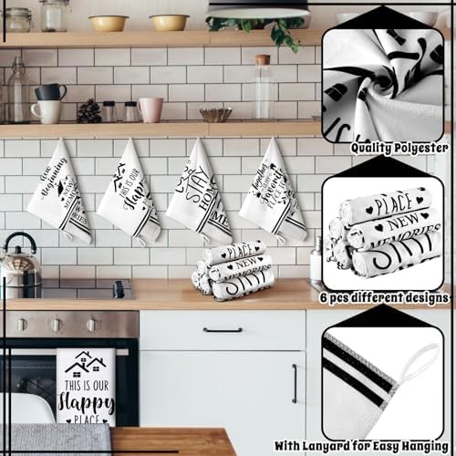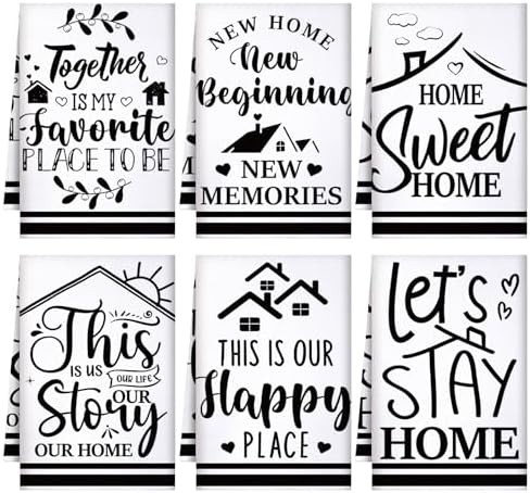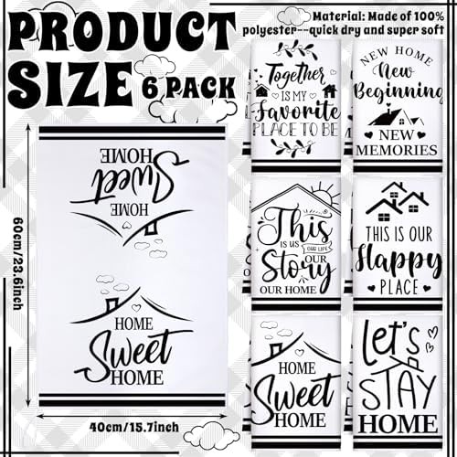 Enough to Use: you will receive 6 pieces of kitchen towels in 6 different styles, good for larger kitchens or busy households where frequent towel replacement is required; The convenience of having multiple towels allows you to tackle various tasks simultaneously or have backups for when one is being washed Housewarming Gifts Theme: these black and white kitchen towels are designed with a housewarming theme, decorated with house-shaped pattern and words expressing congratulations on moving into a new home, allowing you to enjoy the joy of new home beginning together Multi Purpose and Versatile Design: our kitchen dish towels are a versatile and valuable addition to your kitchen essentials; These towels can be applied for various purposes, whether it's drying dishes, wiping countertops, cleaning spills, or as stylish kitchen decorations; The size of about 16 x 24 inches/ 40 x 60 cm makes them suitable for handling different tasks, catering to your diverse kitchen needs