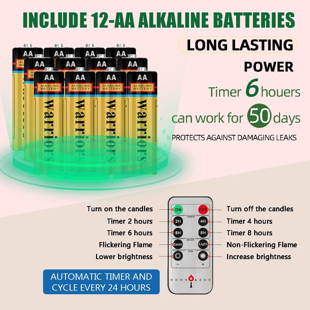 flameless window XXL Large Flame: The newly developed flame lamp perfectly reproduces the shape and size of real flames. The warm white LED light is pretty. they have a more natural flickering light.look and behave more like real candles, add to the ambiance of the holiday Battery Powered: Each candle needs 2 AA batteries, a total of 12(included). The included battery is high capacity and can run more than 400 hours continuously Size: Candle - 0.9" diameter, 8.7" hight; Candlestick - 2.4" diameter, 1.5" hight. No fire, no smoke, no messy dripping wax. Much safer and cleaner than real candles Remote / Timer: 10 key remote control to adjust the candle brightness, and the candles with 2/4/6/8 hours timer function, cycling every 24 hours. Candle will turn itself on every day at the same time and enjoy your warm time. The distance can be 5 meters Include: 6 Window Candles + 12 AA Batteries + 6 Golden Candle Holders + 6 Suction Cups + 6 Red Decor Bows(with Bells) + 1 Remote Control. The included bows and bells, combined with candles, add a celebratory atmosphere to your Christmas or holiday