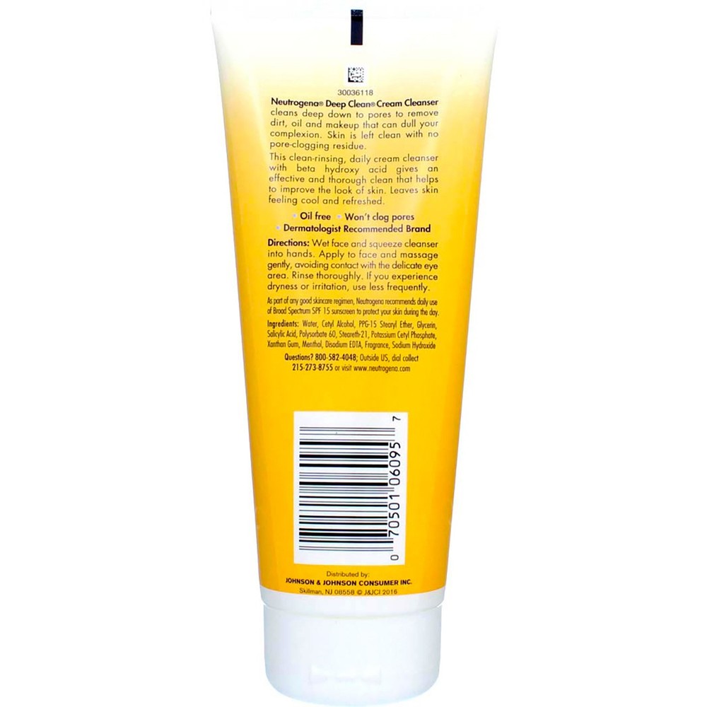 Product Description Deep clean your skin for a healthy complexion with Neutrogena Deep Clean Cream Cleanser. This clean-rinsing, daily cream facial cleanser works two ways to leave your complexion looking fresh and healthy. First, the face wash goes Deep down into pores to dissolve dirt, oil, and makeup. Then the dermatologist-tested cleanser uses the power of beta hydroxy acid to remove dead surface skin that can dry and dull your complexion, improving the look and feel of your skin. Dermatologist-tested, this Deep clean facial cleanser is alcohol-free and oil-free, so it won't dry your skin or leave behind pore-clogging residue. It’s also non-comedogenic so it won’t clog pores. Ingredients Water, Cetyl Alcohol, PPG-15 Stearyl Ether, Methyl Gluceth-20, Salicylic Acid, Steareth-21, Gelatin, Steareth-2, Potassium Cetyl Phosphate, Menthol, Polysorbate 60, Disodium EDTA, Fragrance (1206-64). Instructions Wet face and squeeze cleanser into hands. Apply to face and massage gently, avoiding contact with the delicate eye area. Rinse thoroughly. If you experience dryness or irritation, use less frequently. Product Description Deep clean your skin for a healthy complexion with Neutrogena Deep Clean Cream Cleanser. This clean-rinsing, daily cream facial cleanser works two ways to leave your complexion looking fresh and healthy. First, the face wash goes Deep down into pores to dissolve dirt, oil, and makeup. Then the dermatologist-tested cleanser uses the power of beta hydroxy acid to remove dead surface skin that can dry and dull your complexion, improving the look and feel of your skin. Dermatologist-tested, this Deep clean facial cleanser is alcohol-free and oil-free, so it won't dry your skin or leave behind pore-clogging residue. It‚Äôs also non-comedogenic so it won‚Äôt clog pores. Ingredients Water, Cetyl Alcohol, PPG-15 Stearyl Ether, Methyl Gluceth-20, Salicylic Acid, Steareth-21, Gelatin, Steareth-2, Potassium Cetyl Phosphate, Menthol, Polysorbate 60, Disodium EDTA, Fragrance (1206-64). Instructions Wet face and squeeze cleanser into hands. Apply to face and massage gently, avoiding contact with the delicate eye area. Rinse thoroughly. If you experience dryness or irritation, use less frequently. Disclaimer The product descriptions and instructions provided by vitabox.com are for informational purposes only and are qualified in their entirety by the information available from manufacturers of the products. You should carefully read all product packaging, and contact the manufacturer with any questions before using a product. While we endeavor to ensure that product descriptions are current, manufacturers sometimes change their products. We are not liable for inaccuracies or misstatements about products. We do not provide medical advice or recommendations. You should not use the information provided by vitabox.com for diagnosing or treating a health problem or disease. If you have or suspect that you have a medical problem, immediately contact your health care provider. Information and statements regarding dietary supplements have not been evaluated by the Food and Drug Administration or any other government agency and are not intended to diagnose, treat, cure, or prevent any disease.