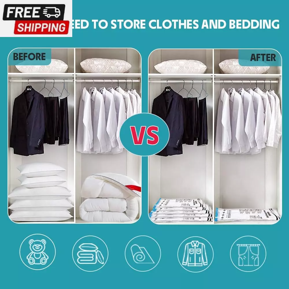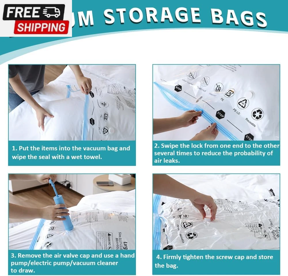 6 Pack Vacuum Storage Bags, Vacuum Seal Bags for Clothing, Comforters, Blankets, Space Saver Compression Bags with Hand Pump. (2×Jumbo, 2×Large, 2×Medium) Vacuum Seal Storage Bags: Variety sizes space saver vacuum storage bags for multiple sizes of items including clothes, comforters, pillows, and bedding. Volume reduction of 80%. Hand Pump Included for Easy Use: Works with a standard vacuum cleaner. Put the items in our storage vacuum bag, seal the zipper, suck out the air, and close the lid. 1 hand pump is included in the combo, which can be used during your trips. PA & PE: The compression bag is made of extra thick PA+PE, With a triple-seal turbo valve & double zipper seal design. Don’t worry about the long-term effects of storage in compression bags. Multi-use: Our vacuum storage bags are essentials for saving household space and organizing travel. It functions as a storage bag for clothes, comforters, and blankets. Package Included: 2×Jumbo(39.37” X27.5”); 2×Large: (31.5” X 26.65”); 2×Medium: (27.56” X 19.68”); 1×Hand Pump. Product Description Our vacuum storage bags combination is a must-have for you to save storage space! The compression bag is made of PA+PE material, which is highly flexible, durable, not easy to leak, and can be reused. Use our space-saver bags and store away various items including clothes, bedding clothes, blankets, pillows, plush toys, and more. What's more: you can use our compression bags to reduce larger and fluffier items such as vests and winter coats to minimal sizes with ease giving your clothing full protection and keeping your outfit dry. The package has vacuum storage bags of different sizes, suitable for various purposes: storage, travel, camping, moving, etc. 6 Pack Includes 2× Jumbo: 39.37” X 31.5”(100cm X 80cm) 2× Large: 31.5” X 23.65”(80cm X 60cm) 2× Medium: 27.56”X 19.68”(70cm X 50cm) 1× Hand Pump How To Use a Vacuum Storage Bag: PACK: Put the items inside our vacuum storage bag SEAL: Zip along the dual-zip 2-3 times and ensure the zipper is fully sealed VACUUM: Suck all the air out with a vacuum cleaner/hand pump included STORE: Close and secure the valve cap Usage Tips : Dehydrate all items before putting them away and storing them in vacuum bags. Avoid over-stuffing beyond the max volume line, use multiple bags instead. Double-check the zippers for full closure, and avoid stuff with sharp corners. Check leaking holes if there is a "hiss" sound, sticky tape should fix this problem. Re-vacuum the bags every 3-4 months for long-term storage. Vacuum storage is not suitable for down fibers and leather items. Shipping Fast shipping is very important for us. Our standard US shipping service is FREE. Your order will be shipped within 2-3 business days upon full payment received. Your order will be delivered within 2-3 business days after the handling time. We only ship to the confirmed PayPal address. We reserve the right to cancel any order for any reason at any time. We are not responsible for undeliverable addresses. Returns and payment We offer a 30 days return policy from checkout winning date. We allow only PayPal as payment method FeedBack Your feedback very important to us, after you get your package and you are satisfied with our service please leave us positive feedback If you have any problem with your order / any questions please before leave any type of feedback For any questions, using eBay contact system Please visit our eBay store to check out other items for sale! Thank you for shopping at our store.