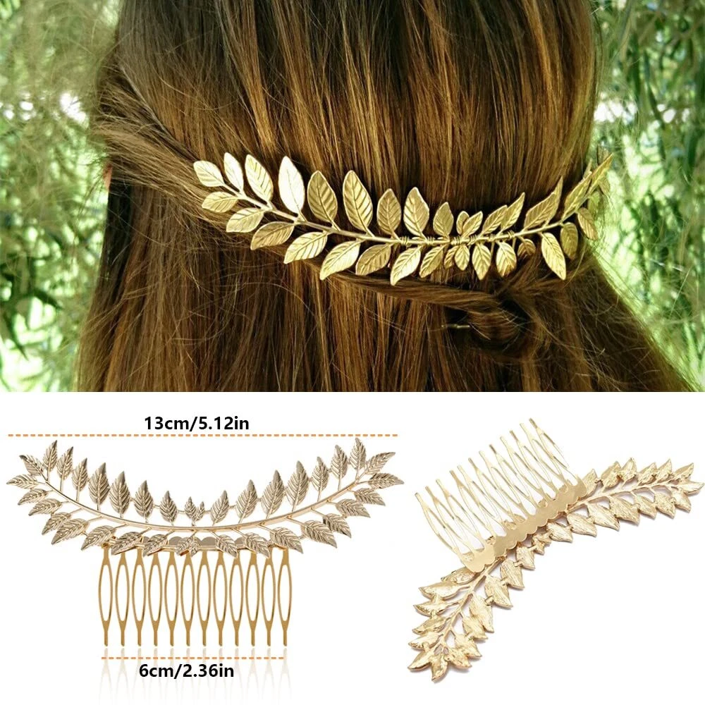 - Romantic Goddess Hair Comb Set - Package includes 6 different golden hair side combs in butterfly, laurel leaf branch and french twist shapes. Vintage palace styles hair comb set to make hair decoration different every day - Durable Metal Material - Well made of durable alloy metal, and the welding process fixes the decoration and the comb tightly is not easy to break or separate. The teeth are not easily broken after repeated adjustment, and can be used for a longer time - More Sizes To Choose From - The leaf hairpin set consists of 5/10/12/15 teeth, you can choose to fix or decorate according to your different hairstyles. Lightweight and versatile side comb for women of all ages from teens, kids, adults, with more possibilities - Suitable For All Hairstyles - Whether you have thick curly hair or long straight hair, childlike and thin hair, a high-quality alloy tooth comb can adjust the gap between the teeth to make it firmly wear on the head without falling out easily - More Occasions Are Needed - A romantic French retro hair clip for all occasions - weddings, anniversaries, proms, graduations, or as a gift for those closest to you, it's also a great choice for everyday wear Product Description 6 Pack Vintage Gold Metal French Twist Hair Side Combs Clip With Teeth Grip Clasp Pins for Women Bridal Wedding Decorative Headpiece SPECIFICATION Quantity: 6 PCS Color: gold Material: alloy metal Shape: butterfly, laurel leaf branch and french twist Approx size: Glossy twist hair comb - 11cm/4.33in Point twist hair comb - 12cm/4.72in Large leaf hair clip - 13cm/5.12in 2 pieces leaf hair clip - 10cm/3.94in Single piece leaf hair pin - 9cm/3.54in Butterfly hair pin - 4cm/1.57in SOME QUESTIONS YOU MAY WANT TO KNOW Q1: I'm always annoyed by not getting the right hair accessories for my thick/thin hair Answer:The alloy material allows the teeth to be repeatedly adjusted to the left and right to be fixed on the head and not easy to fall off. Q2:A single style prevents me from having too many choices when it comes to clothing matching Answer:The set contains 6 different styles of hairbrushes with 5/10/12/15 teeth to match a variety of hairstyles. Q3:I'm worried that it won't last long after I buy it, or I'll receive a damaged package. Answer:Metal material makes it last longer.