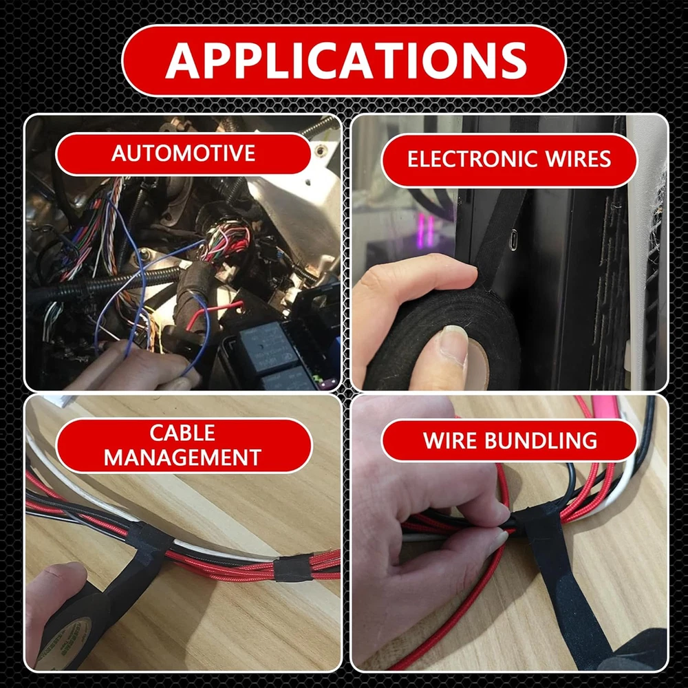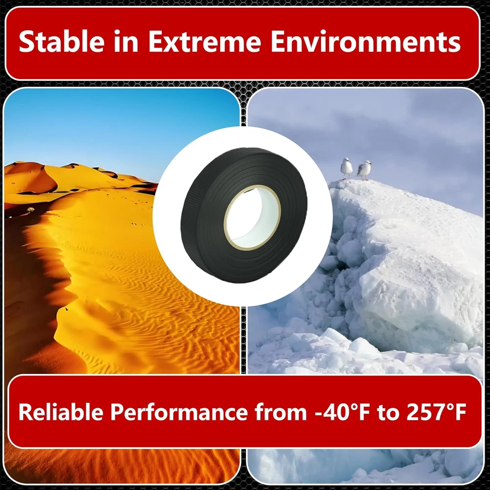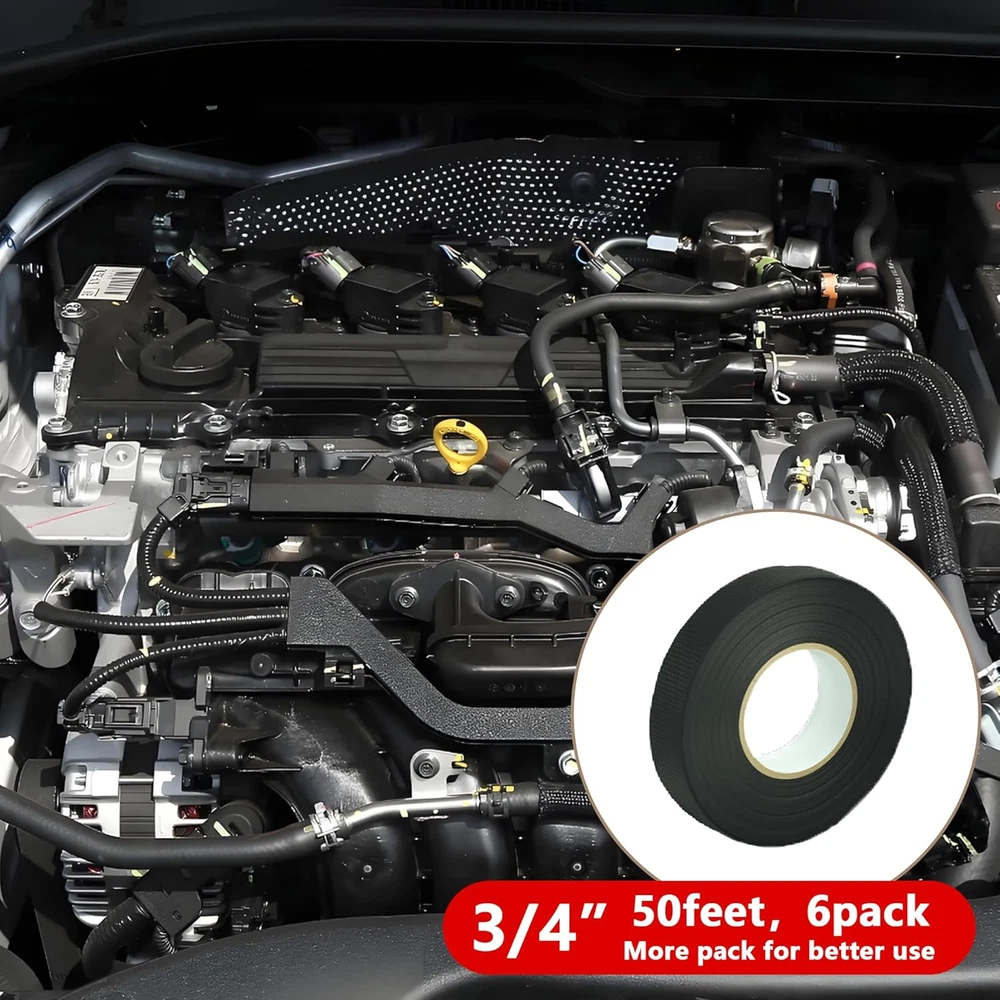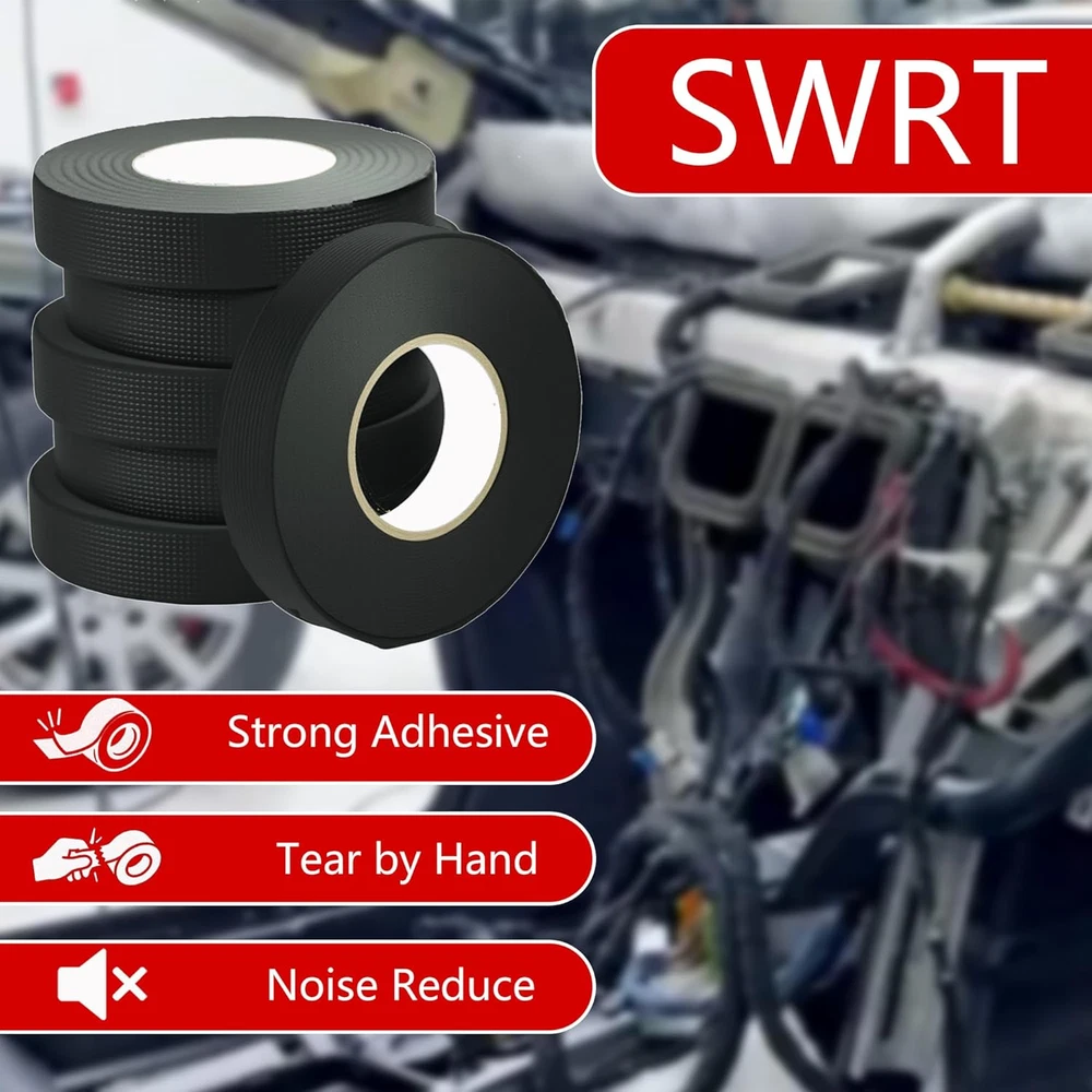 【High Temperature Resistance】: Designed to withstand high temperatures (-40°F to 257°F), this wire harness tape is the perfect solution for automotive wiring, including engine and dashboard wire harnesses. It helps insulate cables and improve the longevity of your wires. 【Extra Noise Reductio】: This wire harness tape is made of a felt-like material that effectively reduces noise caused by wire harnesses colliding with each other. It is not only suitable for use in automotive wire harnesses, but can also be used for wrapping wires in daily life. 【Tear by Hand】: Perfect for all your wire wrapping needs. Whether you're working on automotive circuits or home appliances, simply tear and apply the tape by hand for a smooth, professional finish without the need for extra tools. 【Durable & High-Performance】: Our wire wrap tape features a strong, heat-resistant adhesive that can last 6 years or 150k miles. It performs exceptionally well in automotive environments, providing heat insulation and wear resistance to keep your wires protected. 【Professional Grade】: The tensile strength and appearance of this wire harness tape is similar to the OEM tape, but is superior in thickness, adhesion and durability. By using this tape, you can achieve both a professional appearance and professional performance. Product Description How to choose 6 pack The 6-pack is great for wiring jobs needing 10-30 meters of tape. It's perfect for small projects or quick repairs, like bundling wires in compact cars. 12 pack The 12-pack is ideal for wiring jobs needing 30-60 meters of tape. It covers the full wiring harness of a mid-size vehicle or is great for daily use in professional repair shops. This pack offers better value for money. Compare to our other products Customer Reviews 4.2 out of 5 stars 27 4.1 out of 5 stars 19 4.3 out of 5 stars 33 4.2 out of 5 stars 22 Price $7.99 $ 7 . 99 $14.99 $ 14 . 99 $7.99 $ 7 . 99 $14.99 $ 14 . 99 Package 6 12 8 16 Noise Reduction Strong Strong Weak Weak Self Adhesion ✔ ✔ ✔ ✔ High Temperature Resistance ✔ ✔ ✔ ✔ Strength Medium Medium Strong Strong
