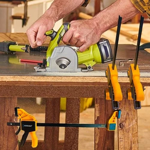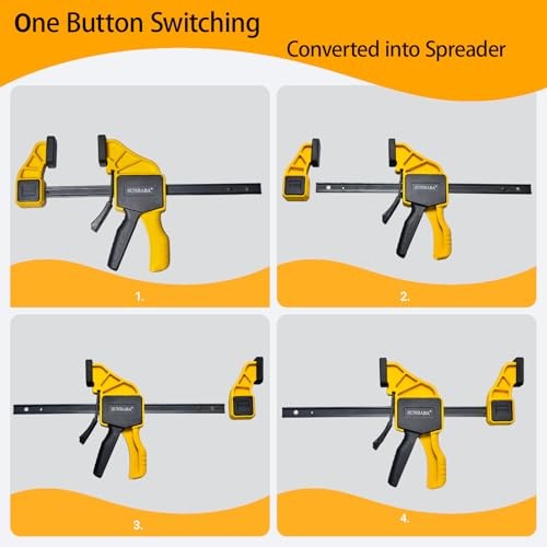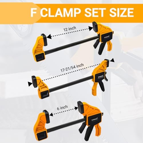 Return Policy Fast Delivery Trusted seller 6 Pack Clamps for Woodworking 12”(4)&6”(2) Light Duty One-Handed F Clamp/Spreader Bar Clamps Set 150LBS Load Limit with Quick Change Button Product Description 【Packaging Information 】-Bar clamp set included:4 pcs 12 inch bar clamps and 2 pcs 6 inch bar clamps which is a great choice for woodworking enthusiasts, you will never feel you've had enough clamps. 【High Quality Materials】-The bar clamps are made of high quality nylon material,The bar adopts high frequency heat treatment of I-steel which are firmly clamped and does not slip or bend. 【Quick Functional Design】-The wood clamps can be quickly moved and released with one hand that can greatly improve your work efficiency.In addition, the fixed end can be quickly replaced at the press of a button,and the required spreader function can be obtained when change the fixed. 【High Clamping Force】-The bar clamps have a clamping force of up to 150 pounds and a maximum of 12 "/6" which can meet your most home repair,also is the perfect gift choice to your family or friends. 【Comfortable Ergonomic Handle】-The woodworking clamps have an comfortable ergonomic handle, It will not make your hands feel tired when you use it for a long time.The grain design of the handle can prevent slippage when applying force. Shipping Returns Payment Shipping Shipping is FREE to all addresses other than APO/PO boxes in the lower 48 states. All our stock ships from US-based warehouses. Shipped via USPS or UPS (depending on location and package weight) Unless stated otherwise, all orders will ship within 24-72 hours of your payment being processed. Check our feedback to see the great reviews of FAST shipping we offer. Returns Seller does not accept returns Payment We currently accept payment via eBay managed payments only. Once payment is cleared, we will dispatch your shipment within 1-3 business days. Please refer to the "Shipping" tab for more information regarding shipping speed to your destination.