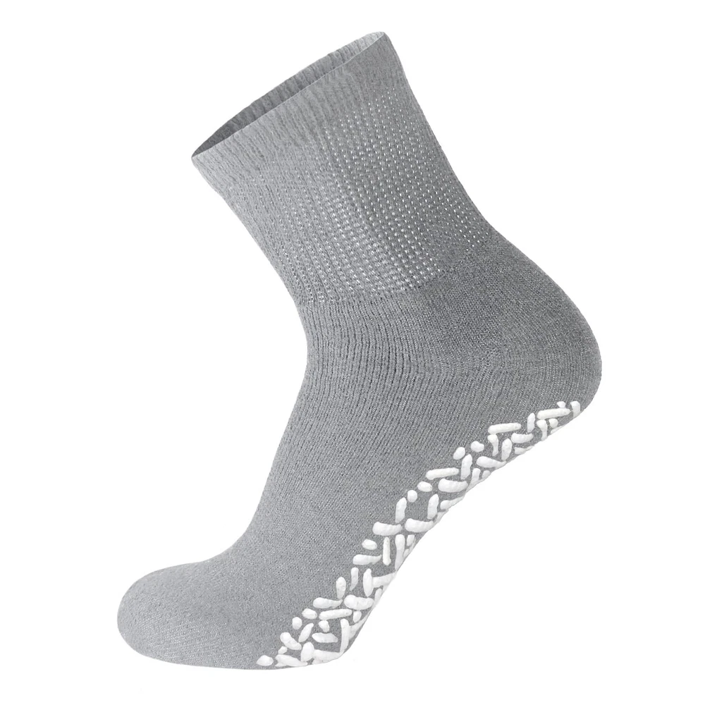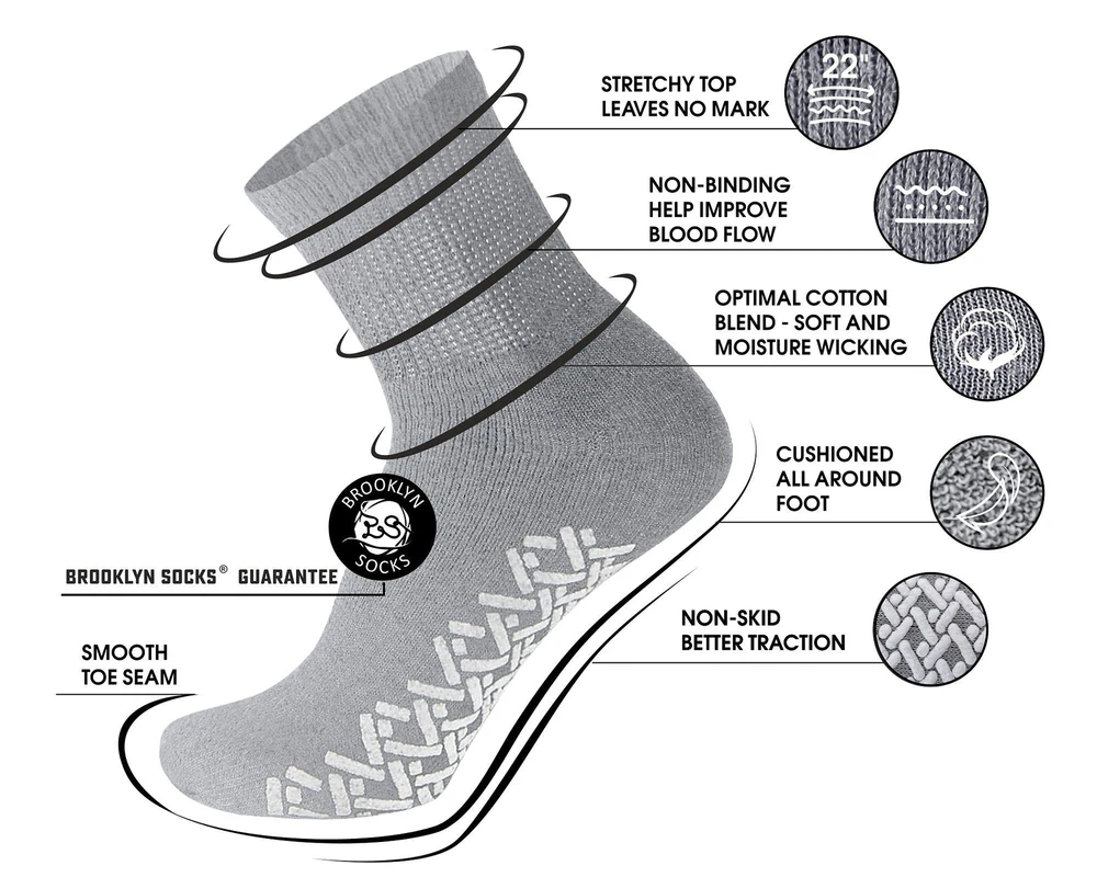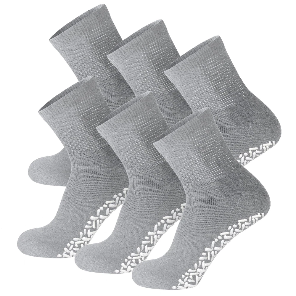 Non-Skid Diabetic Cotton Quarter Socks with Non Binding Top is a go-to pair for sensitive feet. Loose fitting non-binding diabetic socks feature rubber grippers on the sole for improved stability and balance on smooth surfaces. Perfectly suits for wearing in hospitals and senior care facilities. Made of high quality cotton to be soft against the skin and prevent blisters and irritations. SIZE CHART: ✅Medium Size (10-13) fits US Shoe Size Men 8-10.5/Women 9.5-11.5 ✅Large Size (13-15) fits US Shoe Size Men 11-12.5/Women 12-14 ✅Small Size (9-11) fits US Shoe Size Men 6-8/Women 6.5-9.5. Non-Skid Diabetic Cotton Quarter Socks with Non Binding Top are available in packs of 3, 6 and 12 pairs. SKID RESISTANT NON-SLIP SOCKS: Non-Skid Diabetic Cotton Quarter Socks are soft slipper socks with grippers for improved stability and balance. Gripping rubber treads provide maximum traction on nearly any surface ensuring foot safety. Perfect diabetic socks to wear in hospitals and senior care facilities thanks to non-skid sole and comfy quarter length. NON BINDING LOOSE FIT: Cotton quarter length diabetic socks are specially designed for delicate and sensitive feet. Socks are loose fitting featuring non-binding wide top band that easily slips over swollen ankles without constricting the leg. Recommended for people with circulatory problems symptoms of diabetes, edema, and neuropathy. HIGH QUALITY COTTON FABRIC: The socks are made of high quality cotton blend fabric (90% Cotton 7% Polyester 3% Elastane) to provide maximum breathability for the foot. As natural sweat absorbent cotton helps to keep feet dry and prevent blistering. Diabetic socks are soft against the skin to reduce any rubbing allowing you to experience extreme comfort while wearing. COMFORTABLE AND VERSATILE: Our non-slip diabetic ankle socks offer a combination of quality, comfort, and versatility. They are easy to wear and protective from slips. Perfect for and lounging around the house all day long or sleep in. Ideal as hospital socks, socks for elderly care, maternity labor delivery, and yoga or pilates.