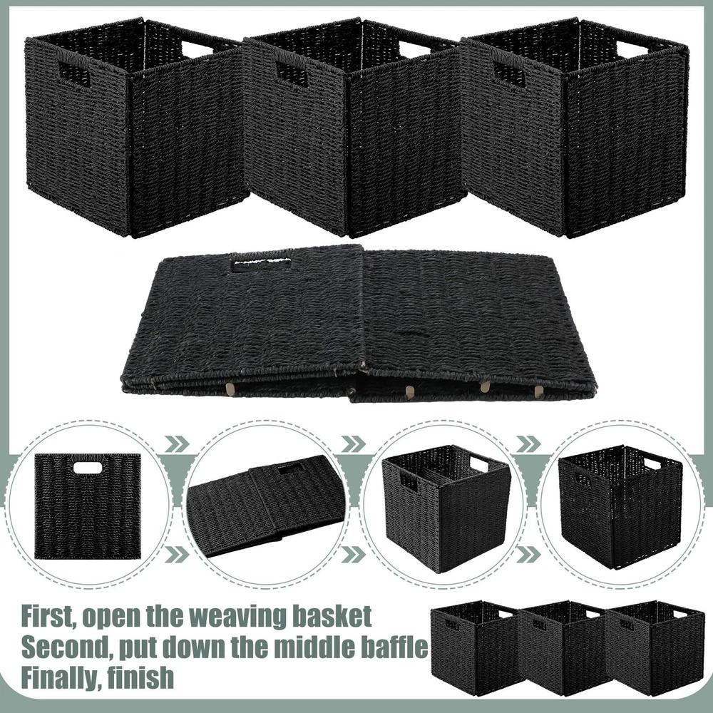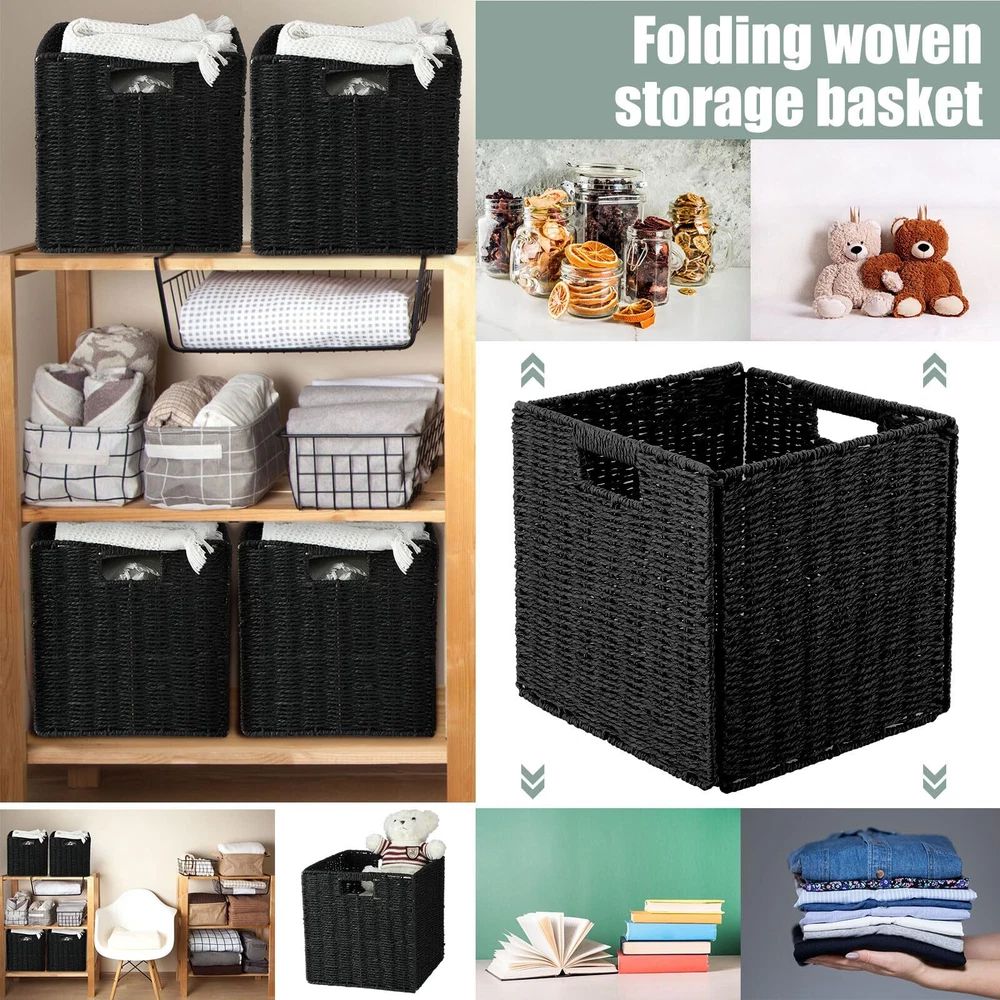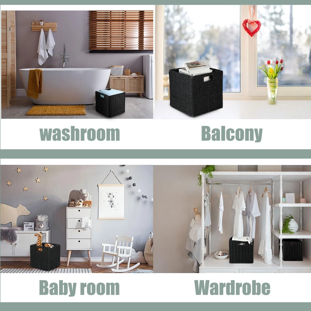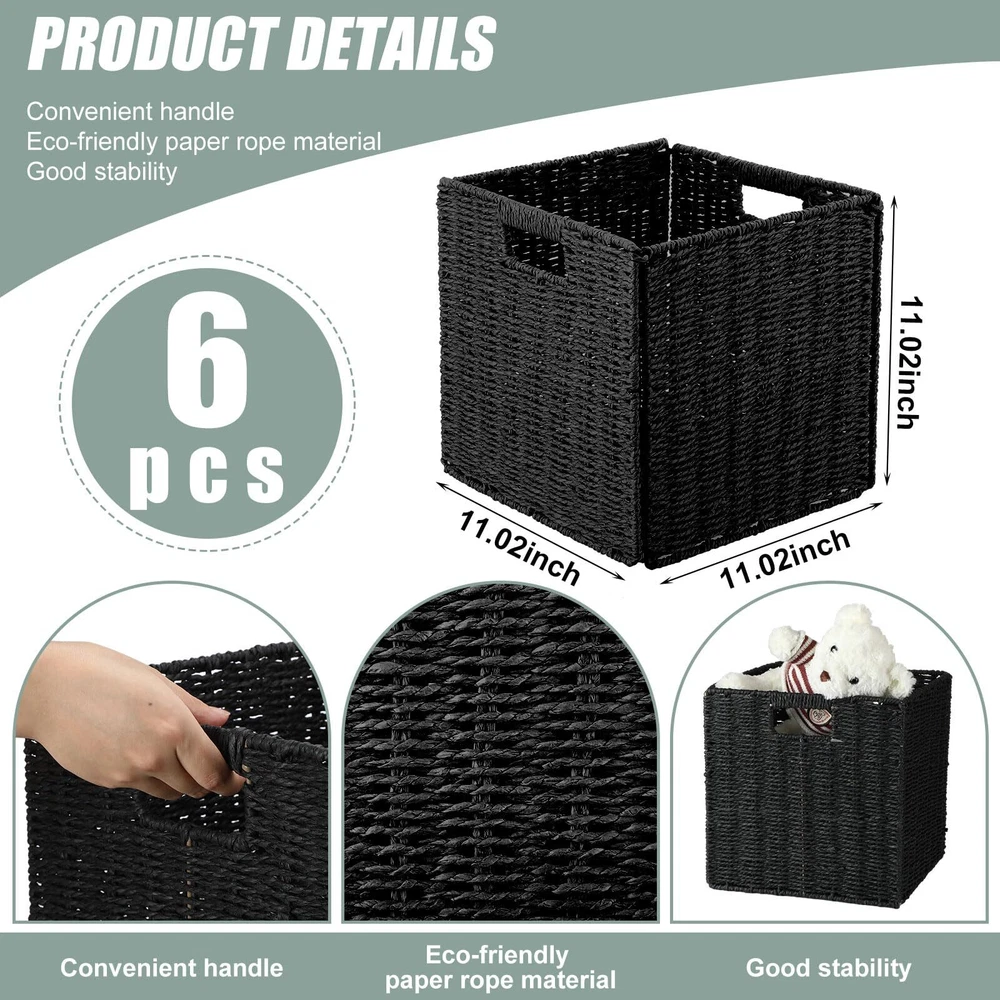 Features: Long time service: You can keep the black cube bins for a long time, as it is solid and stable, not easy to bend or break, with 2 handles easy for you to carry, and you can also share the baskets with your families to deliver organizing convenience. Wide applications: The square baskets for storage can be applied to hold a slew of items, such as clothes, blankets, towels, toys, tools, and more, suitable for you to place on the shelf, in the bedroom, under the bed, in the kitchen and more, effectively store items and keep house tidy. Specifications: Material: paper rope, metal Color: black Size: about 11 x 11 x 11 inches/ 28 x 28 x 28 cm Package includes: 6 x Large storage basket Notes: Manual measurement, please allow slight errors on size. The color may exist a slight difference due to different screen displays. Adequate Storage Sets: you will receive 6 pieces of foldable storage baskets, practical tools for organizing your items, suitable for you to share with your friends, families, or send to others as gifts Square and Large: our cubby storage bin is about 11 x 11 x 11 inches/ 28 x 28 x 28 cm, large and tall for you to store plenty of items, such as clothes, towels, blankets, toys, sports equipment, pets products and more, saving space for your house Quality Material: our woven baskets for storage are made of paper rope material, with hard metal frames supporting inside, not easy to break or tear, foldable and portable; Please use soft and dry cloth to wipe the basket, but not use water to wash or immerse it in the water Space Saving and Convenient: the large square basket is lightweight and portable for you to take, with handles for easy carrying, which can help you organize your clothes and save more space, keeping your house orderly and tidy Multiple Purposes: you can use this modern weave storage bin for bedroom, study, living room, kitchen, bathroom, and more places, helping you organize your clothes, and you can also use it as a house decoration to hold bouquets to create a rustic touch