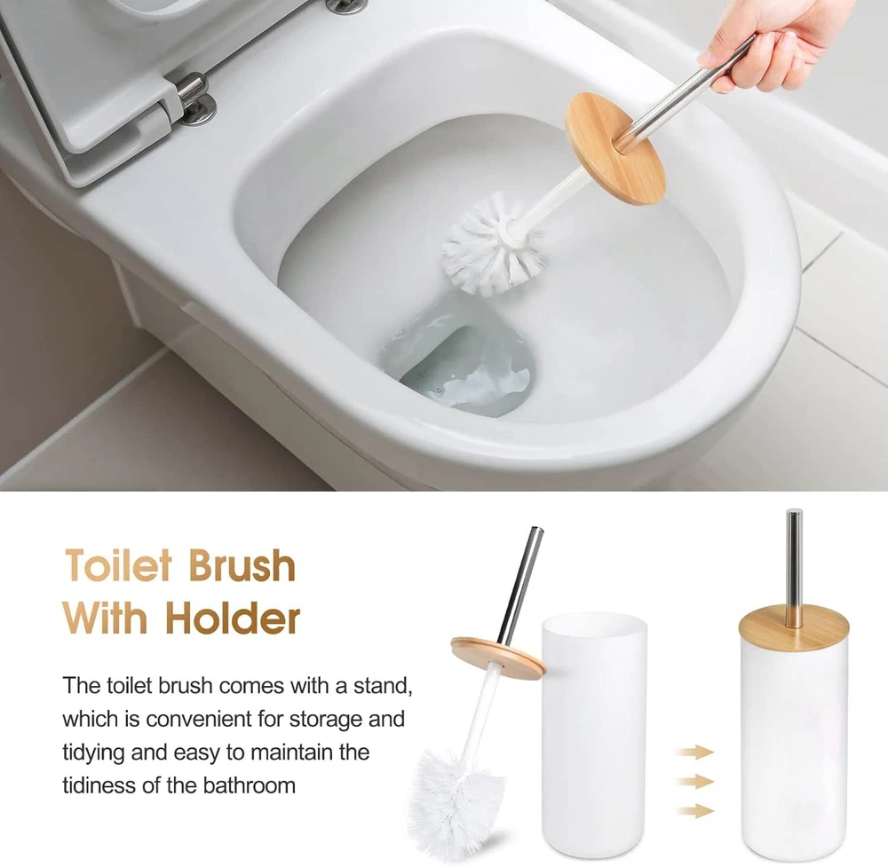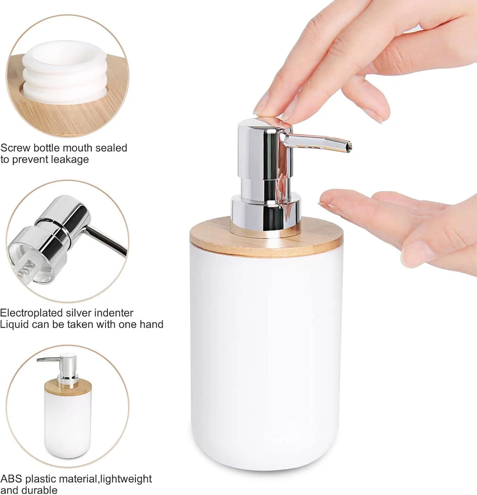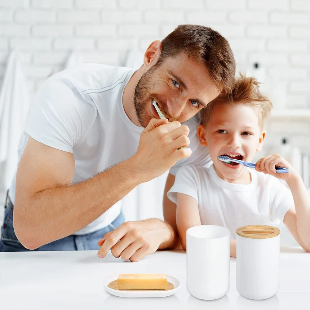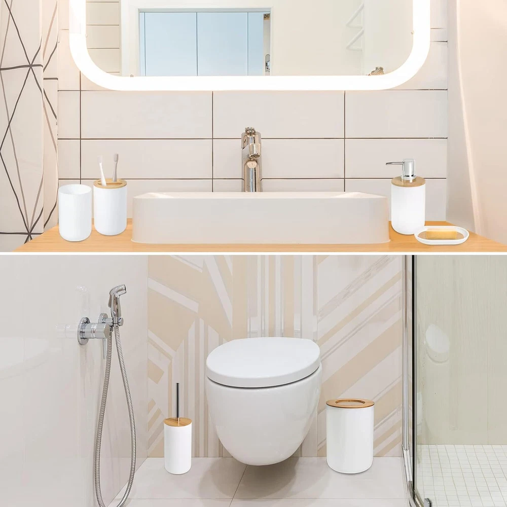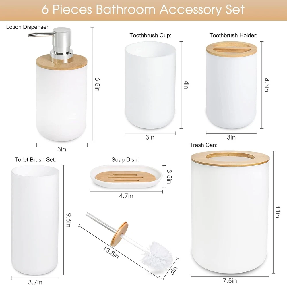 6 Pcs White Bathroom Accessories, Bamboo Includes Product Details Number of Pieces: 6 Finish Type: Abs,Bamboo,Resin Manufacturer: DESIYUE Package Dimensions: 10.87 x 7.99 x 7.87 inches Item Weight: 2.29 pounds Country of Origin: China Item model number: 0 Fabric Type: Plastic,bamboo Finish types: Abs,Bamboo,Resin Batteries required: No Material: Bamboo Color: White Brand: DESIYUE Style: 6pcs-White -Bamboo Included Components: Toiletbrush Plastic,bamboo Bathroom Accessories Sets:6 pieces white bathroom accessories includes:1 Soap Dispenser, 1 Toothbrush Holder, 1 Toothbrush Cup, 1 Soap Dish,1 Toilet Brush Holder,1 Trash Can.The bathroom essential organizer set helps you to properly decorate your restroom and save valuable space. Durable and High- Quality:This 6-Piece Bathroom Accessory Set is made of durable ABS and high-quality wood, and a coat of heavy resin. Our high quality bathroom accessories light and durable, keeping their look just as elegant and new over time. Fashion Storage:Our high quality bathroom accessories light and durable, keeping their look just as elegant and new over timeDecorate your bathroom, keep your bathroom clean, tidy and orderly.The overall color scheme makes your bathroom look cleaner. Easy to Clean and Assemble:Smooth finish makes it easy to wipe down or hand wash residue.It is extremely simple to assemble our bathroom set and because of it’s sleek, cleaning it is easy and quick. Stylish Design:Elegant design makes the bathroom bathroom accessories ideal for modern bathrooms, it's an attractive decor and bring extra elegance to your bathroom. It is suitable for home, bathroom, dormitory, hotel, apartment, washing room, basement, RV and etc. Also perfect for giving as housewarming, Mother's Day or wedding gift.