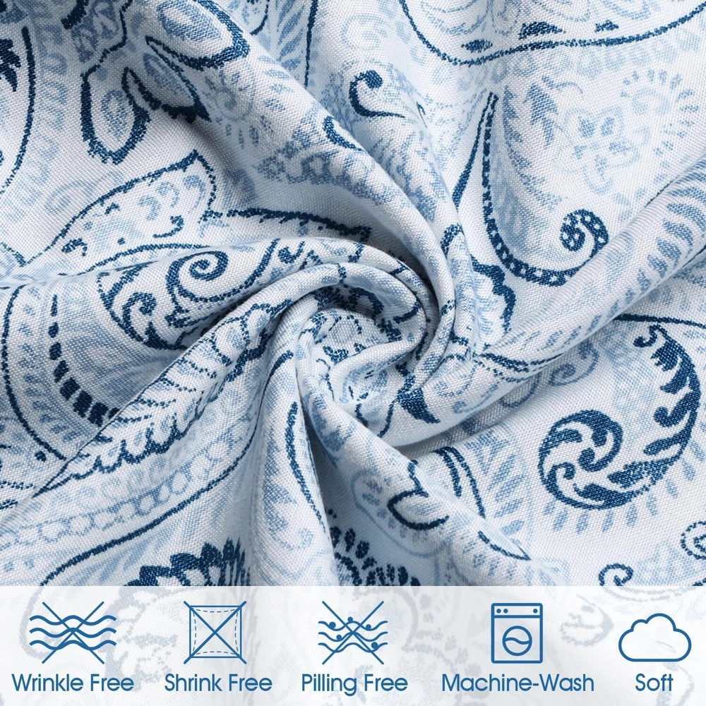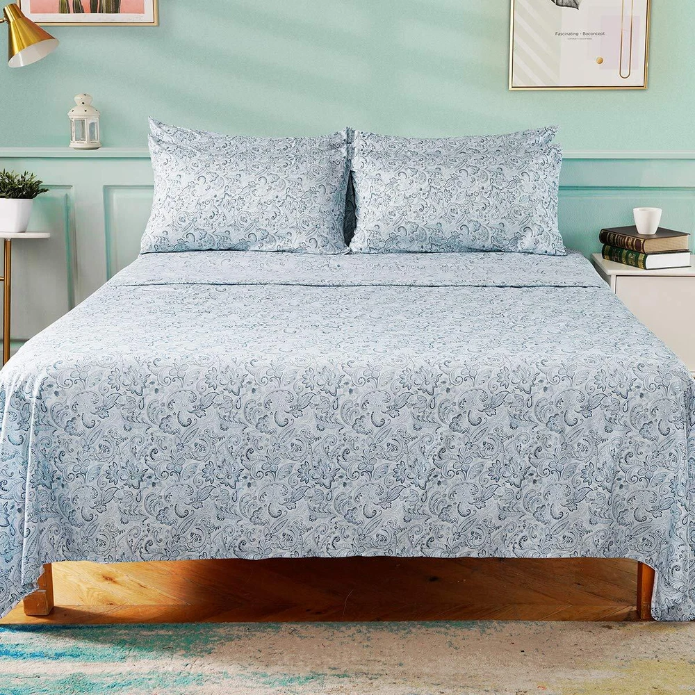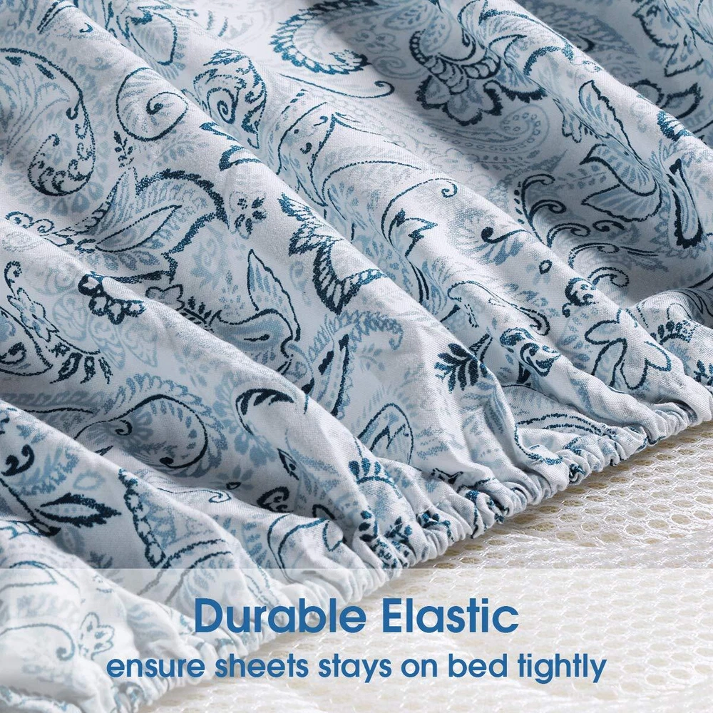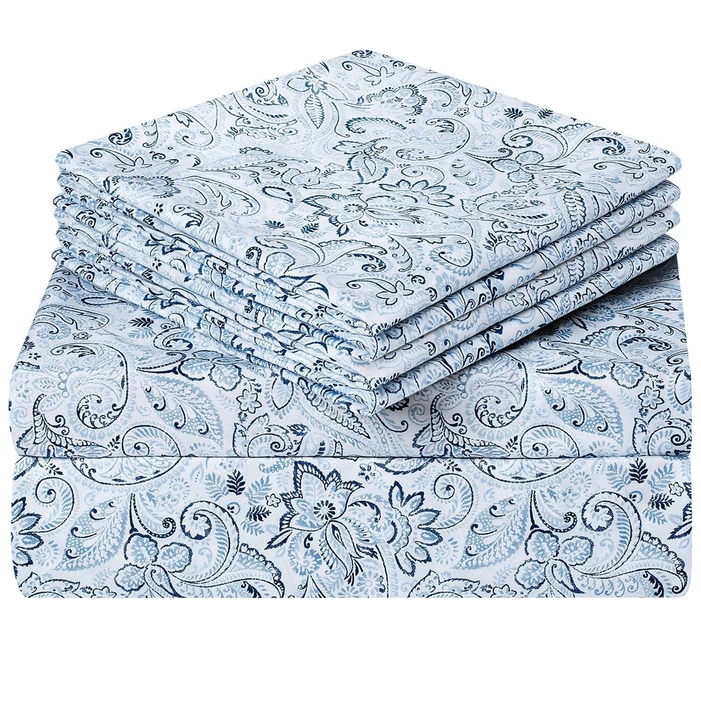 6 Piece Printed Queen Size Bed Sheets, Extra Soft Brushed Microfiber 1800 Bedding Pattern Sheets, Deep Pocket, Wrinkle & Fade Free, Blue Paisley 6 PIECE PRINTED BED SHEET SET QUEEN - 1pc flat sheet (90"x102"), 1pc fitted sheet (60"x80") with 15" deep pocket, 4pcs pillowcases (20.5"x31"). Deep pocket fitted sheet with elastic all around to ensure sheets stays on bed tightly. DEEP POCKETS - Fits mattresses up to 15" deep with elastic around the fitted sheet. Attentive design to make the sheets stick tightly to your mattress. No more worrying about waking up with messy sheets. PREMIUM QUALITY - Made of highest quality microfiber materials and printing technology, luxury printed sheets are both practical and ornamental. Double brushed increase ultimate smoothness and softness for a sweet night. EASY CARE - Machine wash in cold water, tumble dry or iron on normal temperature, do not bleach. No fading, no shrinking, and no wrinkling. SATISFACTION GUARANTEE - We are committed to providing our customers with the best service. Any quality problems, please feel free to contact us and we will help you out and give you a satisfied solution. Nothing to lose so ORDER NOW and also buy for your loved ones!