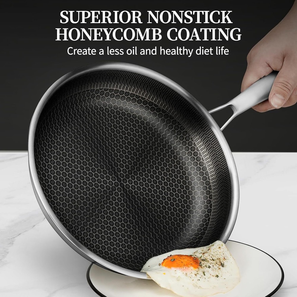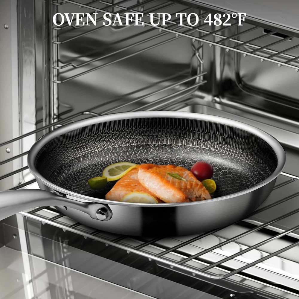6 Pieces Stainless Steel Frying Pan Set with Lids, 8+9.5+11 Inch, Silver Product Details Brand: CADIVIZZO Material: Stainless Steel Special Feature: Gas Stovetop Compatible, Induction Stovetop Compatible Color: Silver Product Care Instructions: Oven Safe, Dishwasher Safe Handle Material: Stainless Steel Item Weight: 10.4 Pounds Is Oven Safe: Yes Is Dishwasher Safe: Yes Manufacture Year: 2023 Product Dimensions: 11 x 11 x 5 inches Item Weight: 10.36 pounds Manufacturer: CADIVIZZO 【Super Nonstick Honeycomb Coating】The stainless steel frying pan with lids adopts honeycomb laser-etched process with a full-coverage non-stick coating, makes the entire bottom and side walls of stainless steel frying pan are covered with micro-convex grain, reducing the contact area between food and the bottom of the nonstick pan,improving the nonstick performance of the non stick pan. Even if less oil, The foods slide over smoothly from the surface of dosa pan without effort 【Healthy and Safety Stainless Steel Frying Pan】Stainless steel skillet set are made of food-grade stainless steel, which is very durable and corrosion-resistant, and won't react with food, ensuring healthy cooking. Our cookware is dedicated to a healthier lifestyle for you and your family 【Super Nonstick Honeycomb Coating】The stainless steel frying pan with lid adopts honeycomb laser-etched process with a full-coverage non-stick coating, makes the entire bottom and side walls of stainless steel frying pan are covered with micro-convex grain, reducing the contact area between food and the bottom of the nonstick pan,improving the nonstick performance of the non stick pan. Even if less oil, The foods slide over smoothly from the surface of dosa pan without effort 【Compatible with All Stoves】The Stainless Steel Frying Pan has 430 high magnetic conductive stainless steel base, works well on induction stove top, gas stove top, electric cooktop, glass stove, ceramic stove. Dishwasher safe and Oven safe up to 480°F 【Heat Up Quickly and Evenly】The Stainless Steel Frying Pan with lid is made of aluminum alloy core, thickened bottom and wall make the whole stainless steel nonstick pan heats up quickly and evenly, The flat stainless steel nonstick pan is evenly distributed on the centered of the non stick frying pan