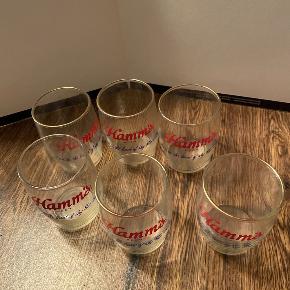 The product is a set of six rare Hamm's beer “Born in the land of sky blue waters” glasses showcasing the iconic brand's logo and theme of breweriana. Made in the United States, these vintage glasses are a collectible piece for fans of Hamm's beer and collectors of unique brew memorabilia. Perfect for serving drinks or displaying as a nostalgic piece of American beer history.