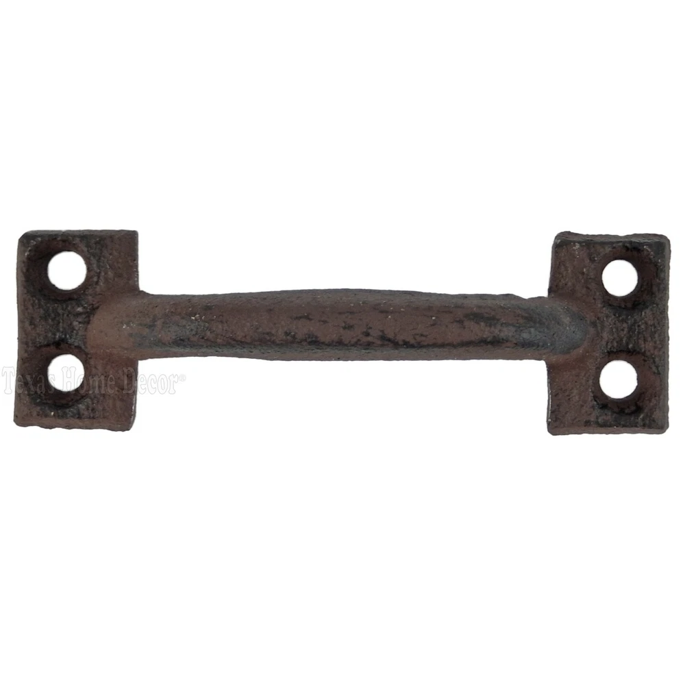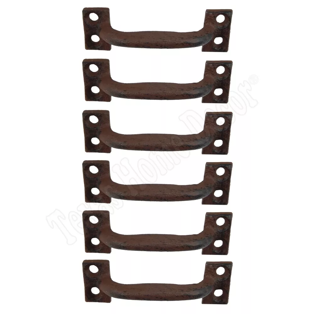 6 Small Antique Style 3 5/8" Door Handles #0016 Lot of 6 new handles Made of cast iron with a rustic brown finish Measures 3 5/8 inches in total length by 1 1/8 inch wide at the base Each handle comes with 4 mounting holes Mounting screws are 3 inches apart Has a finger space of 3/4 inches Great for rustic cabinetry or drawers Screws not included