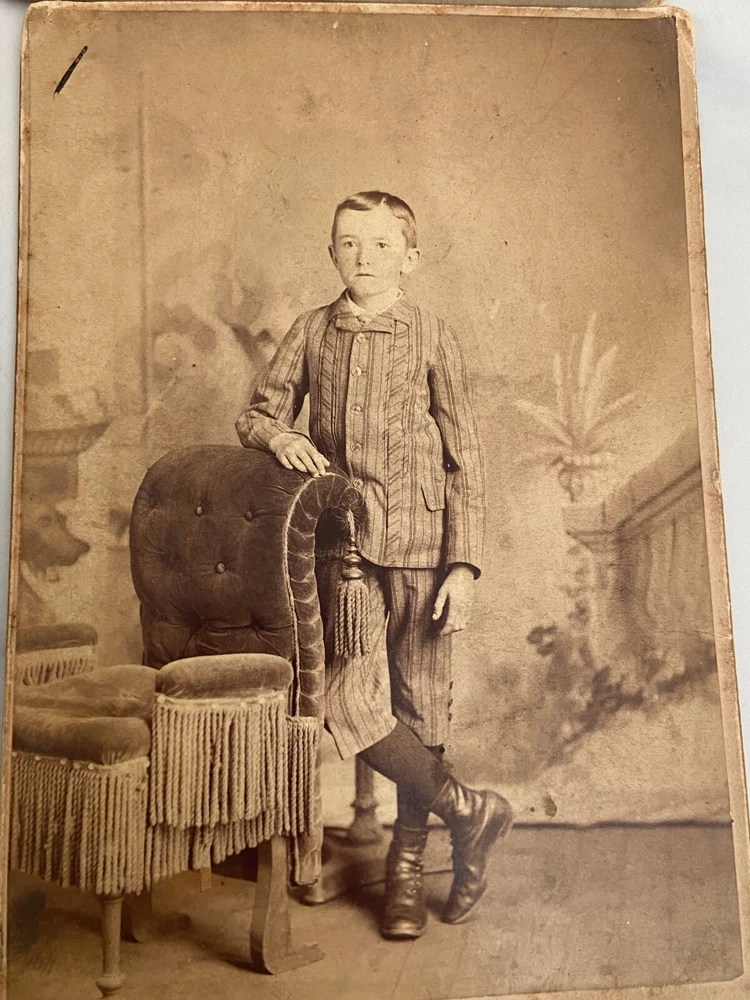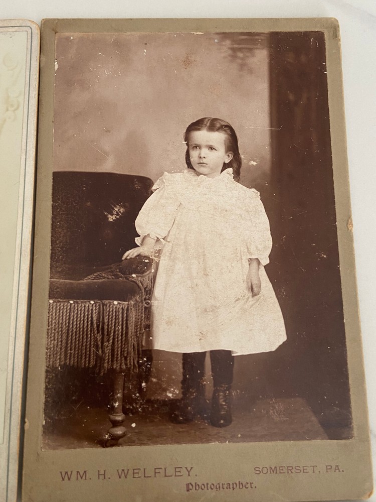 Cabinet cards are photographs mounted on stiff pieces of cardboard. They were introduced in the 1860s. The front of the card is usually printed or embossed with the photographer’s details, and the back of the cabinet card is often printed with elaborate designs. The popularity of the cabinet card waned around the turn of the century, particularly after the introduction of the photographic postcard, but they were still being produced right until the First World War. The color of the cardboard mount can also help date the photograph. Cream mounts were always popular, but bolder, dark colors like black, dark brown, green or burgundy began to appear in the 1880s and 1890s. All in really good shape except for the CC Hough photograph of an infant - it has damage to lower left corner.