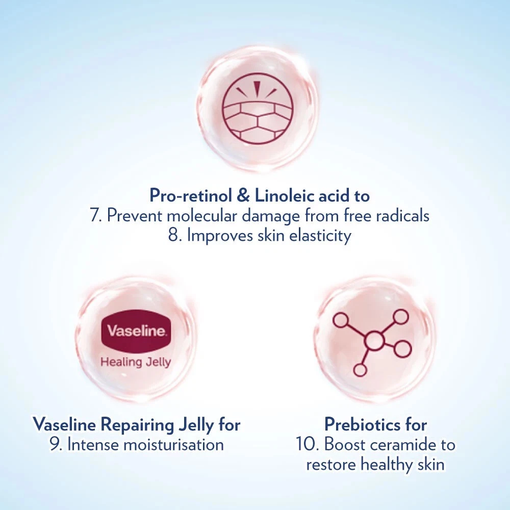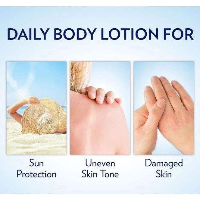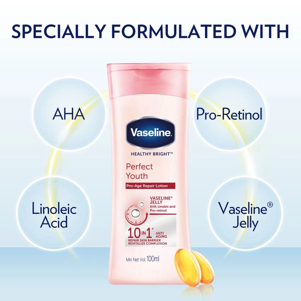 Product Details: Vaseline Healthy Bright Perfect Youth E 100ml Quick Overview: Vaseline® Healthy White Perfect Youth™ Body Lotion restores 10-in-1 anti-aging skin benefits: Contains AHA and Pro-Retinol to help reduce fine lines and first signs of aging while boosting collagen and increasing skin elasticity. Visible Skin Lightening. Even Tone Reduction. UVA & UVB Protection. Dark Mark Reduction. Boost Radiance. Leaves skin firm and tight. Visibly reduce fine lines. Deep nourishment. Intense moisturisation. Skin renewal. Contains Vitamin B3 that helps skin look brighter by working deep inside the skin - inhibiting melanin transfer to help reduce the appearance of wrinkles, uneven tone and dark spots. Micro-droplets of Vaseline® Jelly restore damaged skin from deep within. Non-greasy and absorbs fast to leave skin feeling soft and smooth. Best For : Aging Skin, Uneven Skin Tone, Dull Skin, Damaged Skin Direction for Use: Apply Vaseline Healthy Bright Perfect Youth to your hand and spread across your body until absorbed. Use twice a day for best results. Apply thoroughly to avoid product rubbing off on clothes. Caution: 1) Do not stay long in the sun even while using a product with sunscreen. 2) Store product away from sunlight. 3) In the unlikely event of skin irritation, stop using and consult a doctor immediately.