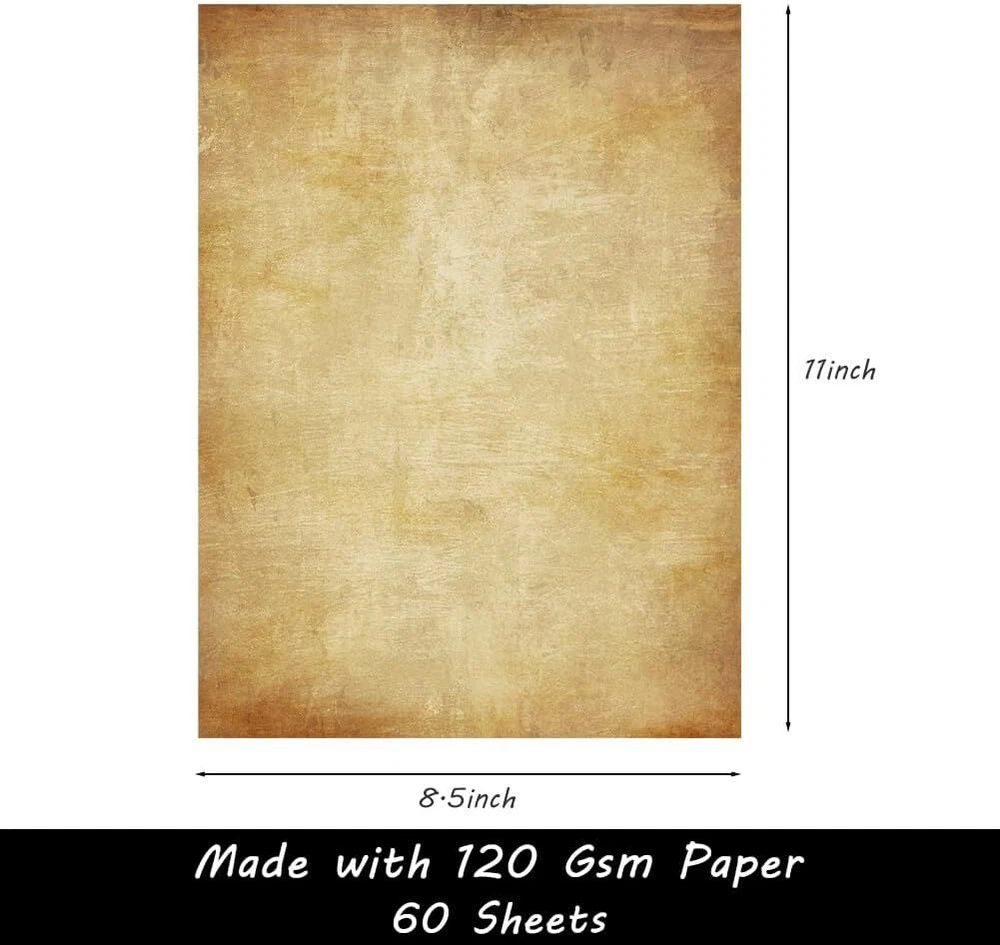 60 PCS Old Fashioned Faux Parchment Paper Aged Paper Antique Looking 8.5 x 11 Vintage Antique Design: Experience the charm of our vintage antique design writing paper, featuring a timeless aesthetic that adds a touch of elegance to your letters, invitations, and crafts. 60 Sheets of Premium 120GSM Paper: Indulge in the abundance of 60 sheets, each crafted with premium 120GSM paper that is thicker than normal printer paper. Experience exceptional durability and a luxurious feel with ample space provided by the classic 8.5 x 11inch size. Versatile Usage: Perfect for a wide range of applications, including certificates, invitations, resumes, awards, diplomas, crafts, and more. Let your creativity flow on our thick and sturdy letter paper. Printer Friendly: Our printing paper is compatible with both inkjet and laser printers, making it convenient to print your designs, text, or artwork directly onto the paper. 8.5 "w x 11.0 "w. Weight: 13.1 oz Style A - 60 Sheets Paper Size 8.5-x-11-inch Inches Product Dimensions 11"L x 8.5"W Sheet Count 60 Sheet Size 8.5-x-11-inch Inches Item Dimensions L x W 11"L x 8.5"W