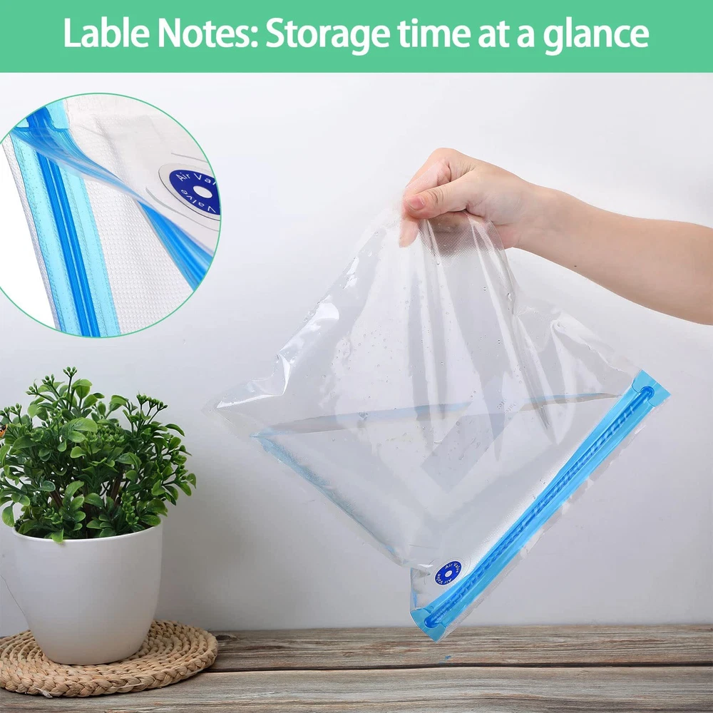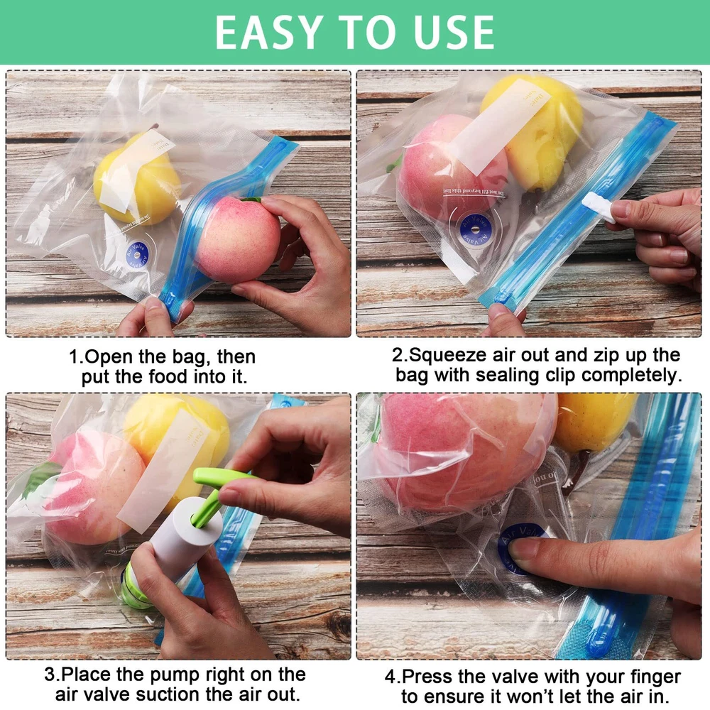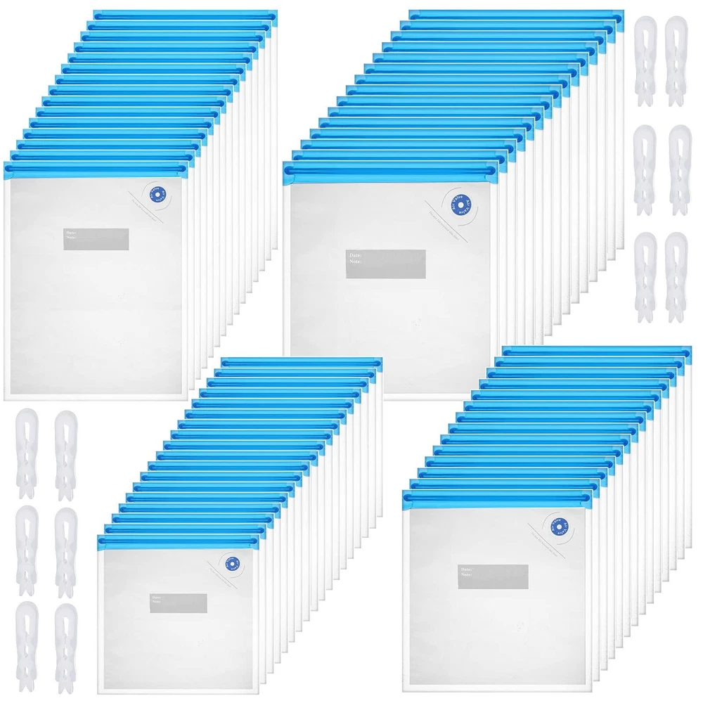 Features: Different sizes: These bags can be served for different types of foods, more convenient and multifunctional, slow down foods spoilage and keep foods delicious. Preservation design: Our vacuum bags feature strong sealing without leakage. Specifications: Material: plastic Color: transparent Size: respectively approx. 8.7 x 8.3 inch, 10.2 x 11 inch, 10.2 x 13.4 inch and 11.8 x 13.4 inch Package includes: 60 x Sous vide bags 10 x Sealing clips Notes: Manual measurement, please allow slight errors on size. Serving the food volume should not exceed the bag prompt line, the clip sealing can slide back and forth several times, and the blue disc cannot be torn. Reusable Material: sous vide bags are made of PEVA with good flexibility, no cracking, no deformation; The reusable storage bags are practical and reusable, you can buy and use them with confidence Leak Proof Design: vacuum sealer bag for food has double leak proof zipper, which is waterproof and serviceable, reliable for keeping food fresh and your freezer clean and neat Simple Operation: take just few seconds to vacuum reusable sous vide bag, seal it by applied white clips, and pump out the air through the valve, then start cooking or food storing Package and Size Details: this package comes with 60 pieces reusable vacuum food storage bags in 4 sizes, they are respectively approx. 8.7 x 8.3 inch, 10.2 x 11 inch, 10.2 x 13.4 inch and 11.8 x 13.4 inch, the package also comes with 10 sealing clips, the quantity is ample for your daily usage needs; They are suitable for store solid and semi solid foods, such as meats, vegetables, fruits, cereals, and they can also be served as storage bags for storing small items or daily necessities Daily Maintenance: the vacuum food storage bags are easy to clean with vinegar, dish soap and warm water then store them in a clean and dry place before using again