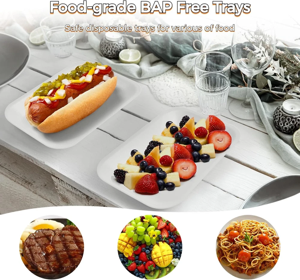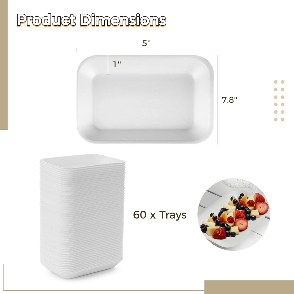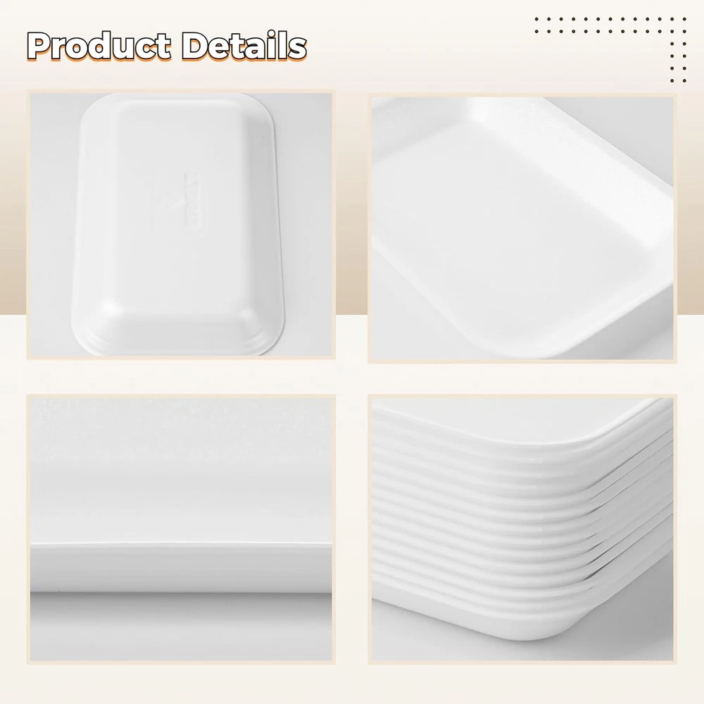 60 Pcs Crafts Foam Trays, White Supermarket one size, 8 x 4.7 x 1 in Product Details Material: Foam Brand: BATTIPAW Color: 8 x 4.7 x 1 in Special Feature: Durable Occasion: Birthday Style: Contemporary Shape: Rectangular Seasons: All Seasons Product Dimensions: 8"L x 1"W x 4.7"Th Recommended Uses For Product: Fruit, BBQ Grill Roast Food, Snacks, Meat Number of Pieces: 60 Product Care Instructions: Wipe with Dry Cloth Size: one size Finish Type: Polished Item Weight: 0.24 Kilograms Is Microwaveable: No Net Content Weight: 0.24 Kilograms Material Feature: Disposable Is Dishwasher Safe: Yes Included Components: Crafts Foam Trays Theme: food & handicraft Product Name: Crafts Foam Trays Pattern: White Manufacturer: BATTIPAW Unit Count: 60.0 Count Item Weight: 8.4 ounces Item model number: 731JH213NHABAFO2U92043EHI 【60PCS in Bulk to Meet Daily Needs】 Our economical tray set in bulk contains 60 pieces of white foam trays, which is sufficient for your daily needs and replacements in the family. You can also share these multipurpose trays with friends or neighbors in festivals or outdoor activities for food packing and DIY handicrafts. 【Durable & Lightweight Foam Tray】 With a proper size of 20 x 13 x 2.5cm / 8 x 4.7 x 1 in, our trays are made of ultra-light foam material, both suitable for school DIY handicrafts and food packages. They are thickly made to ensure a load-bearing capacity, featuring sturdy, press-proof, and not easy to deform and break. 【Food Grade BPA Safe Food Trays】 Without toxic substances and pollution, the eco-friendly foam material is food-grade and BPA free for holding or packing various foods like meat, vegetable, fruit, snack, etc. as simple package trays in a family, restaurant, supermarket, or hotel. Our trays are sterilized before being sent out, so please feel relieved to use them. 【Save Your Time & Labor】 Are you still annoyed with the numerous dirty dishes when holding a party meal or wedding banquet? You don’t need to prepare the food dishes and bowls in advance for snacks, meat, or fruit anymore with the help of these disposable trays. Just throw them into a waste bin after being used, which is convenient and saves your time and labor. 【Excellent for Kids’ DIY Handicraft】 Not just used as food trays, the trays can also be handicraft plates for graffiti painting or drawing for Christmas parties, Halloween parties, birthday parties, etc. Making personal drawings with creativity and imagination can exercise kids’ hands-on skills and enhance their brain development.
