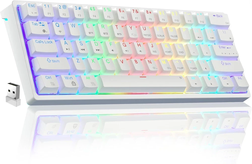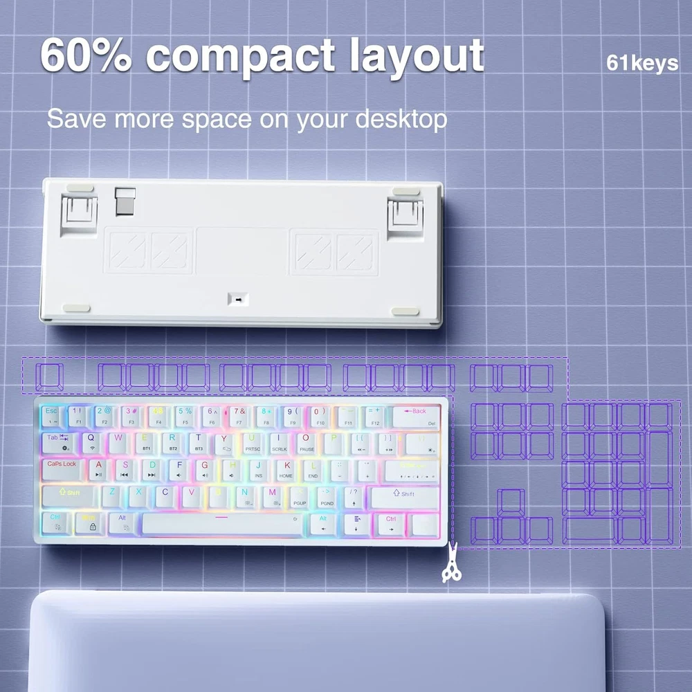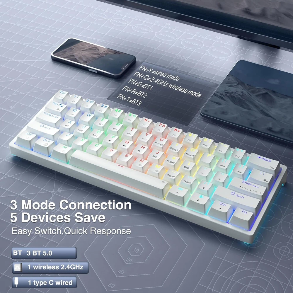 Product Description SK961 60 Percent Wireless Mechanical Keyboard with RGB Backlit,BT5.0/Wired/2.4GHz Wireless Gaming Keyboard for Laptop/pc (White,Red Switch) 3 mode connection:SK961 60 percent keyboard supports BT5.0, wired type C,2.4G wireless connection modes,and it supports saves 5 devices at same time. The wireless gaming keyboard compatible with multiple devices, user can freely connect with PC,laptop,Macbook,mobile phones etc 60% compact design:this 60% keyboard adopts ultra-compact ergonomic design. Perfect mini size which saves more space for your computer. Slim and lightweight design, easy to carry, small body with big battery, 2000 mAh rechargeable battery. It is a good choice for gaming, work,learning,travel Replaceable switch:Supports replacement 3-pin switch, compatible with cherry style hot-swap, 100% mechanical switches and keys. Replaceable function is easy to alter both keys and switches.All anti-ghosting keys ensure the highest accuracy of your commands in any use case RGB backlight and side light:This 60% wireless mechanical keyboard has 20 adjustable RGB lights and 10 RGB side lights that can be adjusted to different effects according to user's preferences. The bright lighting effects provide illumination in dark environments also increase the fun of using Programmable and Macro driver: the mechanical keyboard supports macro settings, user can customize the custom keyboard through custom software. User can reset RGB backlight and side light,key functions,macro settings. Customize the custom gaming keyboard according to user's preferences. This keyboard is widely compatible with Windows 7,8,10,XP,,VISTA,MAC OS, etc., USB interface is plug and play. It does not affect the use without downloading driver software About Us We are a reputable seller with many years of experience selling on eBay. Our goal is to provide high-quality products and excellent customer service. Shipping Items will be shipped within 1-3 business days when we received payment. (Orders are not processed on weekends & holidays) Tracking information will be sent once item is shipped. Delivery time depends on destination and other factors Item is shipped to ebay address. Leaving correct address can minimize delay. For international shipping and shipping to Guam, Hawaii and Alaska, Please contact us before placing the order. International buyers please note: Import duties, taxes and charges are not included in the item price or shipping charges. These charges are buyer’s responsibility. We will try our best to reduce the risk of the custom duties. Local pick-up is unavailable at the moment. Contact Us We reply any email messages within 1 business / working days(off-duty at weekend). If you do not get a response from us, then please check your junk or spam mailbox. Our Business hours: Mon-Fri 9:00-18:00, UTC/GMT +8 hours. Please contact us either by clicking "contact seller" in the "purchase history" section or simply click "ask a question" at the bottom of this page. If you are unsatisfied with our item or service, please contact us before leaving any feedback. We are committed to resolve all issues in a friendly and satisfactory manner.