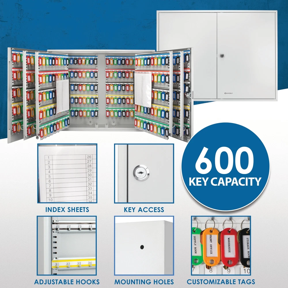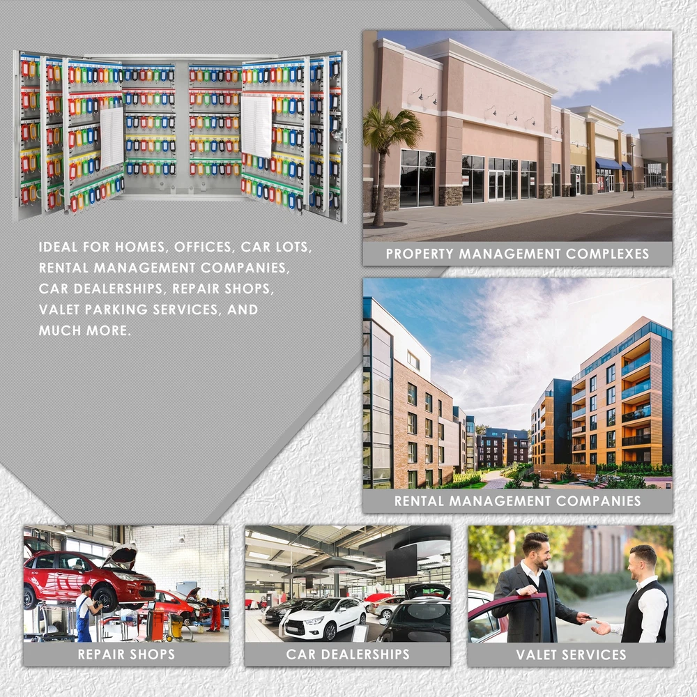 Specifications Place of Origin #originPlace# Main Color Gray Main Material Steel Dangerous Goods #dangerFlag# Dimensions & Weights Assembled Length (in.) 8.00 Assembled Width (in.) 28.75 Assembled Height (in.) 22.00 Weight (lbs) 56.50 Product Features ADJUSTABLE KEY CABINET - Secure wall mount lock box with adjustable racks for flexible key storage. Keep keys organized and easily accessible. ?✨ KEY LOCK - Organize and secure up to 600 keys with ease using our key cabinet equipped with a reliable key lock for added protection. ?️? COLORFUL KEY TAGS - Colorful key tags enable quick identification, no more fumbling for the right key. Stay organized! ?️? KEY MANAGEMENT - Efficiently manage and secure keys for various settings like homes, offices, and businesses with the convenience and reliability of a key cabinet. ?? WALL MOUNT - Comes with mounting hardware for easy installation. Keep keys safe and accessible, hassle-free. ?️? Description