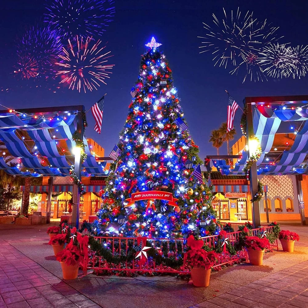 600 LED 4th of July Decorations Solar Lights, Red White and Blue Lights Outdoor Waterproof, 8 Modes Patriotic Solar String Lights for Independence Day Tree Camper Party Patio Decor SUPER LONG RED WHITE AND BLUE SOLAR LIGHTS - The solar string lights include one reel, a total of 600 LEDs with one super large battery capacity solar panel. Total Length: ft. Light Length: feet. Lead wire Length: Space between LEDs: inches. 4TH OF JULY SOLAR LIGHTS - Want to make your home more festival on the 4th of July? Then don't miss out on the red white and blue string lights. 600 premium LEDs emit all-around light, soft, and brilliant lights, wrap them in the tree, or bush, just like stars twinkling inside, and hang them on the patio to create a festival atmosphere. To add a charm to your home, make those places look very popular and catch one's eye. Happy 4th of July! 8 MODES & MEMORY FUNCTIONS - These solar string lights have 8 lighting modes(combination, in a wave, sequential, slo glo, chasing/flash, slow fade, twinkle/flash, and steady on). A built-in memory chip saves your last mode setting without having to reset the mode every day. You could press the button till the mode you like, so the lights will stay on the specified mode. WIDELY USED SOLAR PATRIOTIC LIGHTS - Our outdoor solar lights can charge during a sunny, and 8 hours of automatic work in the dark. Solar panels with ground stakes that you can place in a sunny place. The solar string light is perfect for wrapping in a tree or anywhere you want to decorate. It creates a warm, joyful and festive atmosphere for Independence Day decorative passageways, gardens, terraces, yards, lawns, fences, porches, roofs, Christmas, weddings, holidays, parties, etc. WATERPROOF AND SAFE - The outdoor solar string lights can withstand various weather (IP44), including heavy rain and snow, and are very suitable for indoor and outdoor decoration(Do not soak). No heat(The insulated copper wire keeps the lights at a low temperature so they are safe to touch after many hours of use), no radiation, low consumption, high safety.