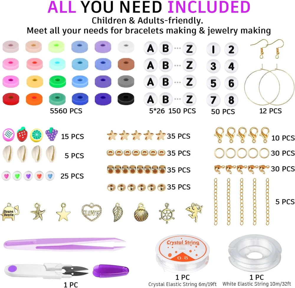 6000 Clay Beads Bracelet Making Kit, 24 Colors Flat Preppy Beads for Friendship ALL YOU NEED INCLUDED - A must for jewelry making lover. A box of about 5520pcs flat polymer clay beads in 24 colors and 550pcs charms kit( contains random letter beads, smile beads, colorful heart beads, shells, pendants, jump rings, lobster clasp, etc.), 2 roll of 5 meters elastic strings, a scissors, to meet all your needs for bracelets making & jewelry making VIBRANT COLORS - Polymer clay beads in 24 bright colors meet your requirements of colorful DIY objects. You can make bracelets with mixed polymer clay heishi beads and your favorite pendants. We prepare all you need. You can make a charm vivid bracelet/ necklace/ earring easily. Imagination is more inportant than skills here for bracelet jewelry making PREMIUM QUALITY, SAFE TO USE - Beads are made of polymer clay, strong plasticity, and durability. The diameter of clay heishi beads is 6mm with a 2mm hole and thickness is 1mm. The clay beads for bracelets are lightweight, not easy ro fade, comfortable to wear when you wear it at the beach or pool POLYMER CLAY BEADS WIDE USE - Perfect size for DIY crafts like jewelry making, bracelets, necklaces, earrings, anklets, keychains, and any ornaments. It’s an ideal gift adding some decorations for your daughter, granddaughter, sister, besties. A meaningful and cheerful gift choice for birthdays, Valentine's Day, Mother's Day, Christmas, Thanksgiving Day, etc TEEN GIRLS GIFTS TRENDY STUFF - It’s time to bring this trendy gifts home to surprise your girls. This friendship bracelets kit not only to enhances girls crafts skills but also a way to enjoy the fun of sharing and self-expression. An excellent crafts gift for girls crafts projects party 7.44 inches x 9.19 inches x 0.75 inches. Weight: 1.0 lb Age Range Description 6+ years old Style Classic Additional Features Adjustable Elastic Strings Number of Pieces 6000 Model Name Bracelet making kit Item Dimensions 9 x 7 x 0.7 inches Color Multicolor Material Type Polymer clay, plastic Theme Jewelry Size Small Age Range (Description) 6+ years old Seasons All Seasons Art Craft Kit Type Bracelet Making Kit Included Components A box of about 5520pcs flat polymer clay beads in 24 colors, 550pcs charms (contains random letter beads, smile colorful heart shells, pendants, jump rings), 2 roll 5 meters elastic strings, a scissors, and lobster clasp. Subject Character Jewelry Cartoon Character Jewelry